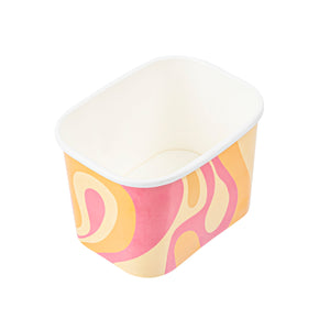Ensure your desserts stay secure with leak-resistant packaging. The Coppetta Leak-Resistant Paper To Go Cup offers a 12-ounce capacity, ideal for generous servings of ice cream or frozen yogurt. Its double-coated design ensures a leak-free experience, making it a reliable choice for cafes and dessert shops looking for a sturdy disposable ice cream cup that maintains presentation and quality. Designed to be freezer-safe, this cup helps maintain dessert freshness, while its hot food-friendly feature allows for versatile use with soups or pastas. The square shape, adorned with a vibrant tropical twist pattern, enhances presentation, offering a visually appealing addition to any dessert lineup. Measuring 4.25 inches by 3.25 inches by 2.75 inches, these paper cups are compact for easy storage and handling. Simplify your cleanup process with this recyclable and disposable solution, perfect for foodservice operations. Each order includes 200 Coppetta Leak-Resistant Paper To Go Cups.