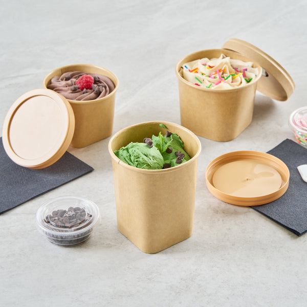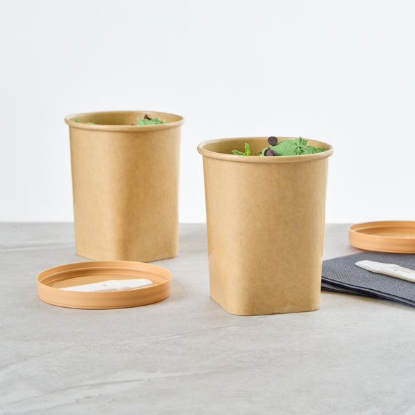 Add a touch of sophistication to your desserts with our Coppetta 13-ounce Round Kraft Paper To Go Cups. These round ice cream cups feature a grease-resistant PE lining that keeps oil from seeping through, ensuring a neat and appealing display of your culinary creations. Crafted from durable paper, these takeaway dessert cups are perfect for serving both hot and cold foods, providing versatility in your menu offerings. The recyclable convenience of these kraft paper cups makes them an eco-friendly choice for any establishment looking to minimize environmental impact. The square bottom enhances stability, ensuring the cup stays securely in place during use. With a rolled rim, these to go cups securely hold coordinating lids (SKU: RWA1752BR), making them ideal for transporting food on the go. The natural kraft finish adds a rustic charm to these disposable cups, making them perfect for serving soups, frozen yogurts, or fresh fruit salads with style. These round ice cream cups are freezer-safe, allowing you to easily refrigerate leftovers while ensuring food remains fresh. With a capacity of 13 ounces and measuring 3.39 inches in diameter by 3.94 inches in height, these cups are both practical and stylish. Sold in a 200 count box.
