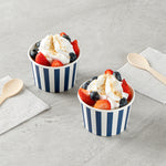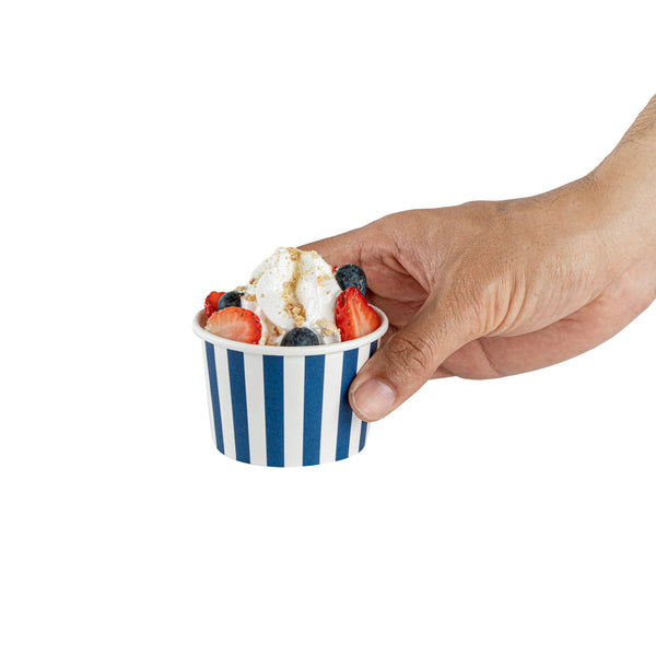 Great for serving hot or cold dishes! Crafted from thick paper, these dessert cups are durable and ideal for serving ice cream at a birthday party or warm chili at a cookoff.