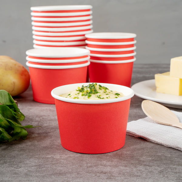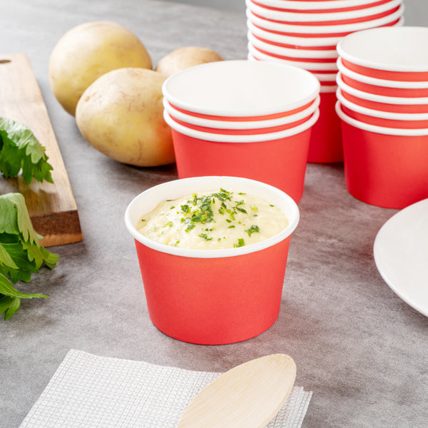 Great for serving hot or cold dishes! Crafted from thick paper, these dessert cups are durable and ideal for serving ice cream at a birthday party or warm chili at a cookoff.