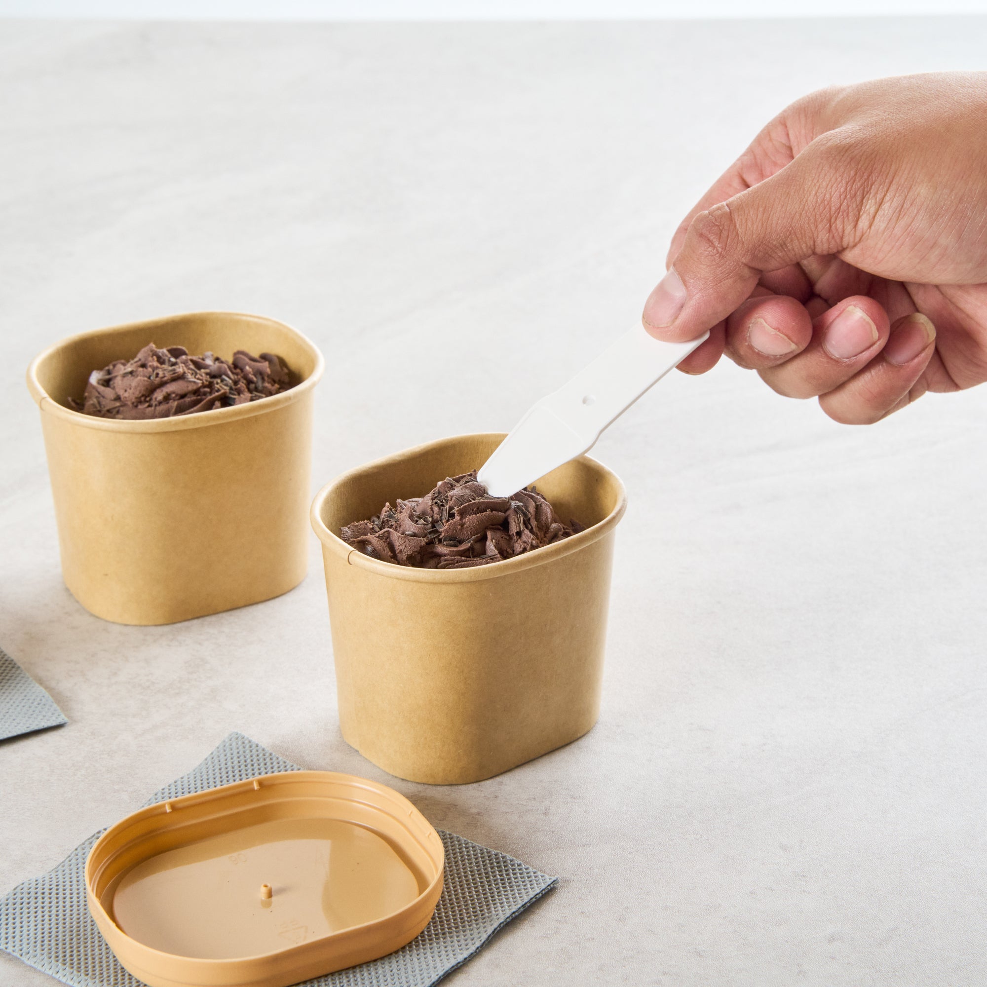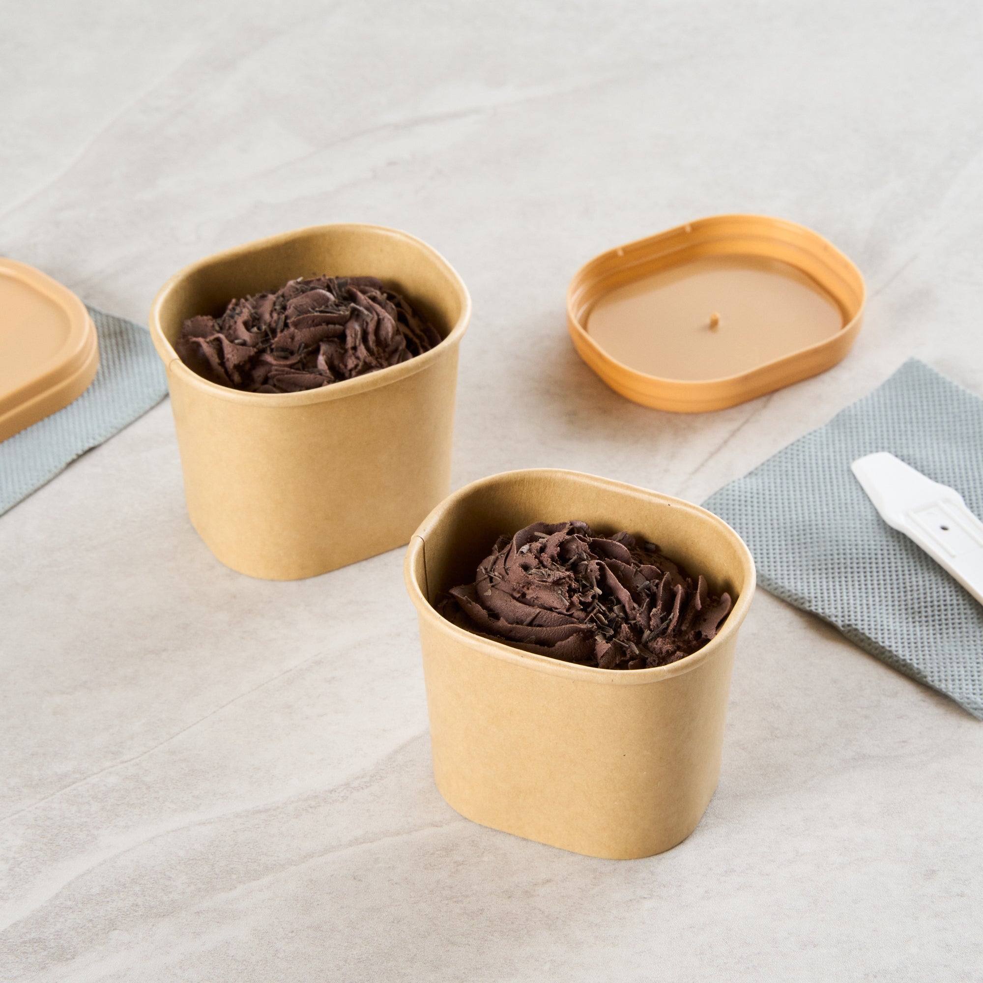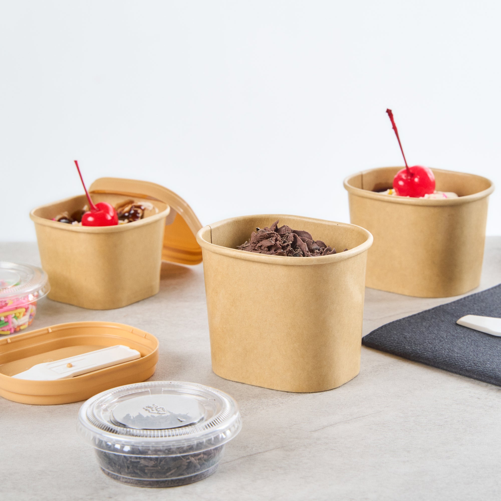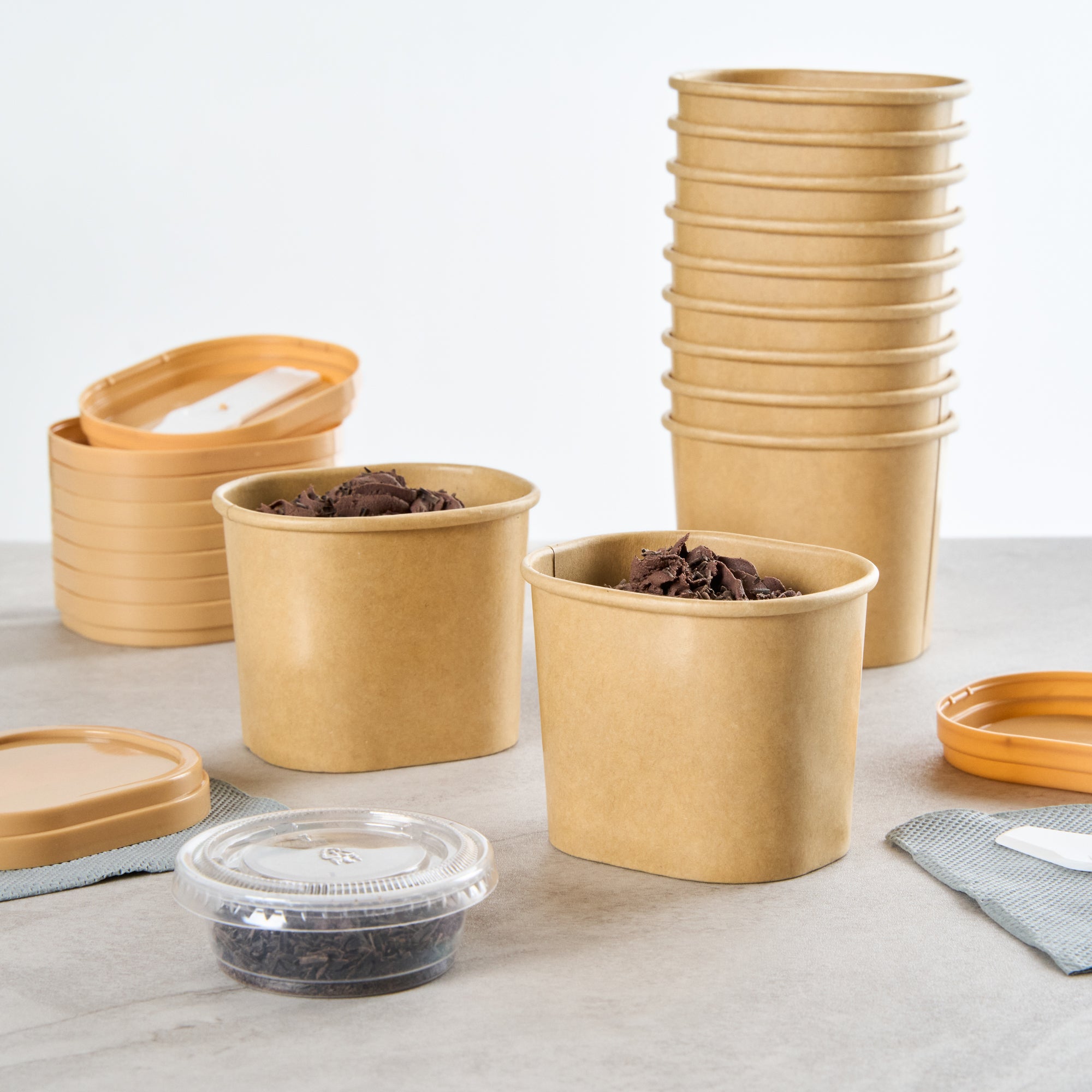 Elevate dessert moments with our Coppetta 5-ounce Square Kraft Paper To Go Cups. These square ice cream cups feature a grease-resistant PE lining to keep oil from seeping through for a neat food presentation. Made from durable paper, these takeaway dessert cups are ideal for serving both hot and cold foods. Designed with recyclability in mind, these kraft paper cups provide an eco-friendly option for your foodservice needs. A rolled rim ensures these to go cups securely hold coordinating lids (SKU: RWA1741BR) for convenient transport. Showcasing a natural kraft finish, these disposable cups add rustic charm to soups, frozen yogurts, or fresh fruit salads. Freezer-safe, these square ice cream cups allow for easy refrigeration of leftovers. With a capacity of 5.4 ounces, these kraft paper cups measure 3.03 inches in length by 2.48 inches in width by 2.36 inches in height. Sold in a 50 count box.