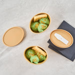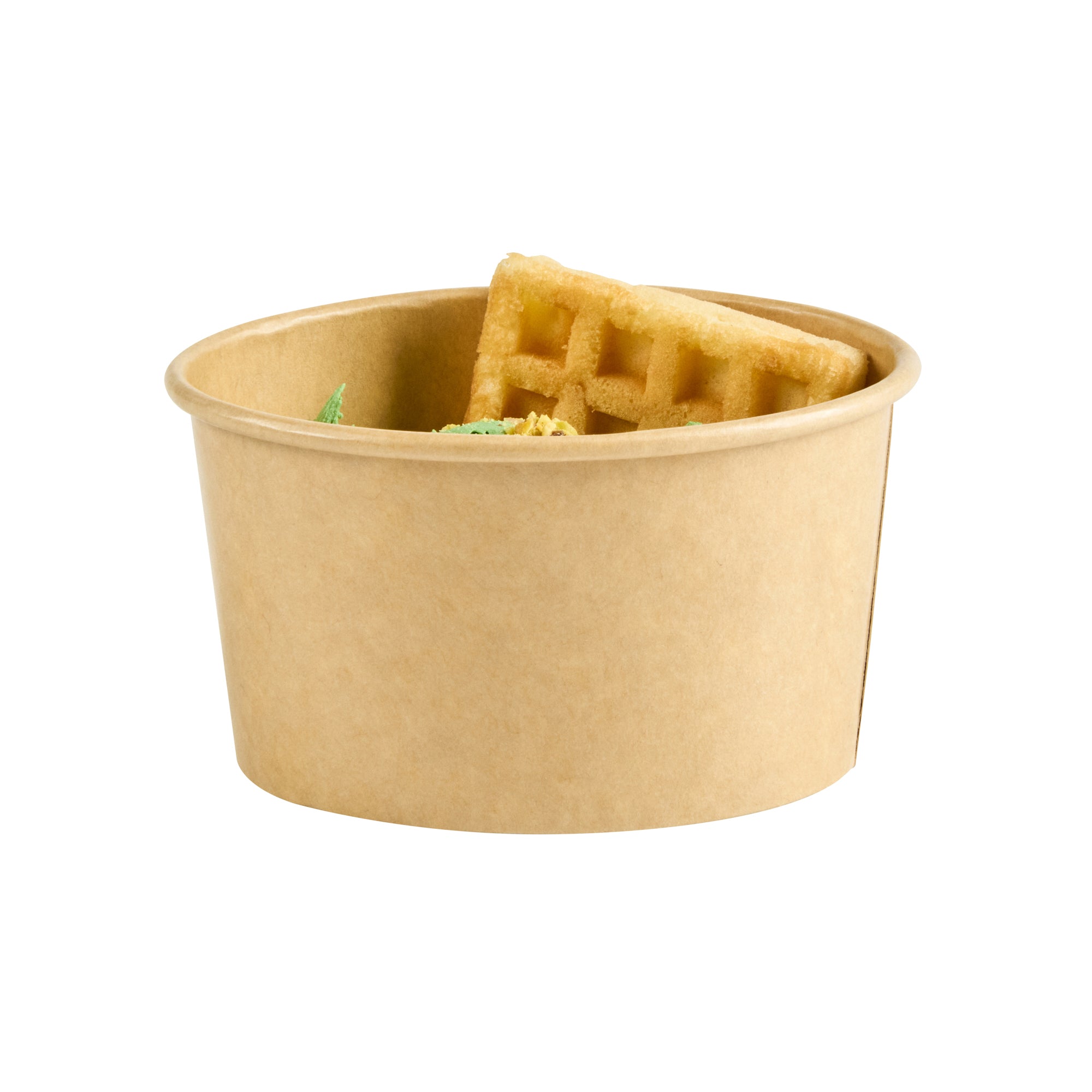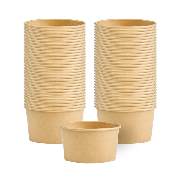 Our Coppetta 6-ounce Oval Kraft Paper To Go Cups are perfect for serving all your delicious creations with style. These oval ice cream cups feature a grease-resistant PE lining to keep oil from seeping through, ensuring a neat food presentation every time. Made from durable paper, these takeaway dessert cups are suitable for serving both hot and cold foods. For eco-friendly convenience, these kraft paper cups are recyclable, making them an ideal choice for environmentally conscious establishments. A rolled rim design on these to go cups securely holds coordinating lids (SKU: RWA1747BR), allowing you to take your food on-the-go without worry. The natural kraft finish of these disposable cups adds a rustic charm, perfect for serving soups, frozen yogurts, or fresh fruit salads. Freezer-safe, these round ice cream cups allow you to refrigerate any leftovers with ease. Each cup has a 6-ounce capacity and measures 3.86 inches in length by 2.95 inches in width by 2.13 inches in height. Sold in a 50 count box.