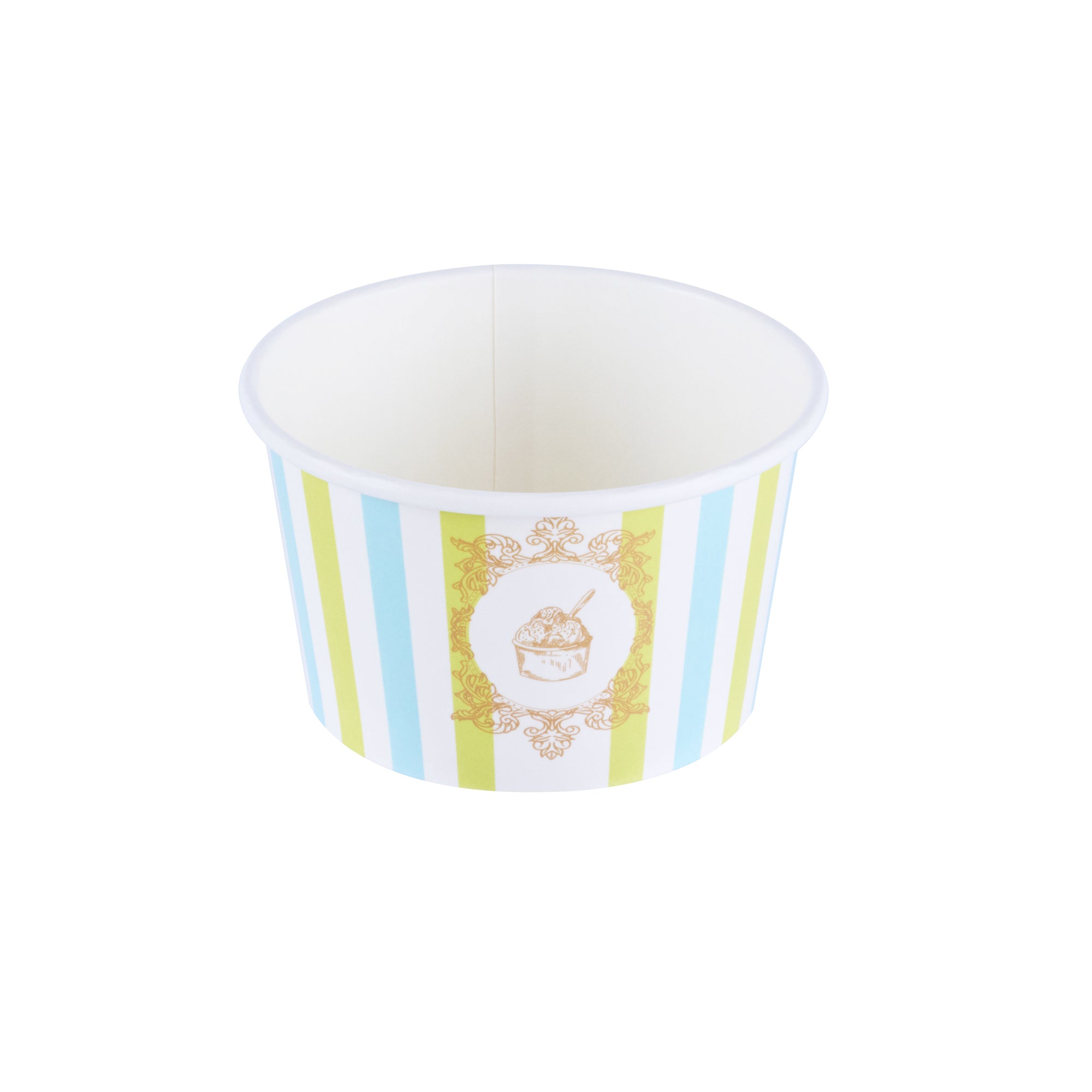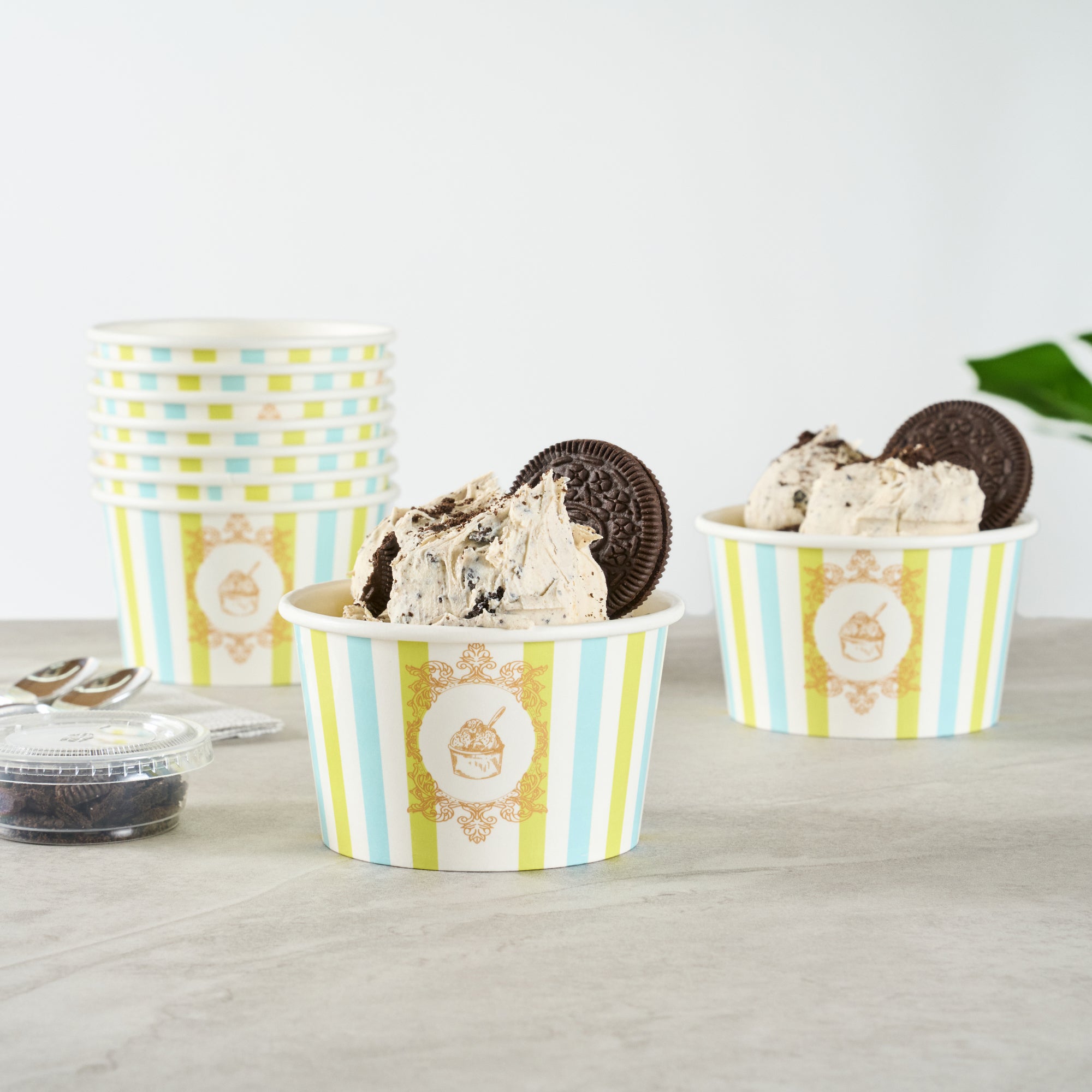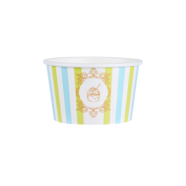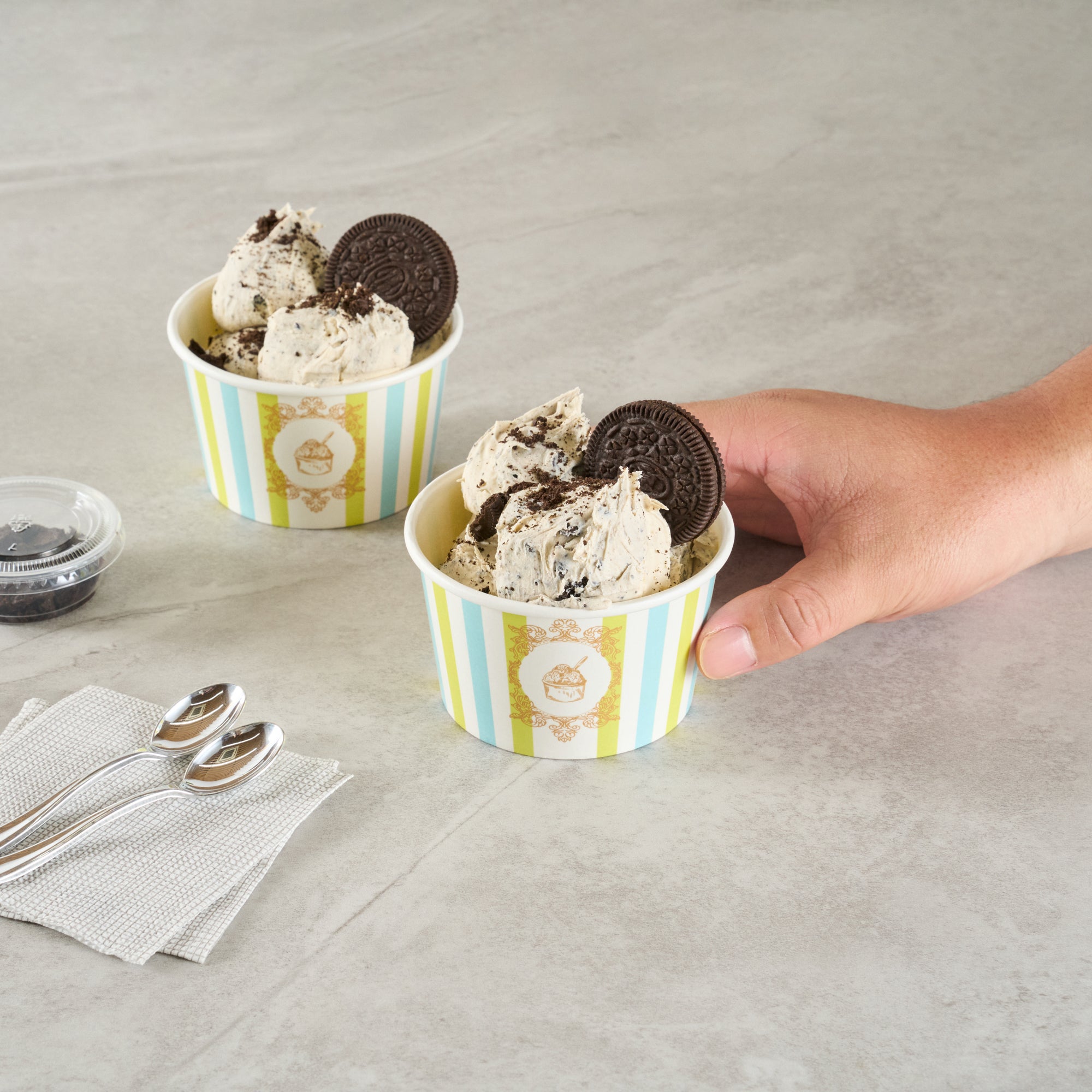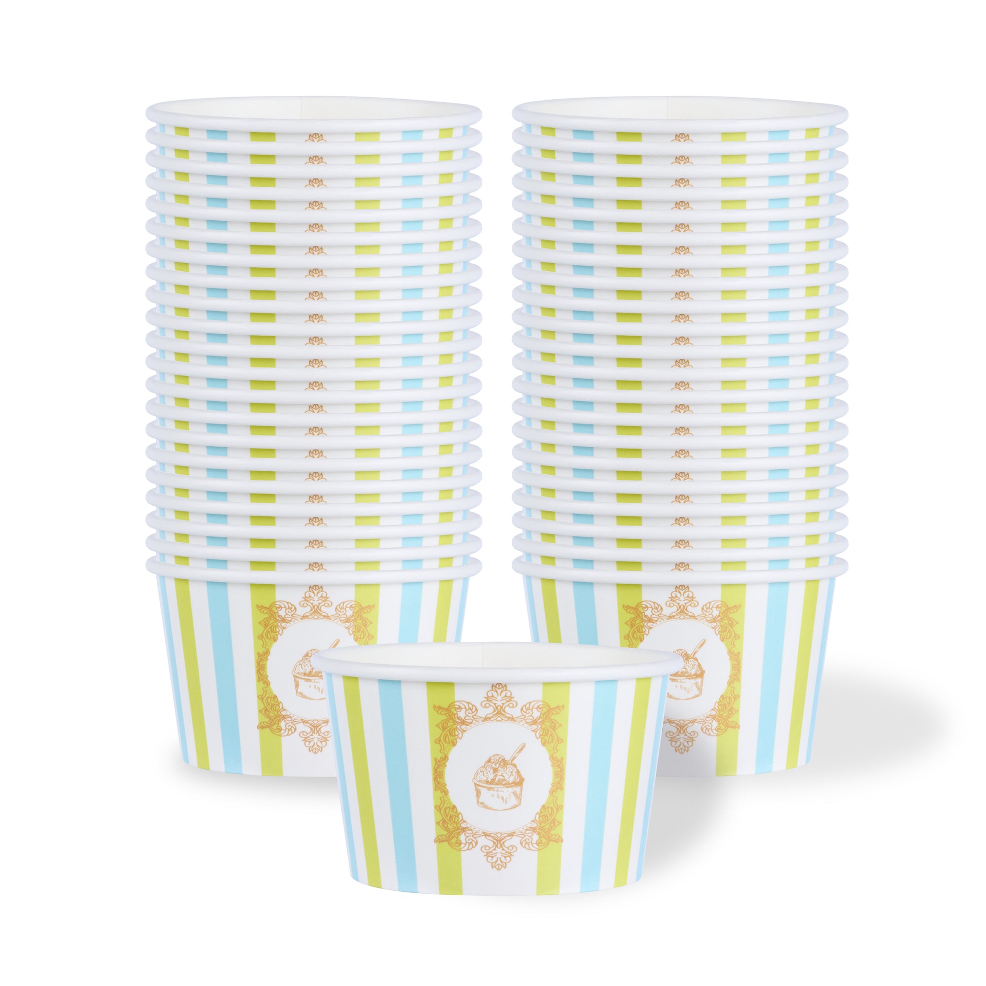 Prevent dessert disasters with leak-resistant ice cream cups. Coppetta Leak-Resistant Ice Cream Cups feature a sturdy double-coated design that prevents liquid leakage, ensuring mess-free service and satisfied customers. With an 8-ounce capacity, these frozen yogurt cups are perfect for serving moderate portions of ice cream, frozen yogurt, or other delicious desserts. The grease-resistant coating makes them ideal for oily snacks and treats, maintaining their structural integrity for a reliable dining experience. Constructed from durable paper, these cups provide sturdy support for both hot and cold foods, expanding your menu options to include items like macaroni and soup. The blue and green stripe design enhances visual appeal, making desserts more attractive and inviting to customers. Streamline your operations with these disposable and recyclable ice cream cups, simplifying cleanup while supporting eco-friendly practices. Each order includes 50 Coppetta Leak-Resistant Ice Cream Cups.
