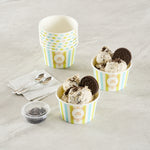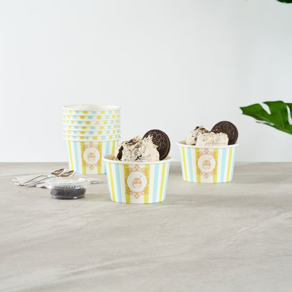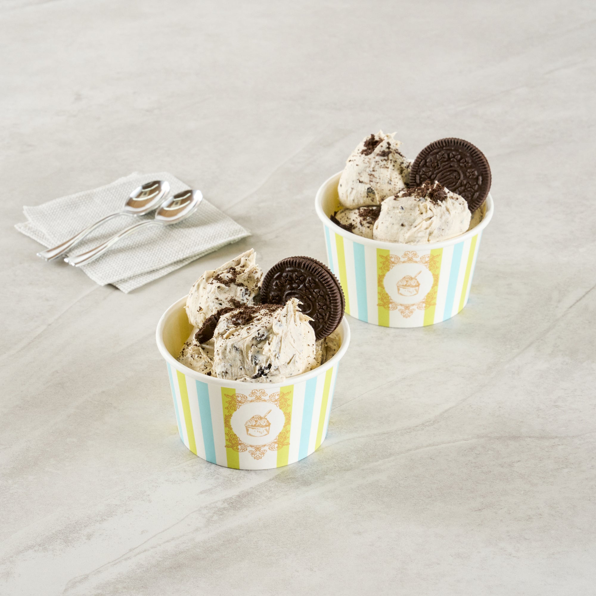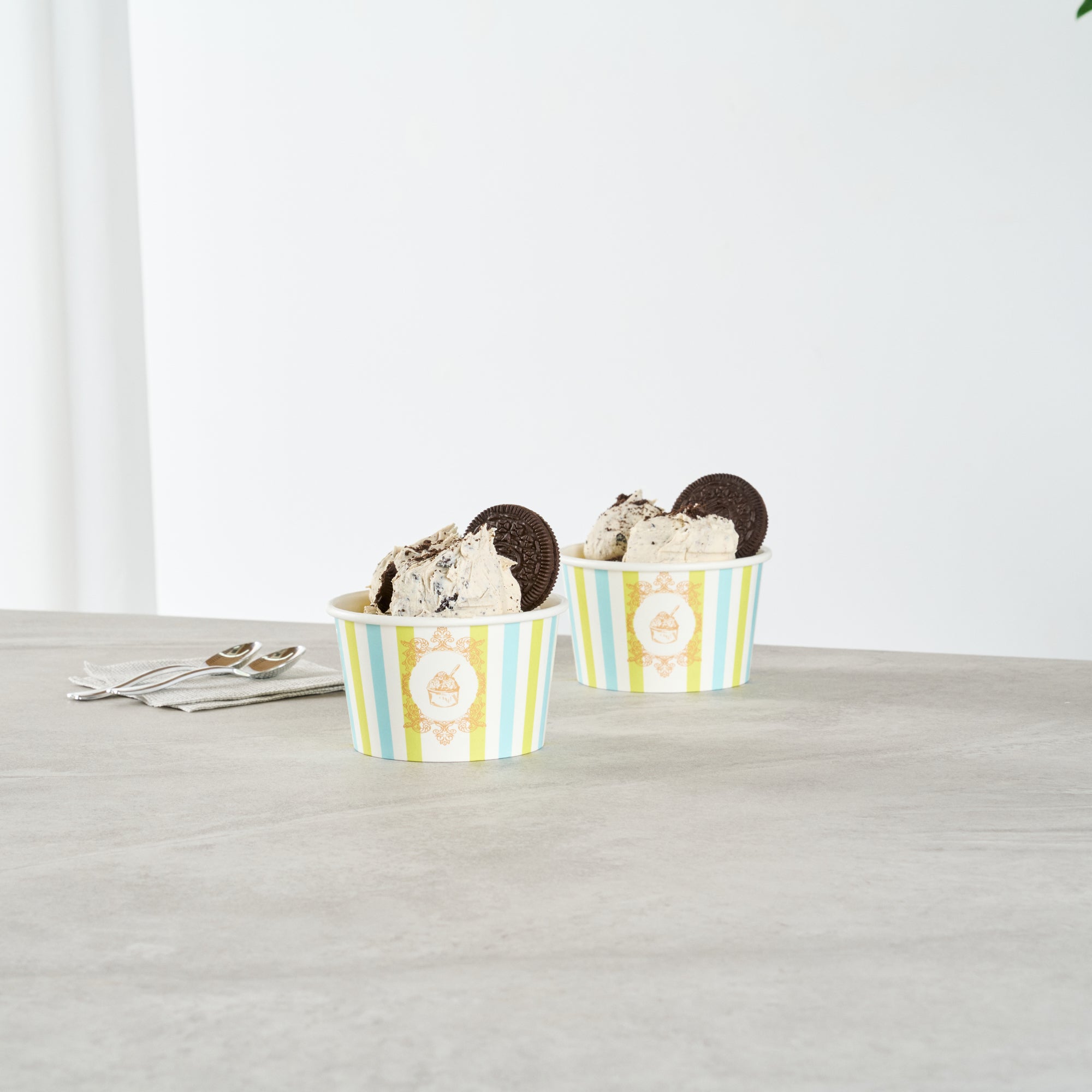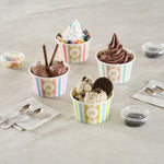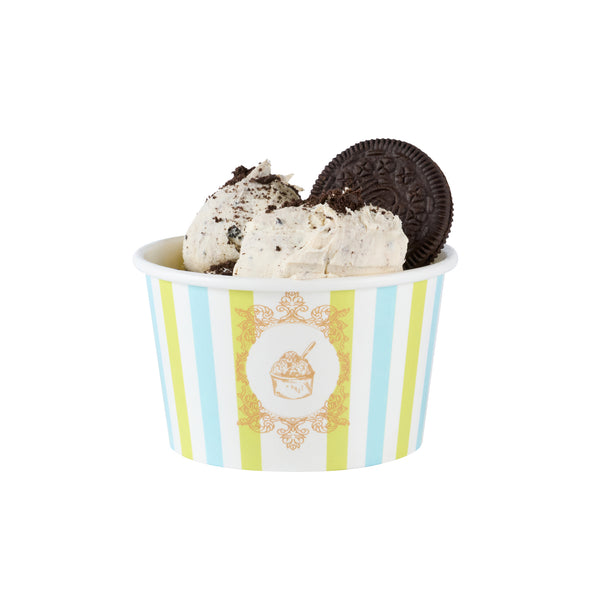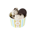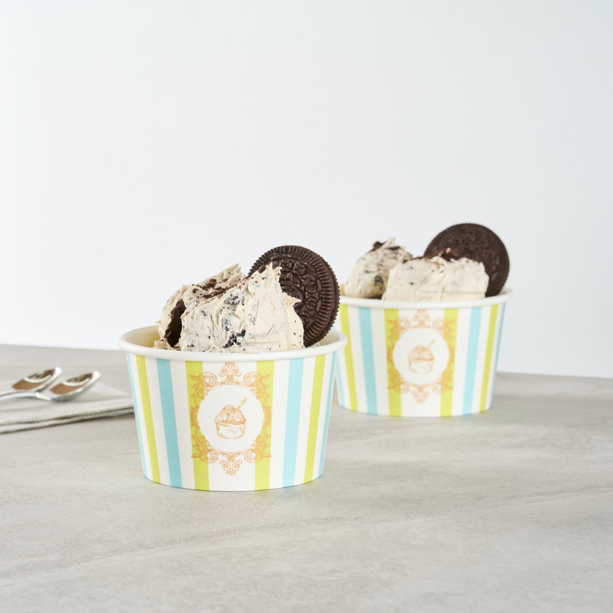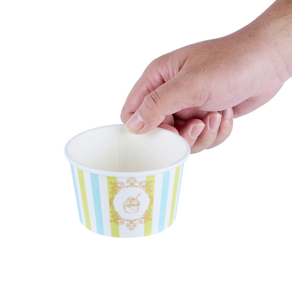 Prevent dessert disasters with leak-resistant ice cream cups. Coppetta Leak-Resistant Ice Cream Cups feature a sturdy double-coated design that prevents liquid leakage, ensuring mess-free service and satisfied customers. With an 8-ounce capacity, these frozen yogurt cups are perfect for serving moderate portions of ice cream, frozen yogurt, or other delicious desserts. The grease-resistant coating makes them ideal for oily snacks and treats, maintaining their structural integrity for a reliable dining experience. Constructed from durable paper, these cups provide sturdy support for both hot and cold foods, expanding your menu options to include items like macaroni and soup. The blue and green stripe design enhances visual appeal, making desserts more attractive and inviting to customers. Streamline your operations with these disposable and recyclable ice cream cups, simplifying cleanup while supporting eco-friendly practices. Each order includes 50 Coppetta Leak-Resistant Ice Cream Cups.
