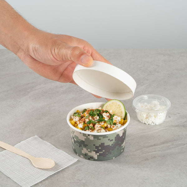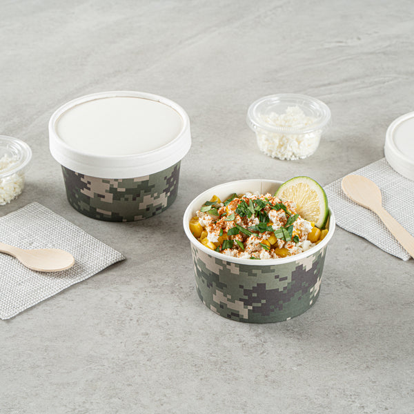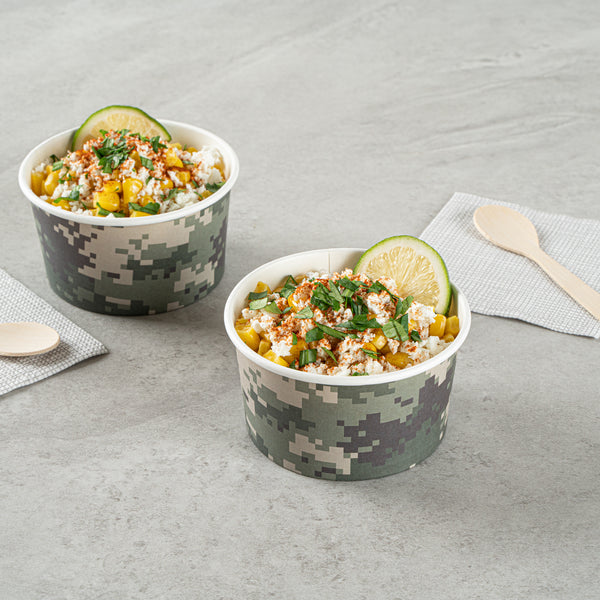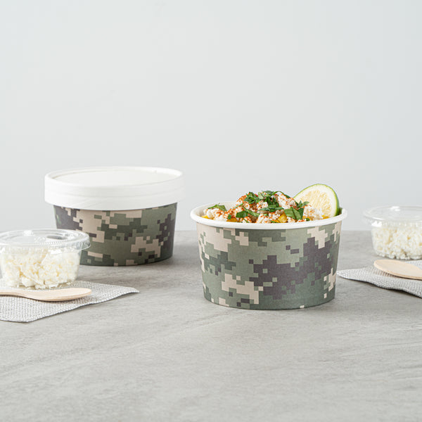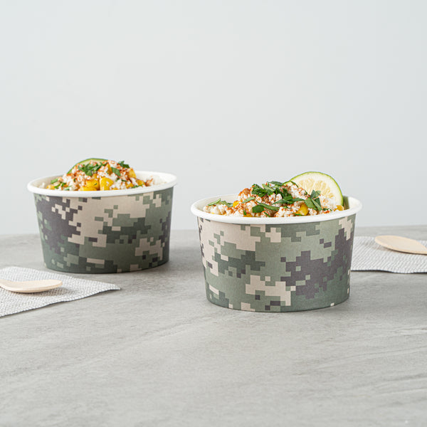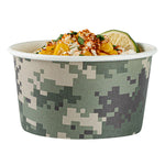 Unleash your taste buds as you enjoy ice cream using our Coppetta 8-ounce Round Camouflage Paper To Go Cups. The rolled rim of these takeaway dessert cups forms a snug seal with coordinating lids (SKU: RWA0292C-50) and makes your treats easily portable. Crafted from premium paper, these round ice cream cups are suitable for serving various hot and cold food items. The grease-resistant PE lining of these frozen yogurt paper cups prevents oil or grease from soaking through, assuring a clean and delicious indulgence. With a camouflage print, these premium paper frozen dessert cups capture customers' attention and make their experience memorable. To store your leftovers, these 8-ounce cups are freezer-safe and let you refrigerate them. These disposable dessert cups are recyclable and help reduce your carbon footprint. Measuring 3.7 inches in diameter by 2.2 inches tall, these cups for ice cream take up minimal space while holding 8 ounces of your favorite dessert. Sold in a 50 count box. Lids are available and sold separately.