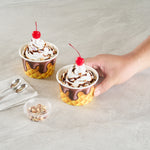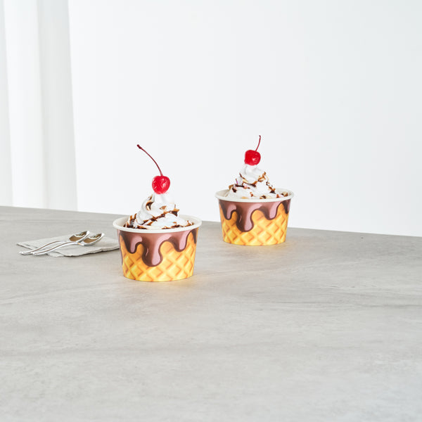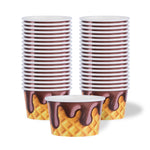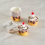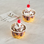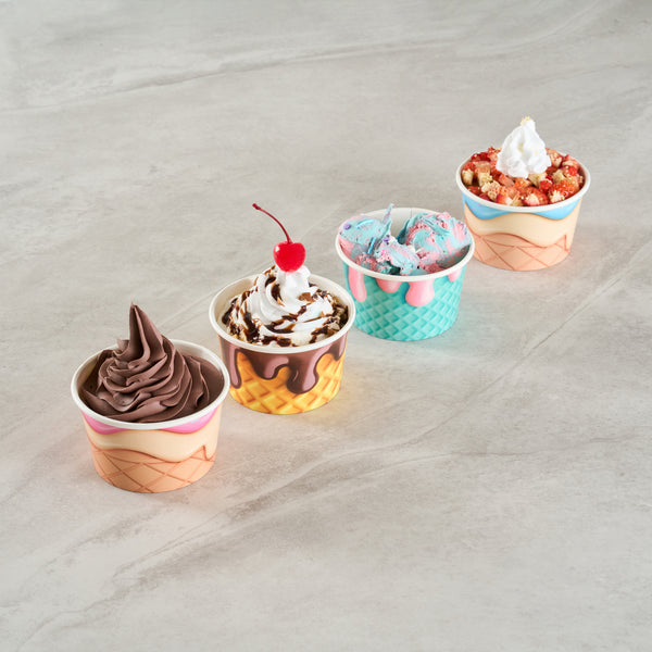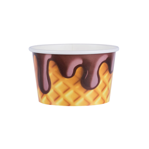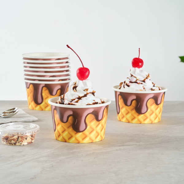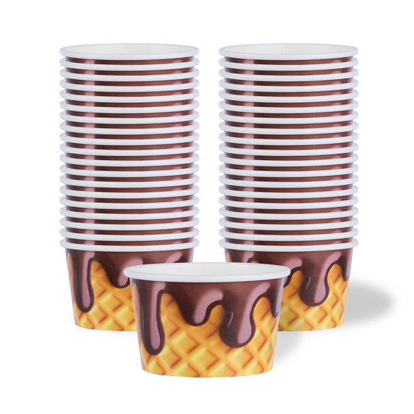 Reduce spills with leak-resistant ice cream cups. The Coppetta Leak-Resistant Paper Ice Cream Cup in vibrant yellow is expertly designed with a double-coated structure to prevent liquid leakage, ensuring a mess-free experience with every use. These disposable ice cream cups boast a sturdy paper build, making them ideal for serving both cold treats like ice cream sundaes and hot dishes such as soups, providing versatility for foodservice operations. Additionally, their 8-ounce capacity is perfect for moderate portions, whether you're serving frozen yogurt or hot snacks. Made from recyclable materials, these cups support eco-friendly practices, appealing to environmentally-conscious businesses. With a height of 2.28 inches, they fit seamlessly into any kitchen setup, aiding in efficient service during peak times. Elevate your offerings and streamline operations with these reliable paper dessert cups. Each order includes 50 Coppetta Leak-Resistant Paper Ice Cream Cups.