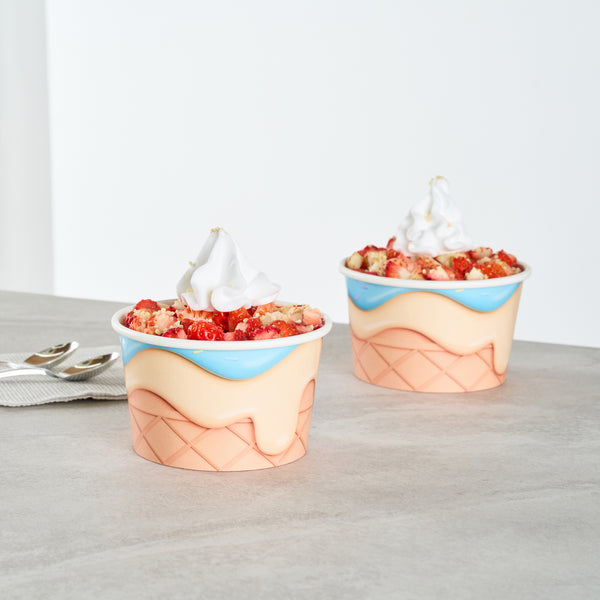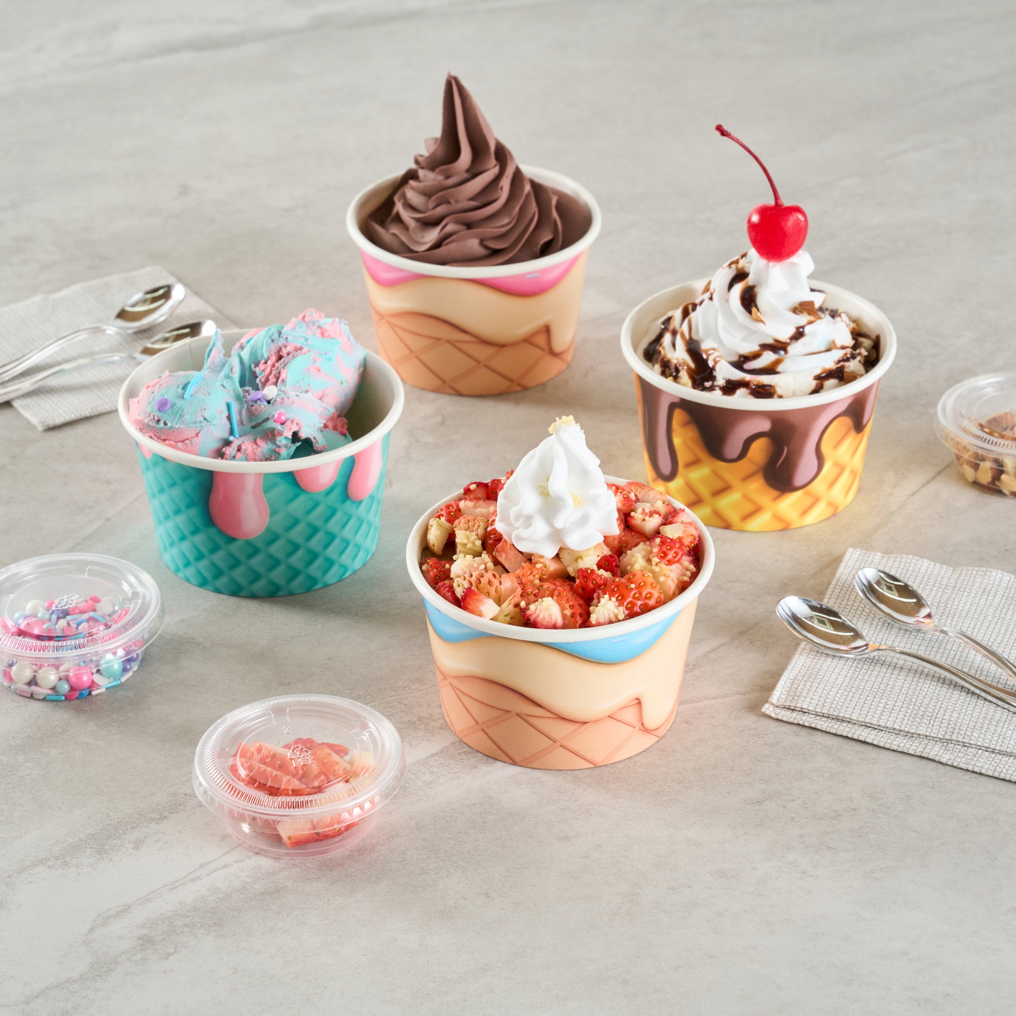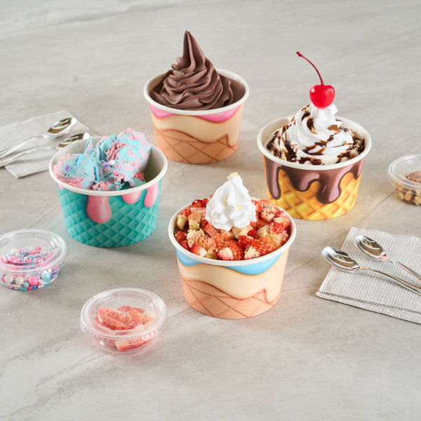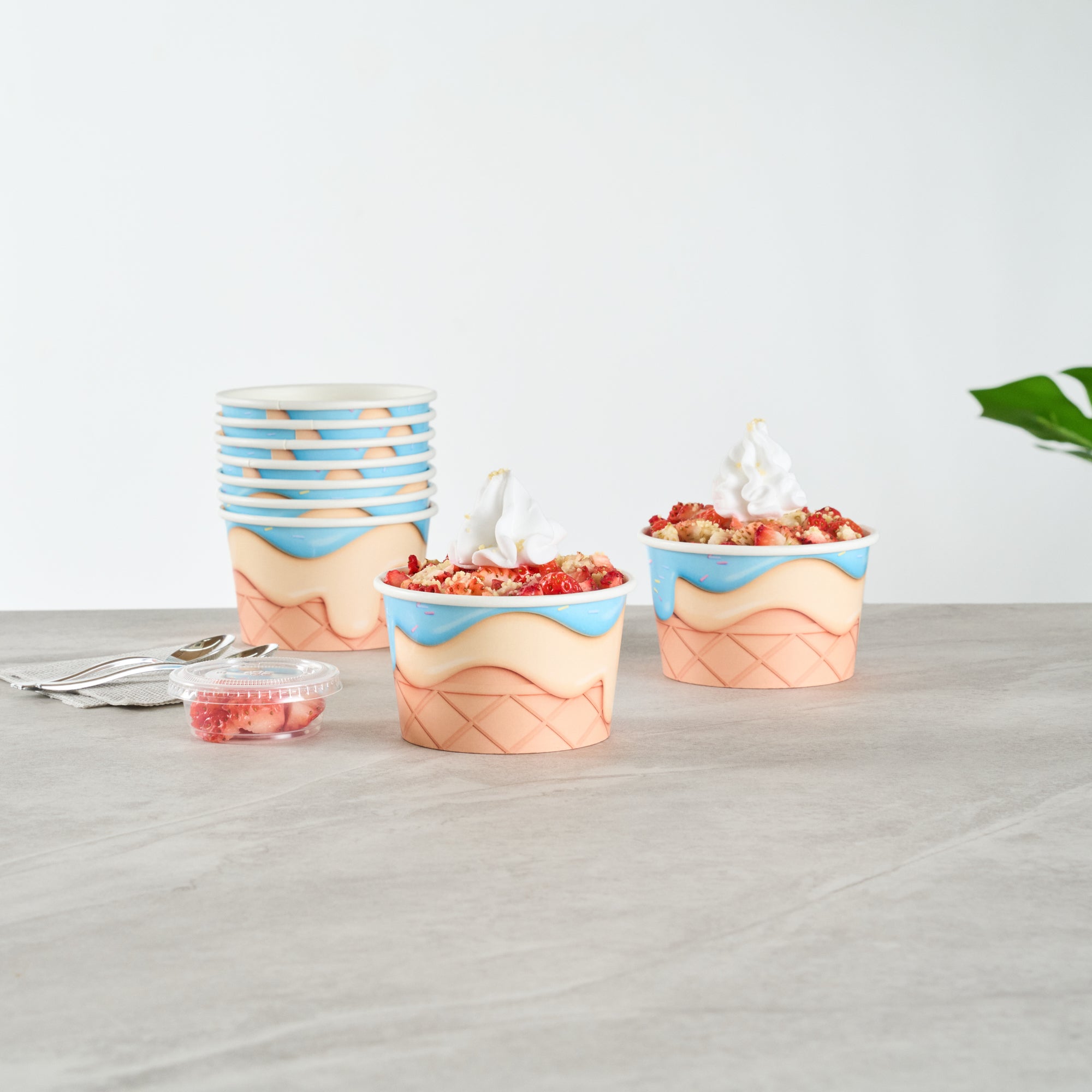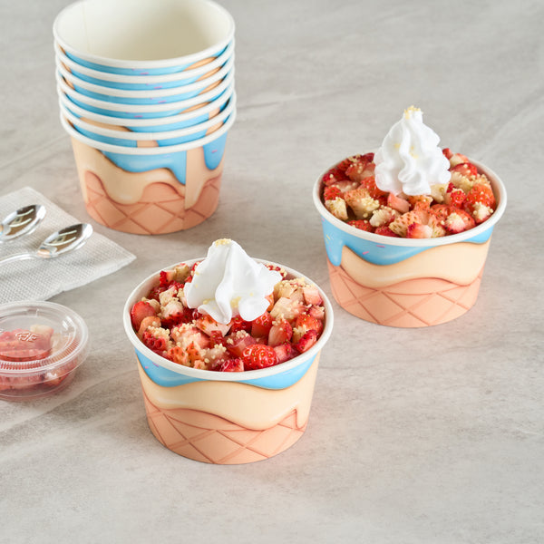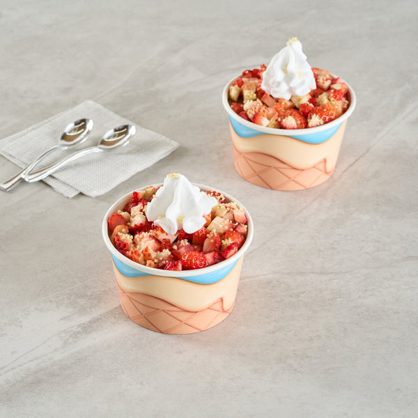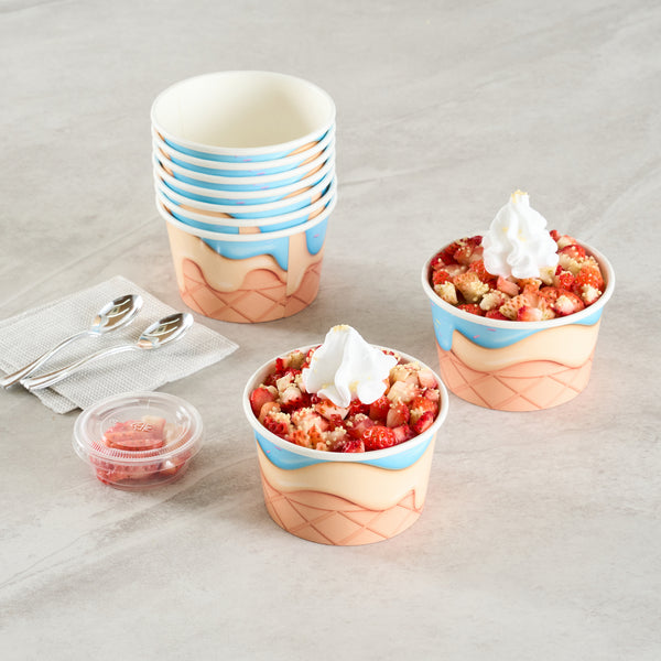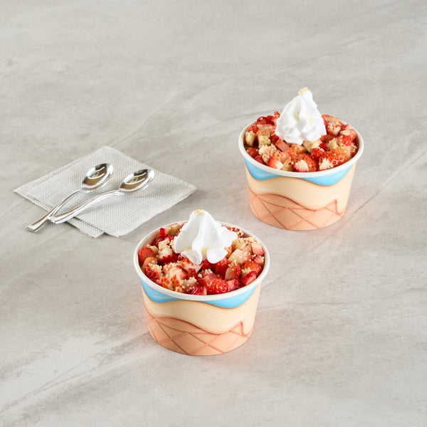 Prevent spills with our versatile hot and cold food cup. The Coppetta Leak-Resistant Disposable Ice Cream Cup boasts a double coated design that effectively prevents liquid leakage, making it an ideal choice for busy foodservice environments. Crafted from sturdy paper and measuring 3.82 inches in length, this recyclable cup is cold food friendly, perfect for serving ice cream and frozen yogurt without compromising on texture. Its ability to handle both hot and cold dishes means you can use it as a frozen yogurt cup or for serving soups and macaroni without worrying about leaks. Additionally, its grease-resistant coating ensures that even the oiliest snacks are contained, maintaining a clean and professional appearance. Enhance your foodservice operations by choosing a reliable disposable ice cream cup that meets all your serving needs. Each order includes 50 Coppetta Leak-Resistant Disposable Ice Cream Cups.