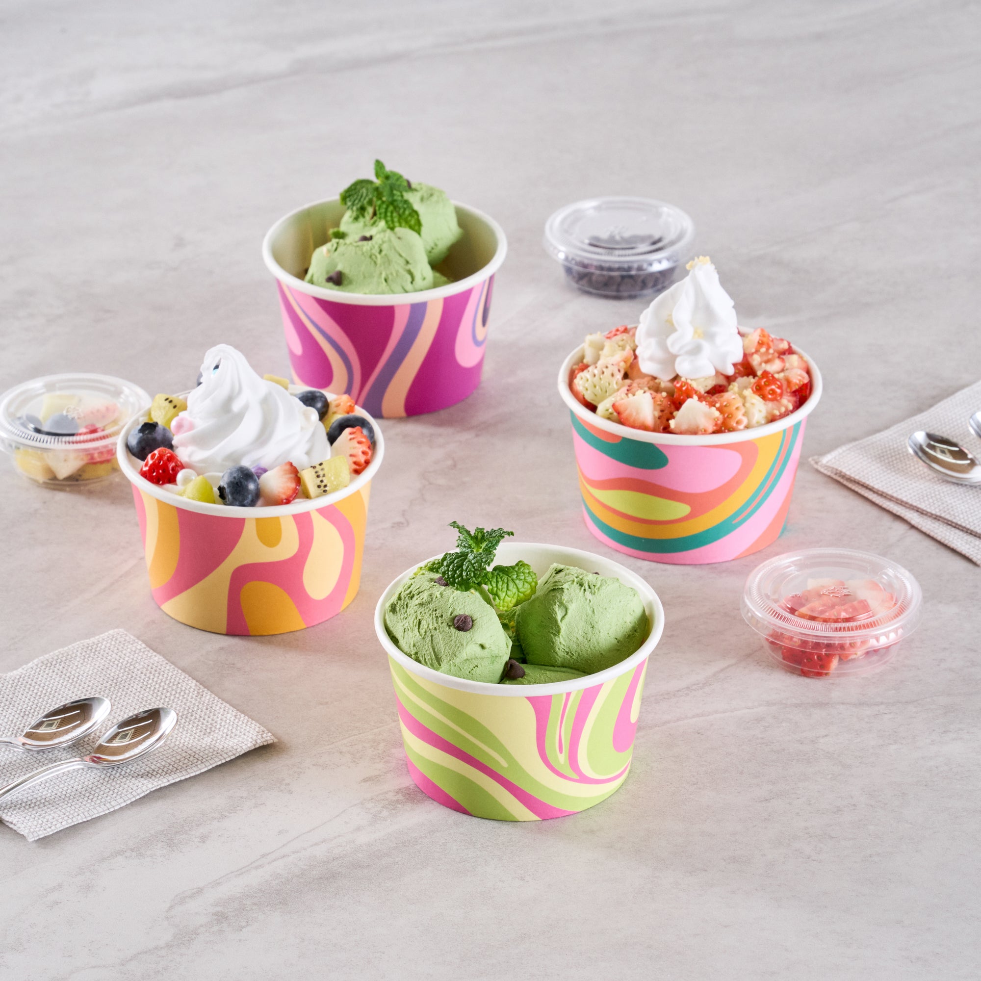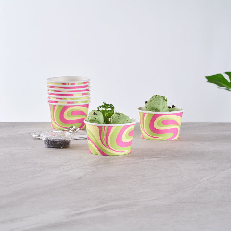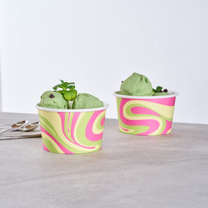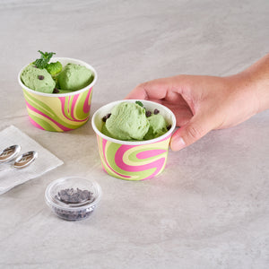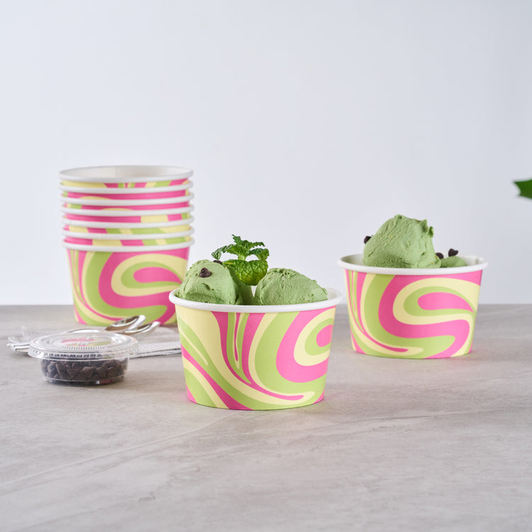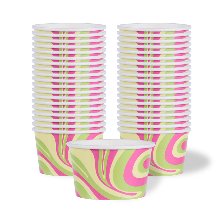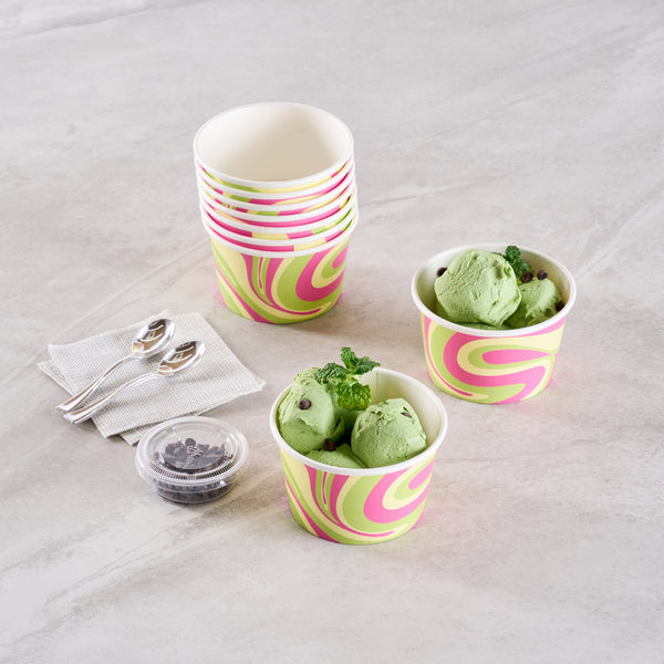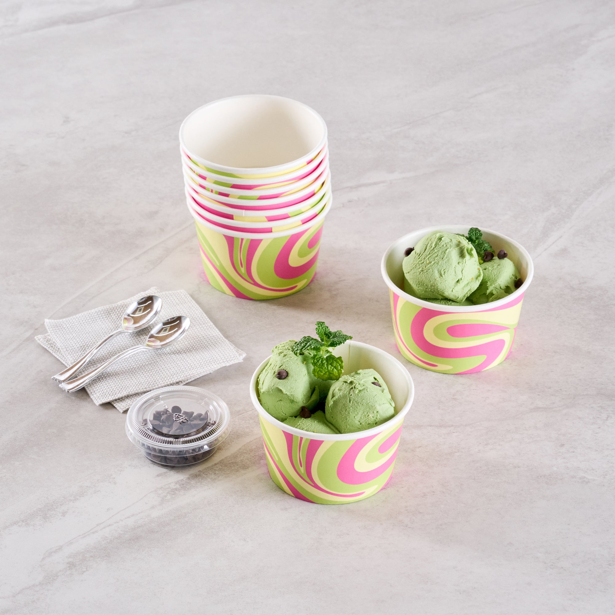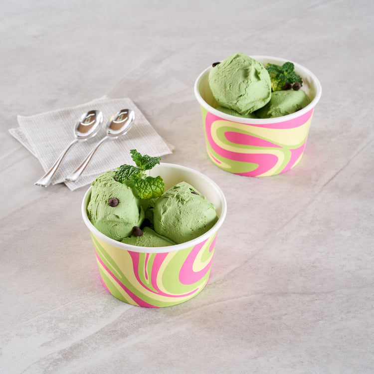 Prevent leaks and elevate your presentation with these versatile containers. Coppetta Leak-Resistant Paper Ice Cream Cups are expertly crafted with a double-coated design to prevent liquid leakage, ensuring clean and seamless serving. These paper ice cream cups are sturdy and durable, featuring a waterproof coating that accommodates both cold and hot dishes, making them ideal for diverse menu options. Whether you're serving frozen delights or savory soups, these disposable dessert cups are grease-resistant, maintaining their integrity when filled with snacks and cakes. Designed with a vibrant green hue and measuring 3.82 inches in diameter, these cups provide an inviting presentation that complements any table setting. Constructed from recyclable paper, they offer an eco-conscious choice that aligns with sustainability goals. Enhance your foodservice operations with reliable and attractive soup paper bowls that deliver exceptional performance. Each order includes 50 Coppetta Leak-Resistant Paper Ice Cream Cups.