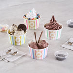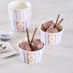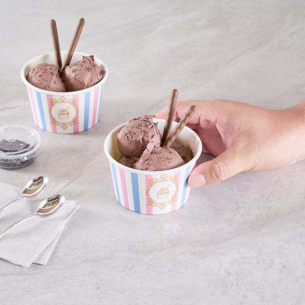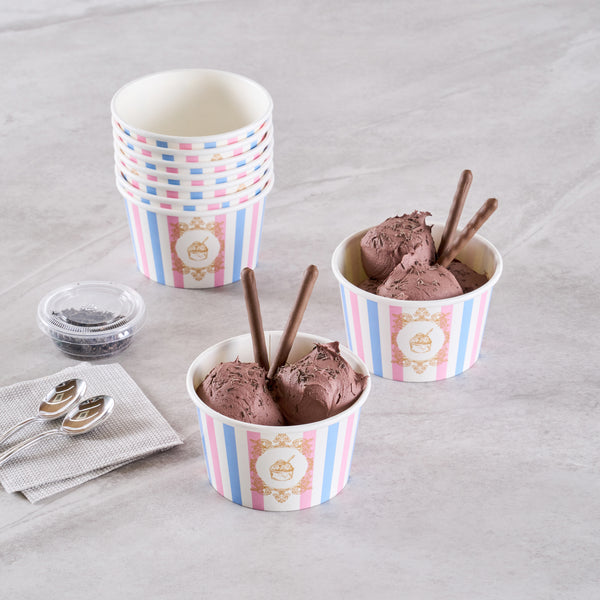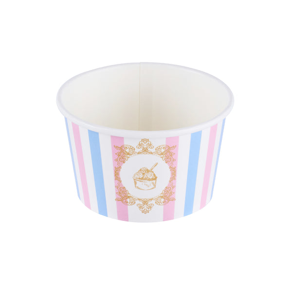Elevate your food presentation with our Coppetta 8-ounce Round Pink And Blue Stripe Paper To Go Cups. These round ice cream cups feature a grease-resistant PE lining to keep oil from seeping through, ensuring a neat food presentation. Constructed from durable paper, these takeaway dessert cups are perfect for serving both hot and cold foods. For an eco-friendly option, these frozen yogurt paper cups are recyclable, allowing you to serve and present food sustainably. With a rolled rim, these to go cups securely hold coordinating lids (SKU: RWP1769W-50) for convenient transportation. The pink and blue stripe design of these disposable cups offers an upscale appearance to your food presentation. Additionally, these round ice cream cups are freezer-safe, providing the option to refrigerate leftovers. Measuring 3.82 inches in diameter by 2.28 inches in height, these takeaway dessert cups have a total capacity of 8 ounces. Sold in a 50 count box.