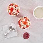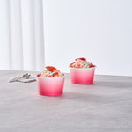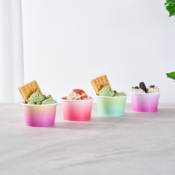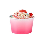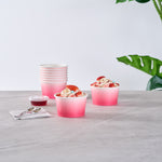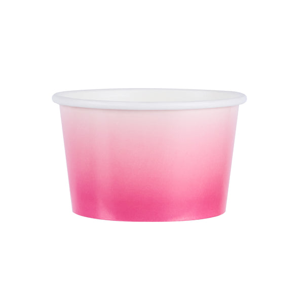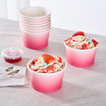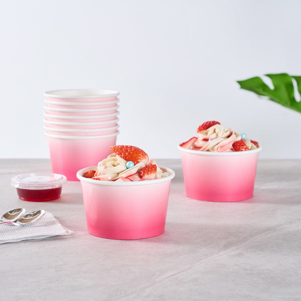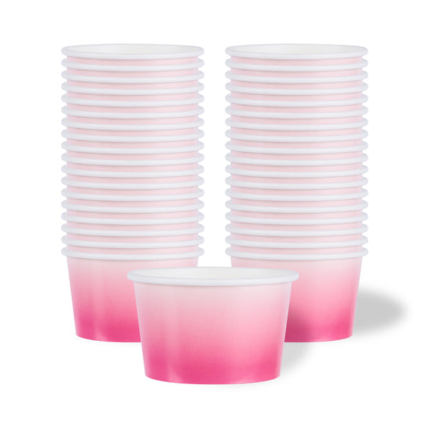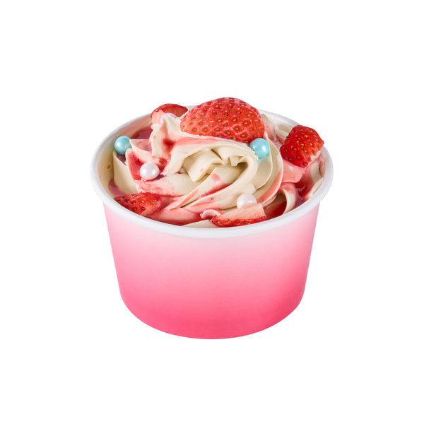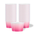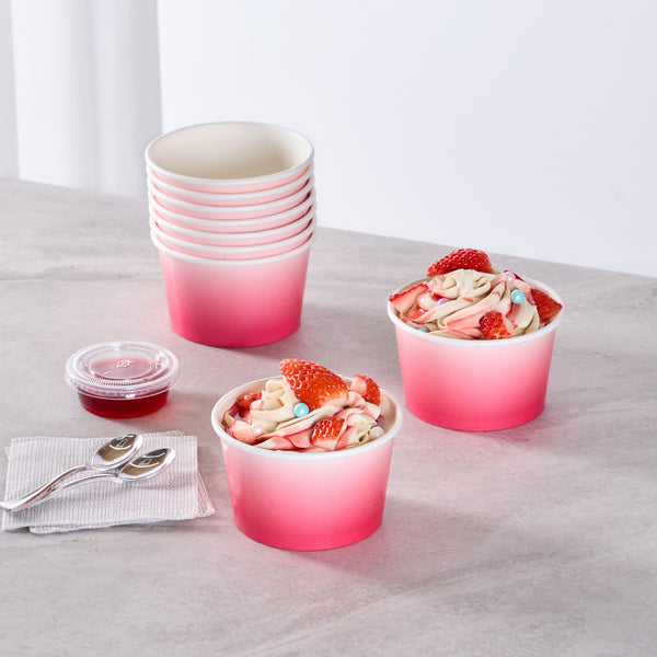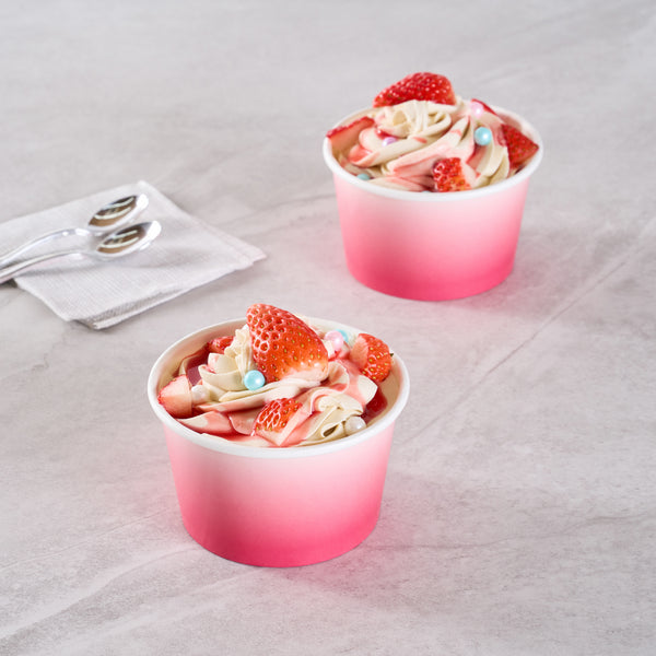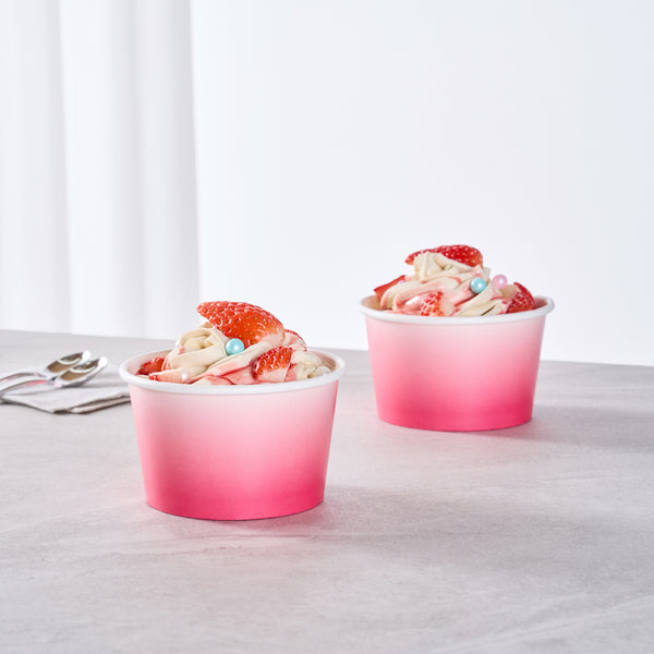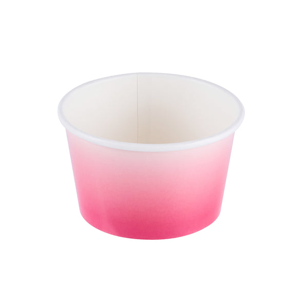 Simplify dessert serving with our Coppetta 8-ounce Round Pink And White Ombre Paper To Go Cups. These round ice cream cups feature a grease-resistant PE lining to prevent oil from seeping through, ensuring a neat and appealing presentation. Constructed from durable paper, these takeaway dessert cups are perfect for serving both hot and cold foods. The recyclable convenience of these frozen yogurt paper cups provides an eco-friendly solution for your foodservice needs. Designed with a rolled rim, these to go cups securely hold coordinating lids (SKU: RWP1769W-50) for easy transportation. The stylish pink and white ombre design of these disposable cups adds an upscale touch to your food presentation. Freezer-safe, these round ice cream cups allow you to store leftovers effortlessly. With a capacity of 8 ounces, these to go cups measure 3.82 inches in diameter by 2.28 inches in height. Sold in a 50 count box.