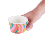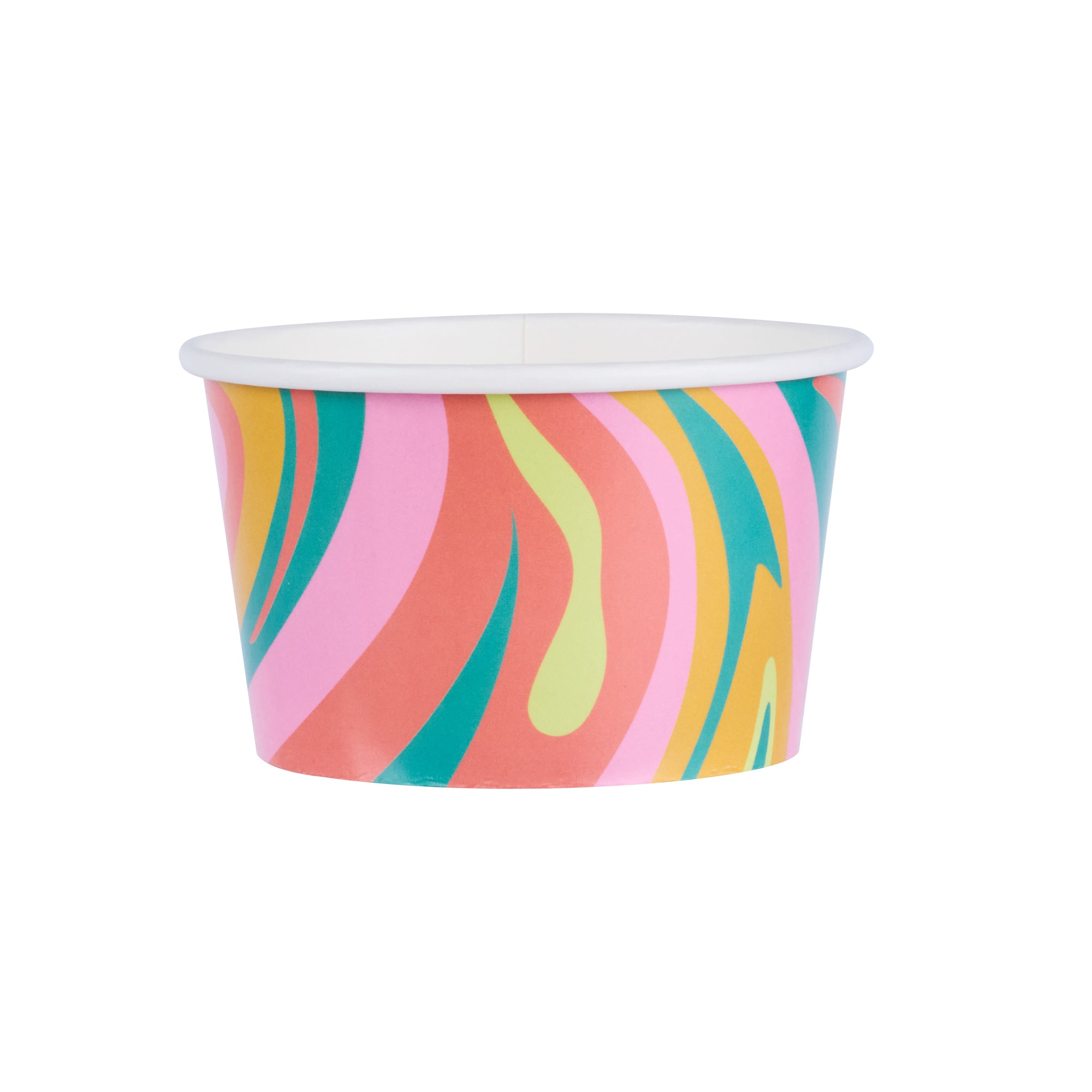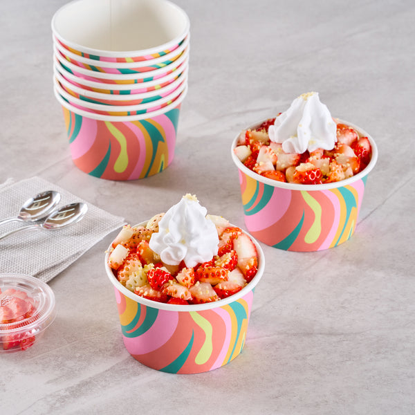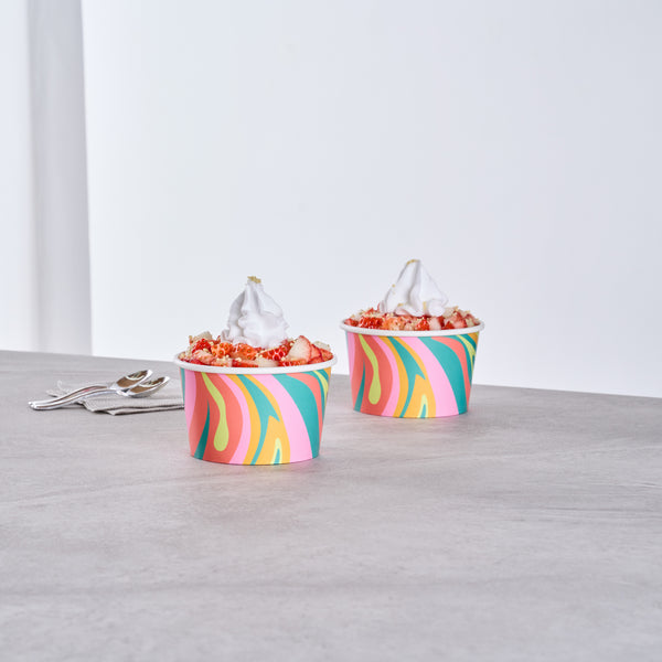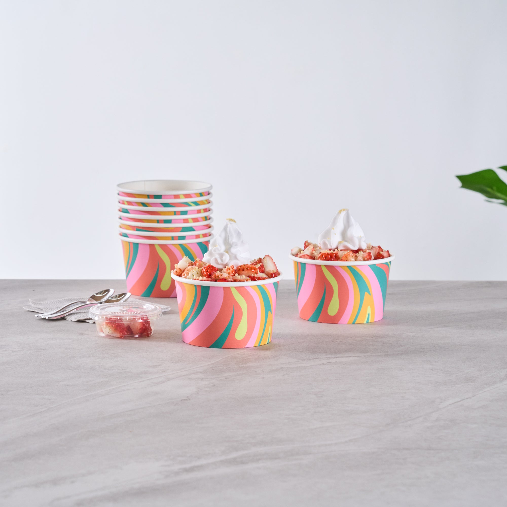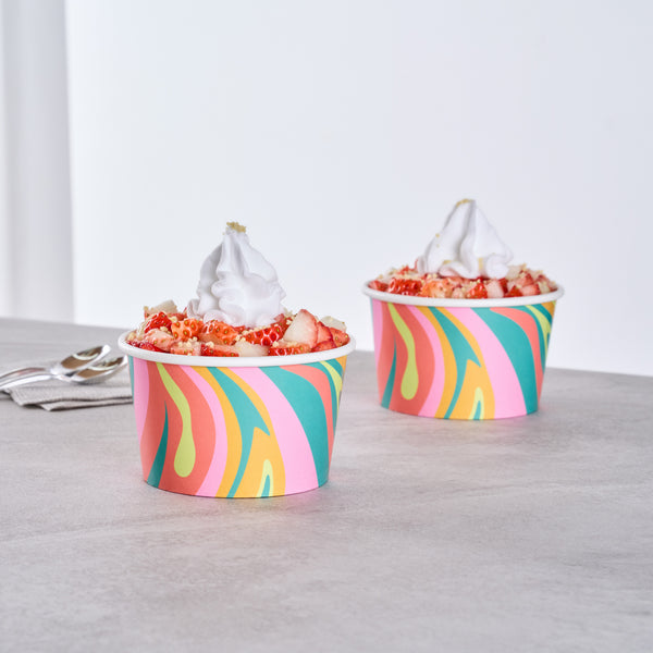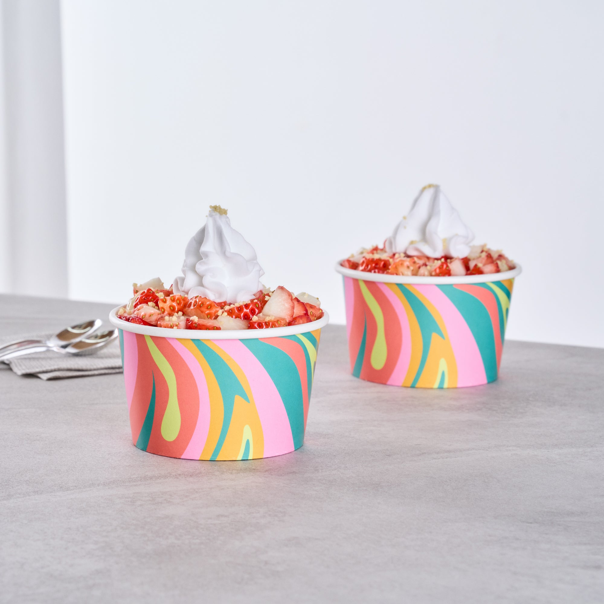 Add flair to your sweets with our Coppetta 8-ounce Round Psychedelic Sunrise Paper To Go Cups, designed to impress and perform. These takeaway dessert cups feature a grease-resistant PE lining to ensure oil and sauces stay inside, maintaining a clean and appetizing look. Constructed from durable paper, these to go cups are perfect for serving both hot and cold foods, giving you versatile options for your menu. Embrace eco-friendly practices with these recyclable frozen yogurt paper cups, making sustainability easy for your business. With a sturdy rolled rim, these disposable cups securely hold coordinating lids (SKU: RWP1769W), allowing customers to take their meals on-the-go without worry. The captivating psychedelic sunrise design on these round ice cream cups adds an upscale touch to your foodservice presentation, enticing customers with every glance. Ideal for storage, these freezer-safe frozen dessert cups keep your treats perfectly preserved. Measuring 3.82 inches in diameter by 2.28 inches in height, these cups boast an 8-ounce capacity to accommodate a variety of delicious offerings. Sold in a 200 count box.
