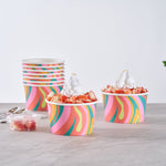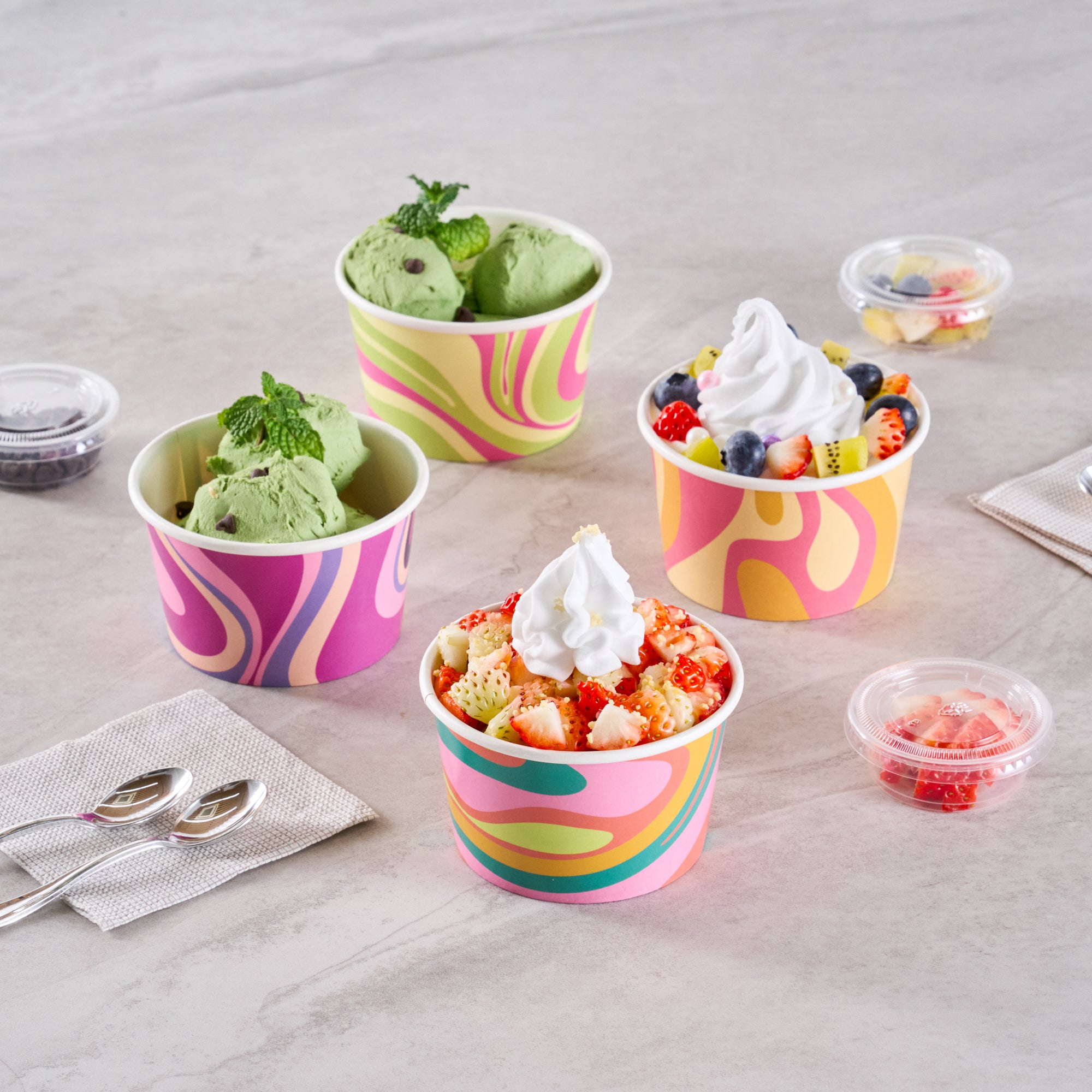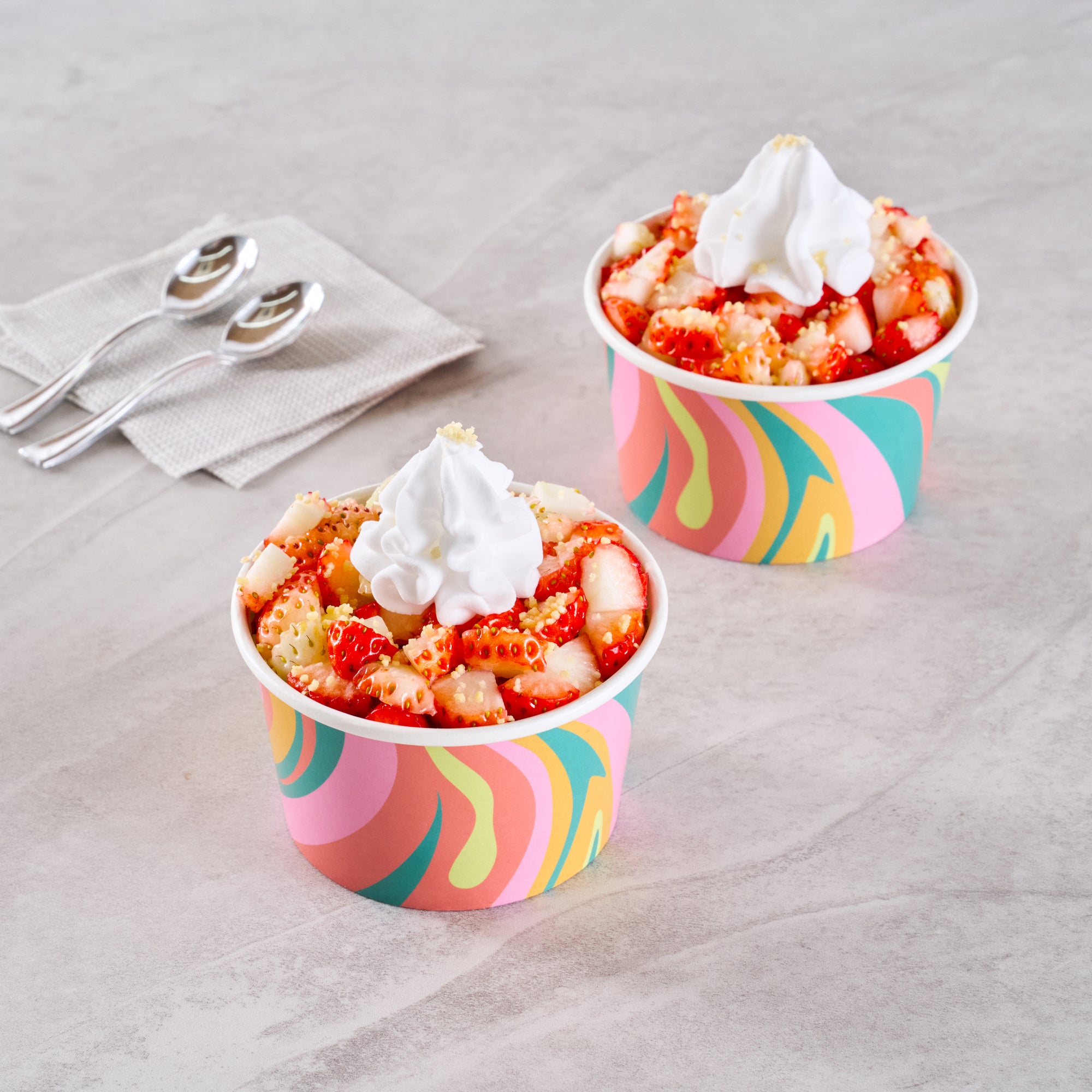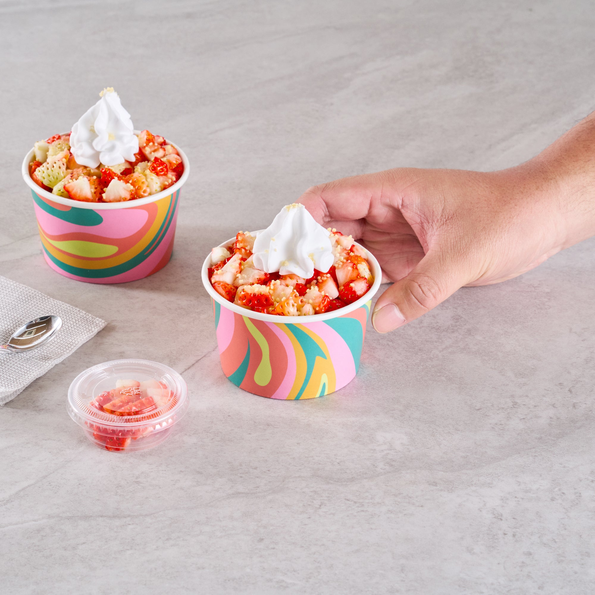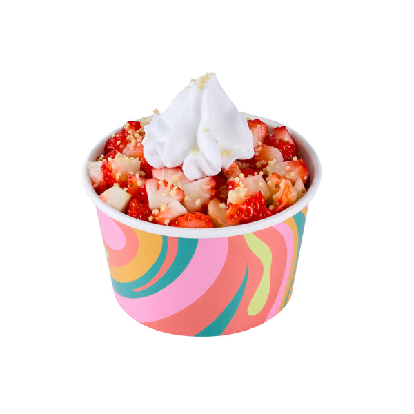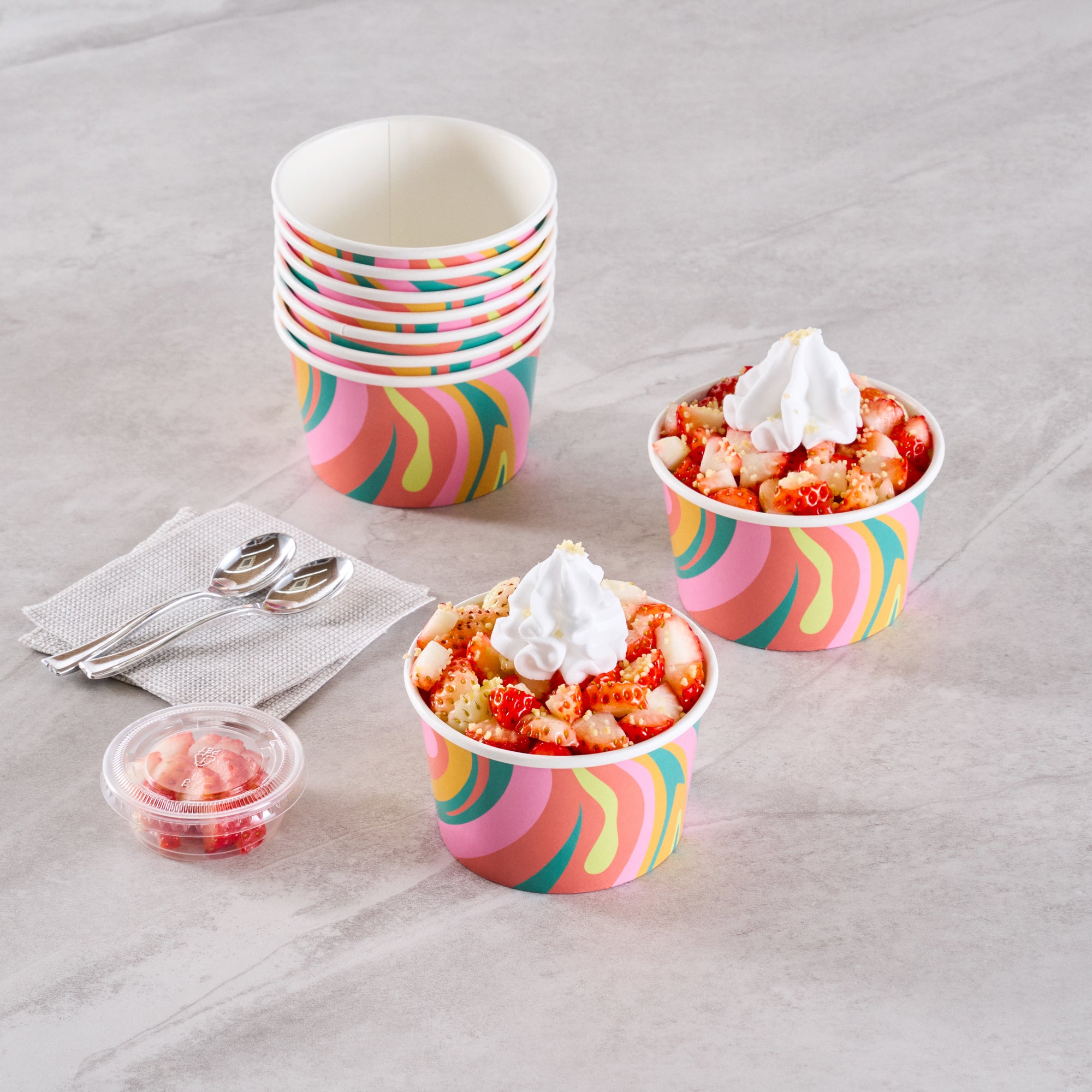 Add flair to your sweets with our Coppetta 8-ounce Round Psychedelic Sunrise Paper To Go Cups, designed to impress and perform. These takeaway dessert cups feature a grease-resistant PE lining to ensure oil and sauces stay inside, maintaining a clean and appetizing look. Constructed from durable paper, these to go cups are perfect for serving both hot and cold foods, giving you versatile options for your menu. Embrace eco-friendly practices with these recyclable frozen yogurt paper cups, making sustainability easy for your business. With a sturdy rolled rim, these disposable cups securely hold coordinating lids (SKU: RWP1769W), allowing customers to take their meals on-the-go without worry. The captivating psychedelic sunrise design on these round ice cream cups adds an upscale touch to your foodservice presentation, enticing customers with every glance. Ideal for storage, these freezer-safe frozen dessert cups keep your treats perfectly preserved. Measuring 3.82 inches in diameter by 2.28 inches in height, these cups boast an 8-ounce capacity to accommodate a variety of delicious offerings. Sold in a 200 count box.