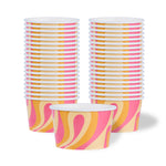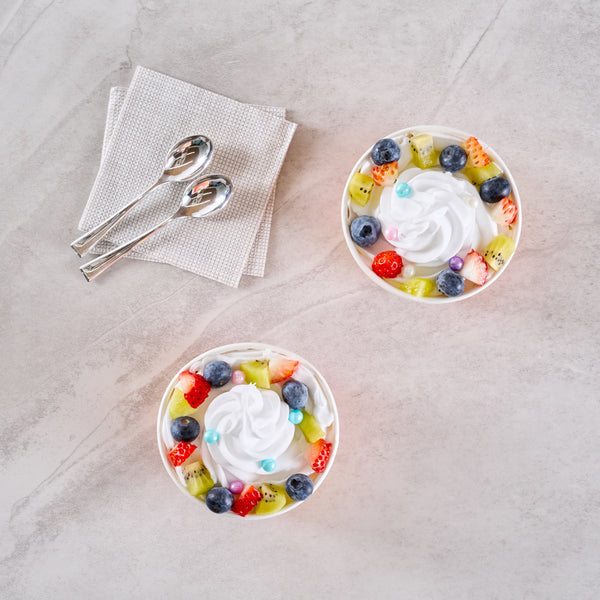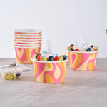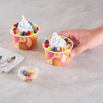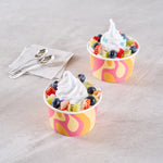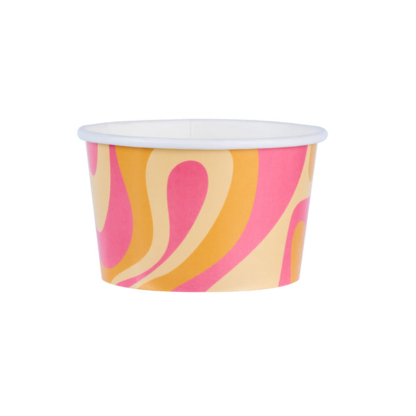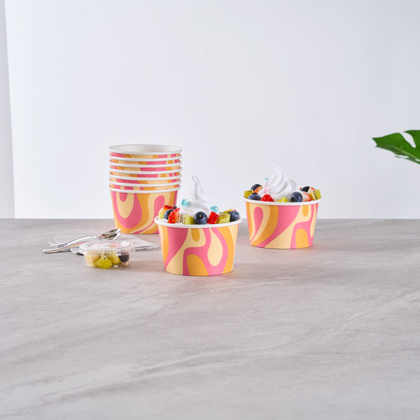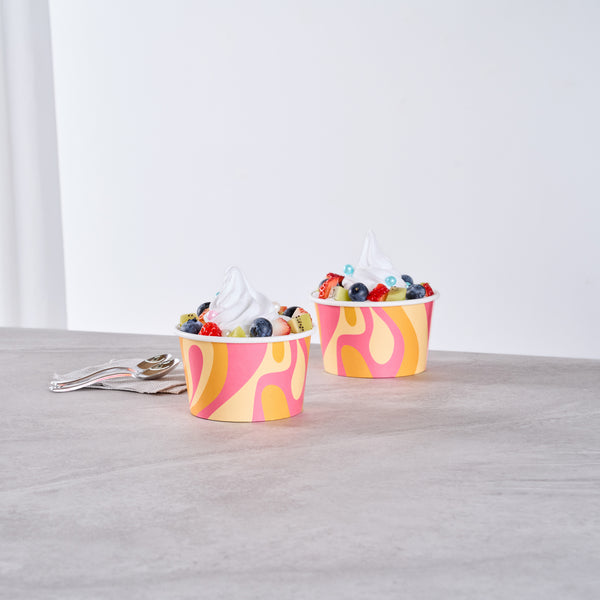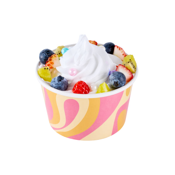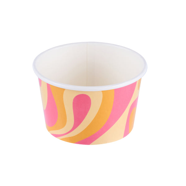 Our Coppetta 8-ounce Round Tropical Twist Paper To Go Cups are the perfect solution for serving your delectable treats with style and practicality. These round ice cream cups feature a grease-resistant PE lining, ensuring that oil doesn't seep through and maintaining a tidy food presentation. Made from durable paper, these takeaway dessert cups are versatile enough to serve both hot and cold foods efficiently. The recyclable nature of these frozen yogurt paper cups offers an eco-friendly option for your foodservice needs. With a rolled rim, these to go cups securely hold coordinating lids (SKU: RWP1769W-50), making them ideal for transporting food on-the-go. The tropical twist design of these disposable cups adds an upscale appearance to your frozen dessert offerings. As freezer-safe containers, these round ice cream cups allow you to conveniently refrigerate leftovers without worry. Measuring 3.82 inches in diameter by 2.28 inches in height, these cups boast an 8-ounce capacity to perfectly portion your servings. Sold in a 50 count box.