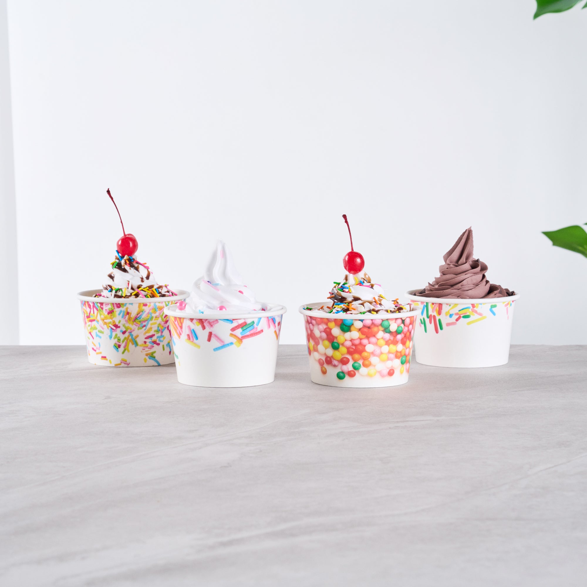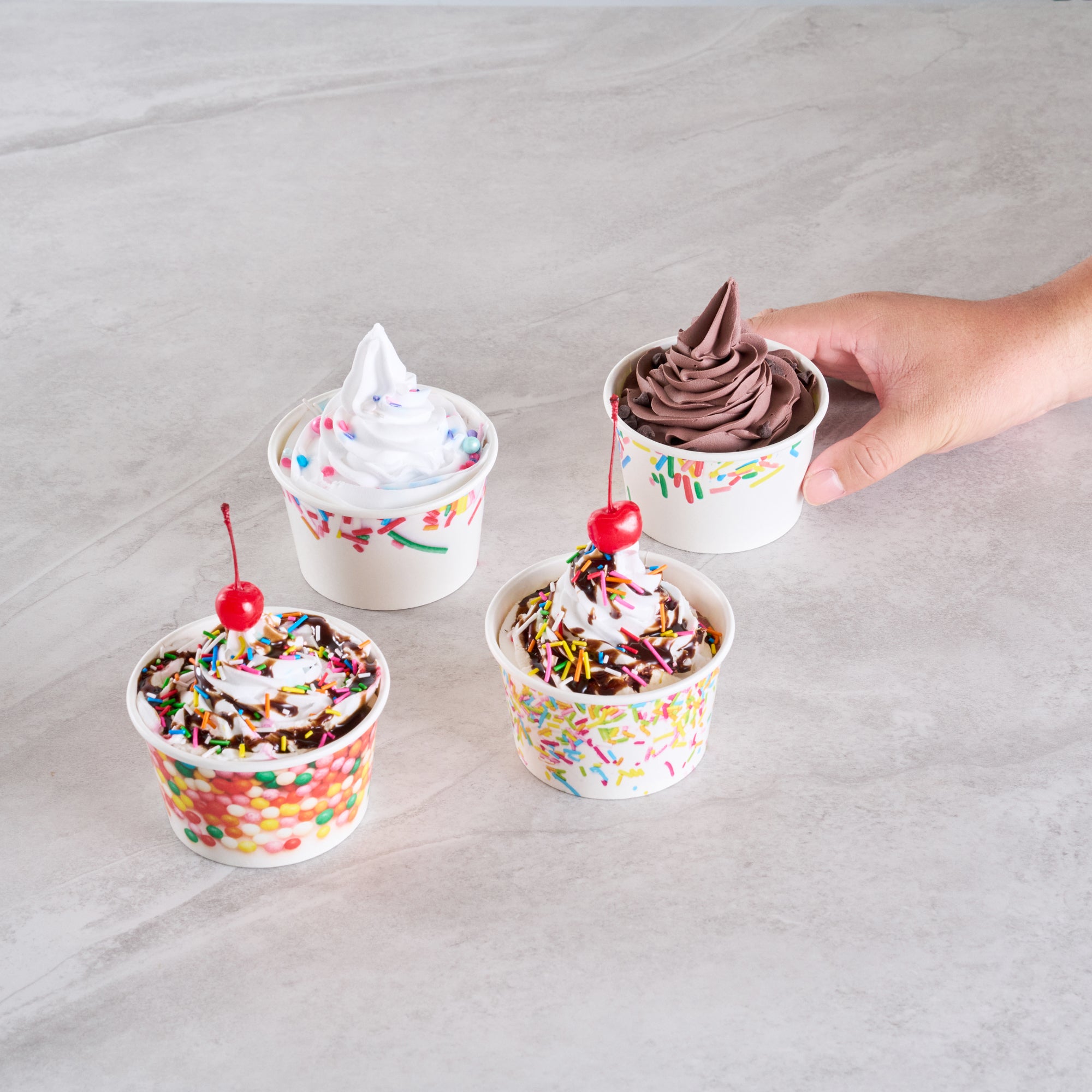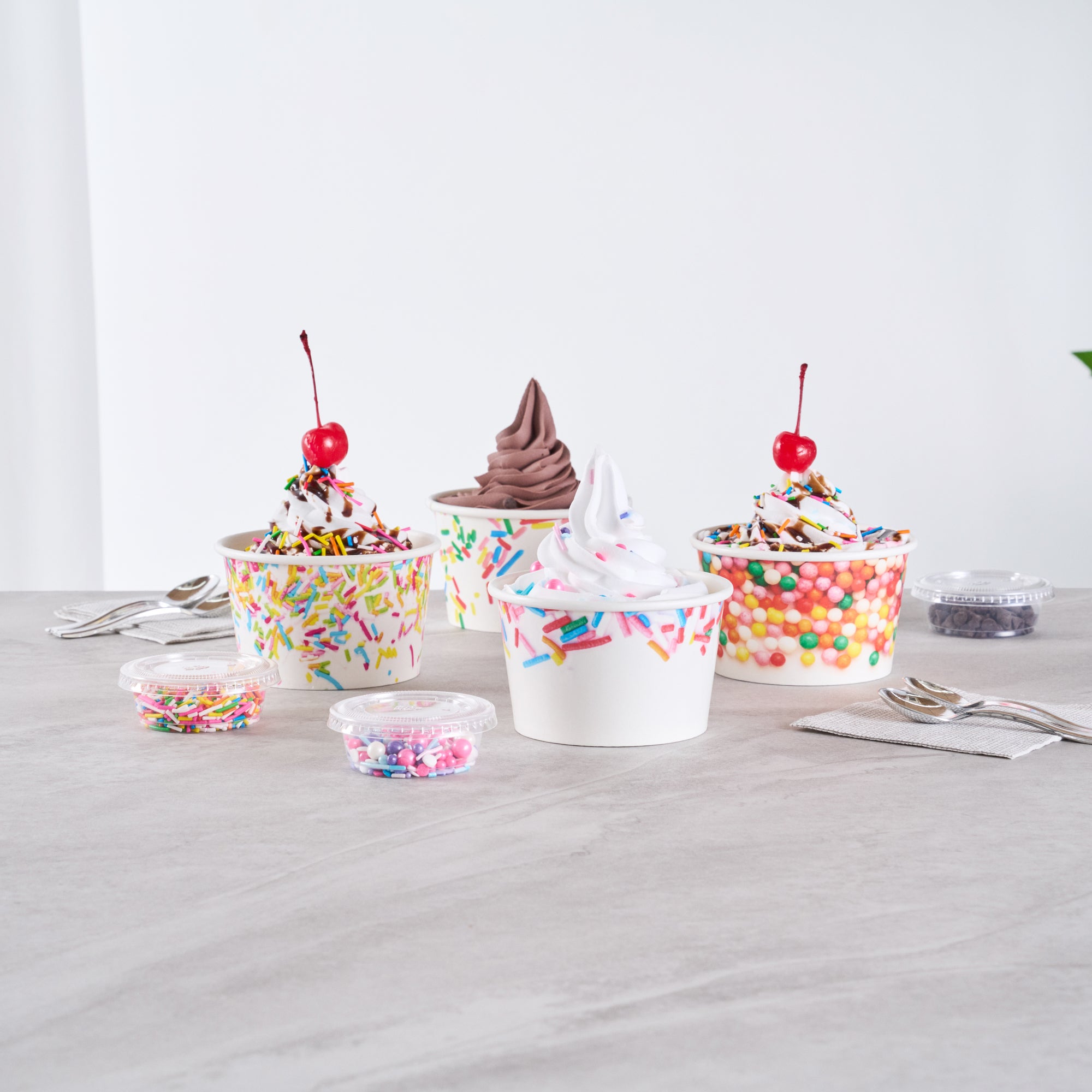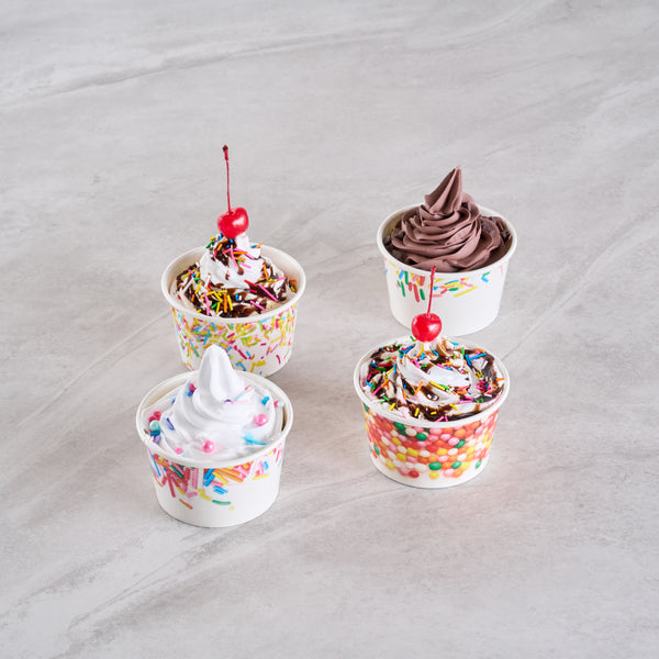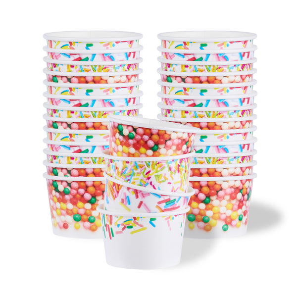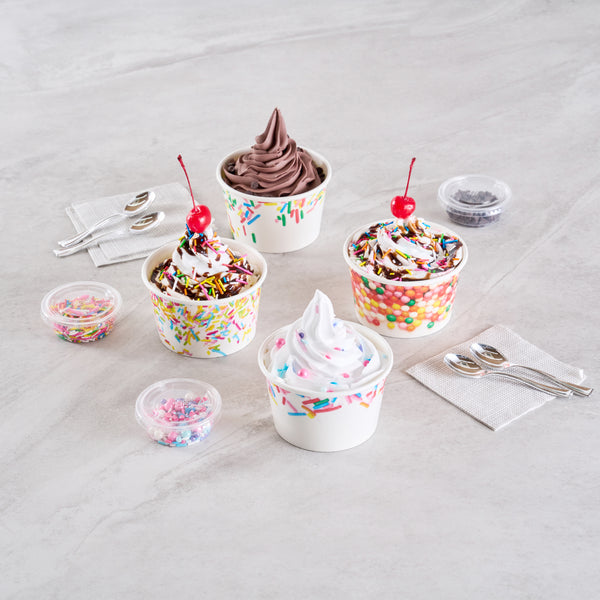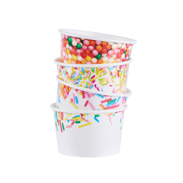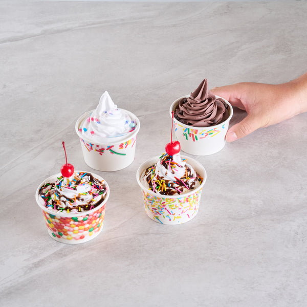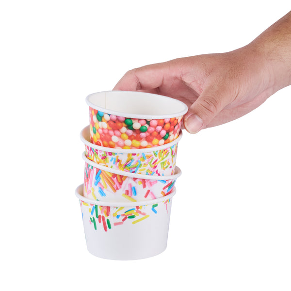 Ensure mess-free service with leak-resistant dessert containers. Coppetta Assorted Ice Cream Cups boast a durable paper construction with an 8-ounce capacity, making them the ideal ice cream cups for serving frozen treats like ice cream or frozen yogurt. Featuring a vibrant assorted sprinkle design, these frozen yogurt cups enhance dessert presentations with a festive flair. With a grease-resistant coating, these paper ice cream containers maintain presentation quality by preventing unsightly smudges. Their sturdy design means no leaks, offering hassle-free service in bustling ice cream parlors and cafes. Both cold and hot food friendly, these versatile containers expand menu options to include hot soups or stews. The recyclable nature of these disposable containers supports eco-friendly practices in any foodservice setting. Elevate your dessert offerings with these dependable containers for seamless service. Each order includes 200 Coppetta Assorted Ice Cream Cups.
