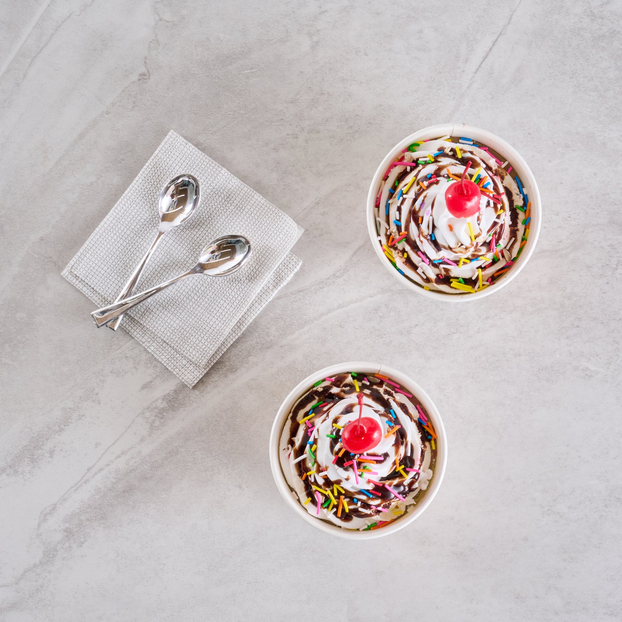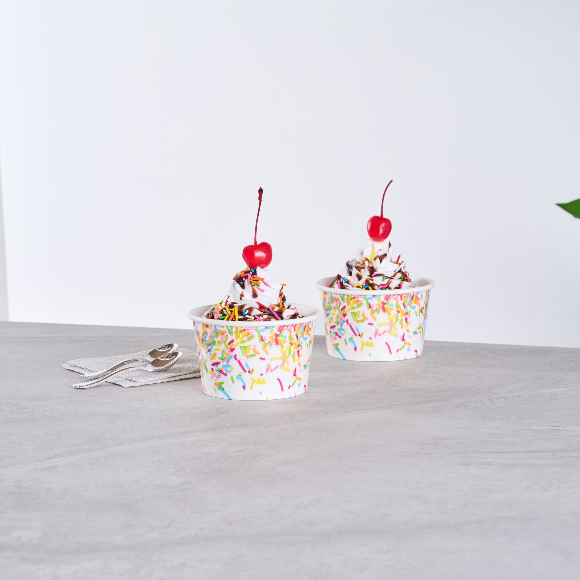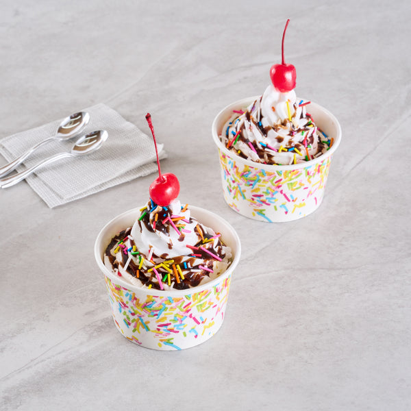 Our Coppetta 8-ounce Round White Paper To Go Cups are the perfect solution for stylish and sustainable foodservice. Designed with grease-resistant PE lining, these takeaway dessert cups ensure a neat food presentation by preventing oil from seeping through. Crafted from durable paper, these to go cups are suitable for serving both hot and cold foods, making them versatile for any menu item. The recyclable convenience of these disposable cups provides an eco-friendly option for serving and presenting food. Featuring a rolled rim, these frozen yogurt paper cups securely hold coordinating lids (SKU: RWP1769W-50) for easy transportation of your culinary creations. Adorned with party sprinkles, these premium paper frozen dessert cups elevate your food presentation with an upscale appearance. Freezer-safe, these round ice cream cups allow you to refrigerate leftovers without compromising quality. With a capacity of 8 ounces, these to go cups measure 3.82 inches in diameter by 2.28 inches in height, making them perfect for a variety of servings. Sold in a 50 count box.