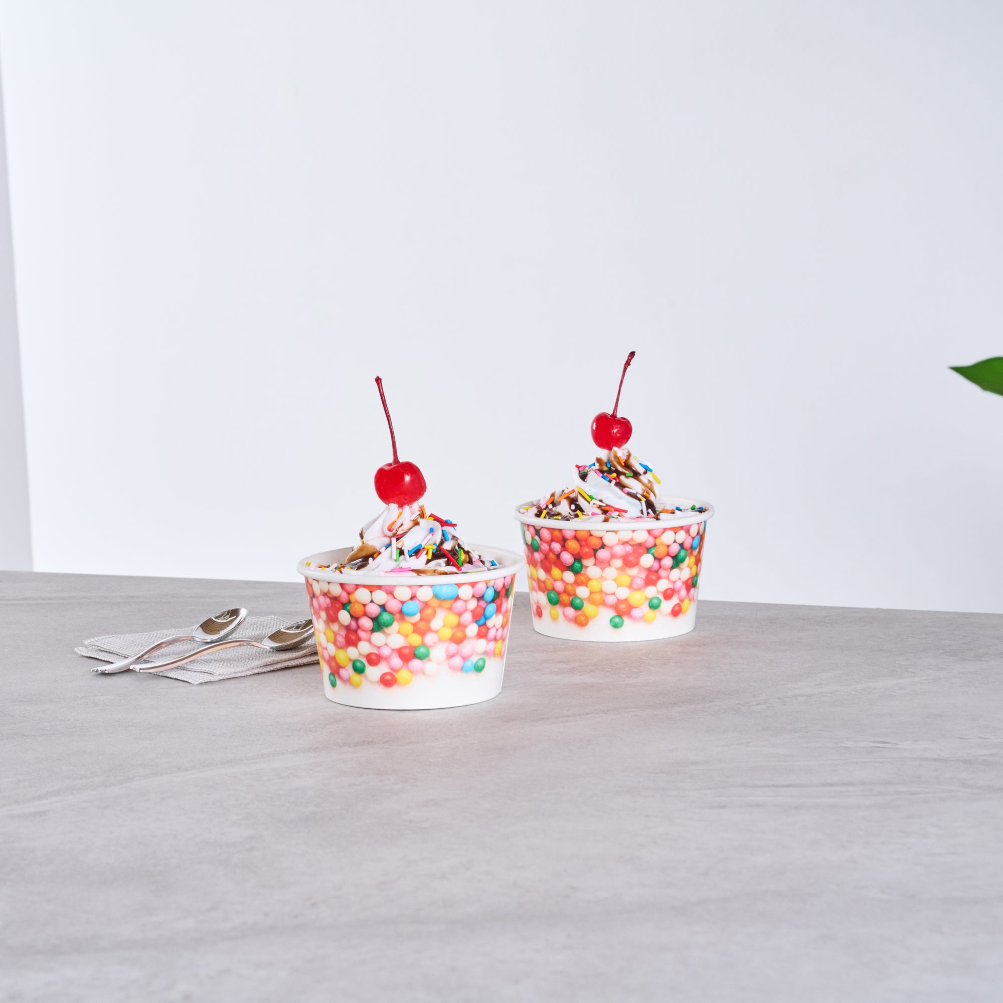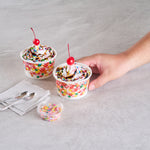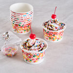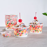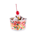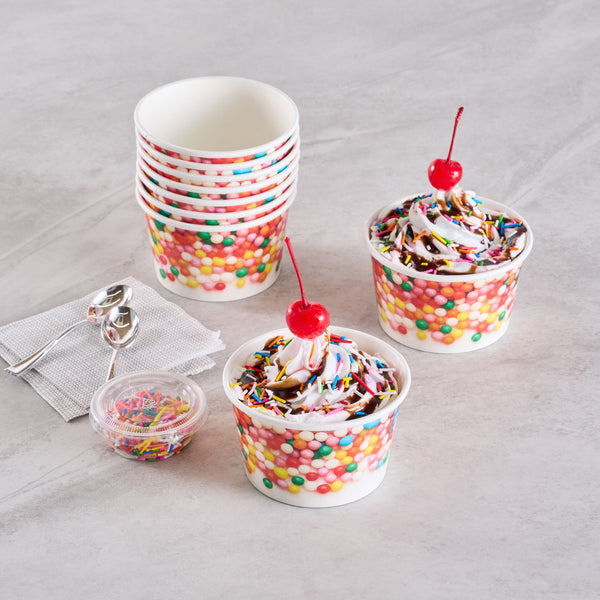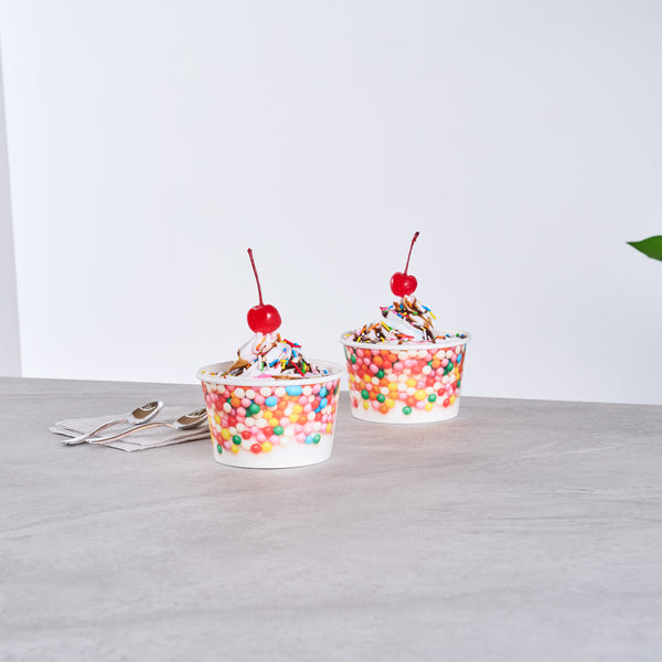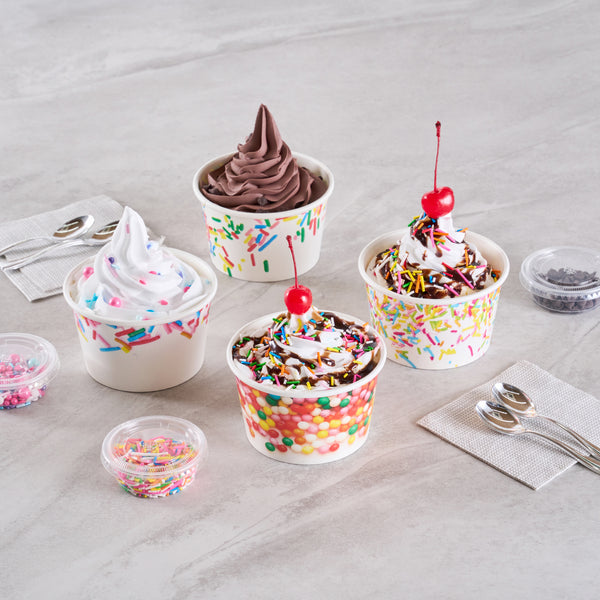 Our Coppetta 8-ounce Round White Paper To Go Cups offer the perfect solution for serving delectable treats with style and convenience. These premium round ice cream cups are designed with a grease-resistant PE lining, ensuring that oil doesn't seep through and maintaining a neat food presentation. Crafted from durable paper, these takeaway dessert cups are suitable for serving both hot and cold foods, catering to a variety of menu items. With their recyclable convenience, these frozen yogurt paper cups provide an eco-friendly option for food presentation, reducing your establishment's environmental impact. Easily secure coordinating lids (SKU: RWP1769W-50) with the rolled rim on these to go cups, making them perfect for transporting food on-the-go. The round sprinkles adorning these disposable cups add an upscale appearance to your frozen dessert offerings, enhancing customer experience. Perfect for preserving leftovers, these round ice cream cups are freezer-safe, allowing you to refrigerate your delicious creations. Measuring 3.82 inches in diameter by 2.28 inches in height, these disposable cups offer a convenient 8-ounce capacity for generous servings. Sold in a 50 count box.