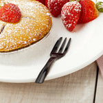 Enjoy delectable treats with our Coppetta Black Plastic Cake Forks with Knife Edge. These cake forks are expertly crafted from high-quality plastic, ensuring both durability and an elegant presentation for your desserts. Designed with an innovative built-in knife edge, these mini forks are perfect for serving alongside wedding cakes, birthday cakes, pastries, or pies and smoothly glide through buttery crusts and thick buttercream frostings. These plastic forks have sturdy handles and stay strong against heavy bites of cake and hefty scoops of pie. The elegant black finish of these fruit forks complements your tasty fares. For an easy post-event cleaning process, these dessert forks are conveniently disposable. These disposable forks measure 4 inches in length by 0.75 inches in width. Shipped in a 100 count box.