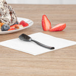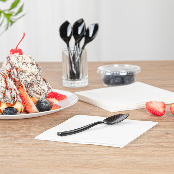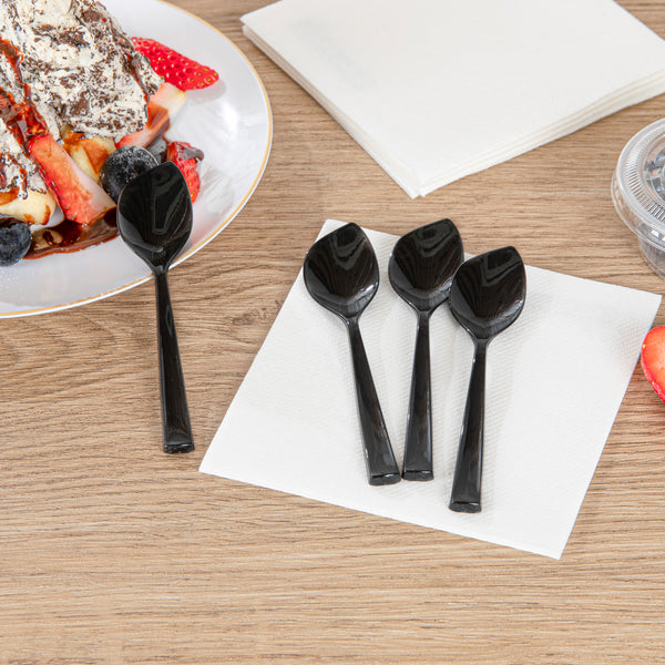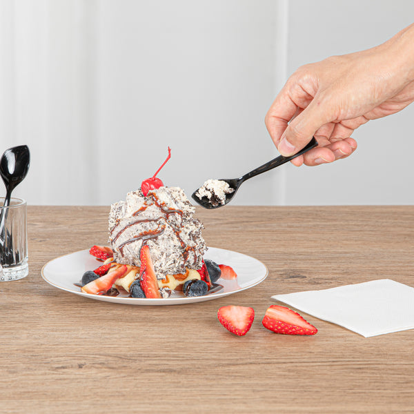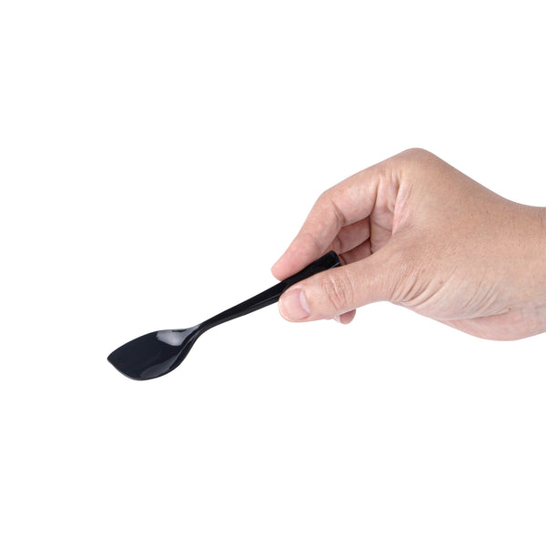 Enhance your tabletop aesthetics with our Coppetta Black Plastic Petal Spoons. Made from premium plastic, these disposable spoons are durable and don't break under the weight of hearty scoops. Featuring a petal-shaped head, these plastic spoons easily scoop through the dessert. These frozen yogurt spoons are designed with sturdy handles that are comfortable to hold. With their sleek black finish and unique shape, these cake spoons will add a memorable touch to your selection of frozen treats and delicious desserts. These dessert spoons measure 4.5 inches in length by 1 inch in width, making them ideal for serving alongside all types of frozen treats and delectable desserts. Shipped in a 500 count box.