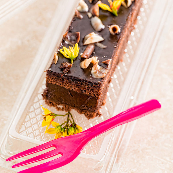 Smoothly cut through thickly layered cakes and lattice-topped fruit cobblers with our Coppetta Magenta Plastic Cake Forks with Knife Edge. These fruit forks are crafted from premium plastic and have sturdy handles that withstand big, hefty bites. Designed with a built-in knife edge, these cake forks will effortlessly glide through your delectable desserts to deliver the perfect bite every time. The extra-wide knife-edged tine of these plastic forks easily cuts through dense cakes. With a vivid magenta finish, these pastry forks add a pop of color to your food presentation. These dessert forks make cleaning easy, as they are disposable. Measuring 4 inches long by 0.75 inches wide, these disposable forks are perfect for mini appetizers at cafes, food trucks, or catered events. Sold in a 100 count box.