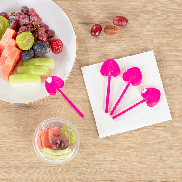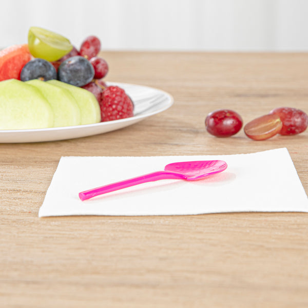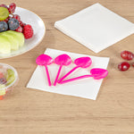Serve your sweet treats with vibrant bursts of color with our Coppetta Magenta Plastic Love Shovel Spoons. Featuring a unique heart-shaped shovel design, these small plastic spoons are perfect for scooping up gobs of freshly churned frozen custard. These dessert spoons have a contemporary slender handle that is easy to grip and fun for customers to hold. With a sturdy plastic construction, these recyclable tasting spoons ensure they are strong enough to stand up to heavy spoonfuls of ice cream and frozen yogurt. These vibrant dessert spoons can be disposed of after use to make cleaning easy. Measuring 3.5 inches long by 1.25 inches wide, these magenta small plastic spoons can also be used as sample spoons at tasting events and by catering companies. Sold in a 100 count box.