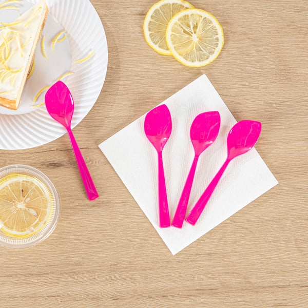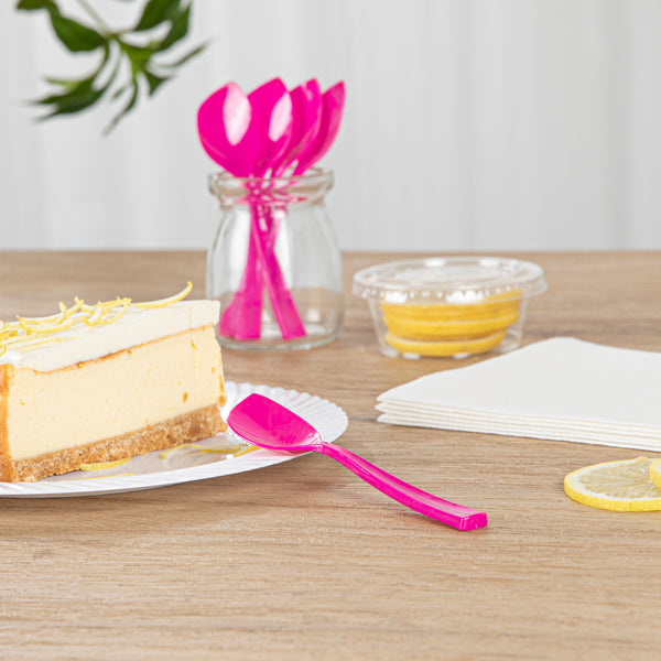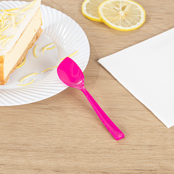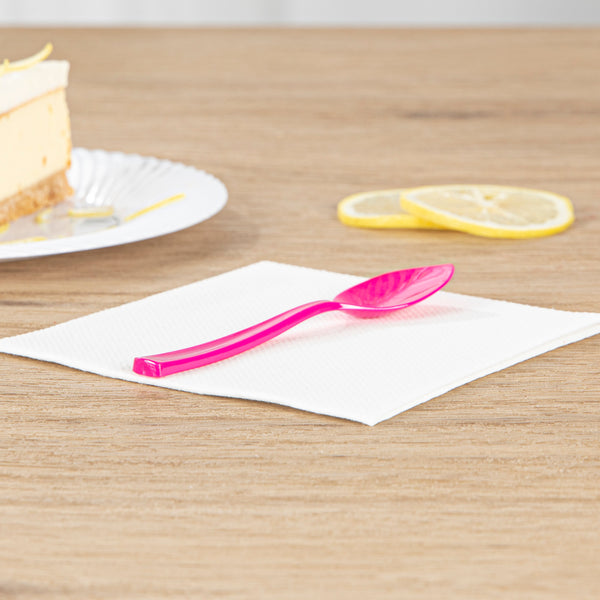 Add a pop of color to your delectable desserts with our Coppetta Magenta Plastic Petal Spoons. These frozen yogurt spoons are crafted from high-quality plastic and won't bend or break under the weight of heavy scoops. With a sleek pointed tip, these disposable spoons effortlessly pierces through frozen mounds of gelato and packed scoops of sorbet. These cake spoons have strong and sturdy handles that expertly manage heavy bites of desserts. Designed in a bubbly hot pink color, these plastic spoons are a perfect addition to popular ice cream parlors and trendy frozen yogurt shops. These dessert spoons measure 4.5 inches by 1 inch in width. Shipped In a 500 count box.
