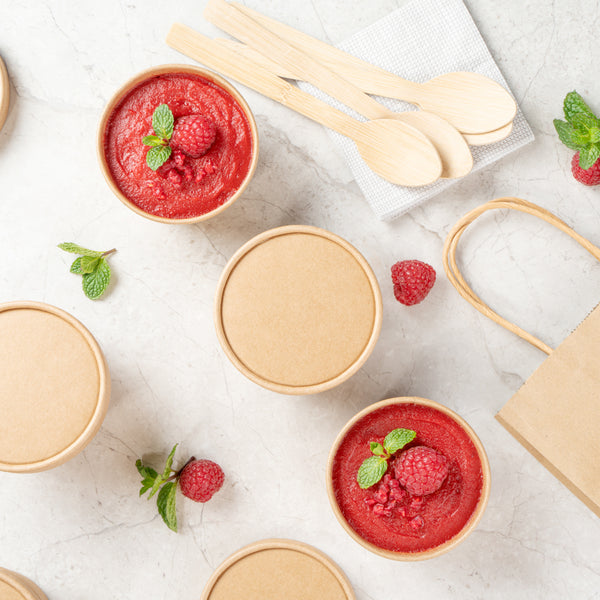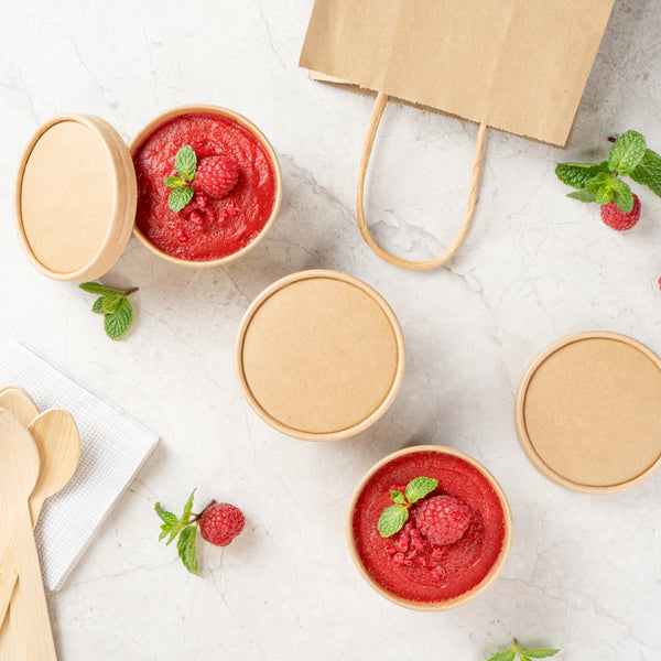 All of the deli container lids are available in kraft or white finishes so you can match them with our colorful cups. Plus, they seamlessly blend with your event's decor.
