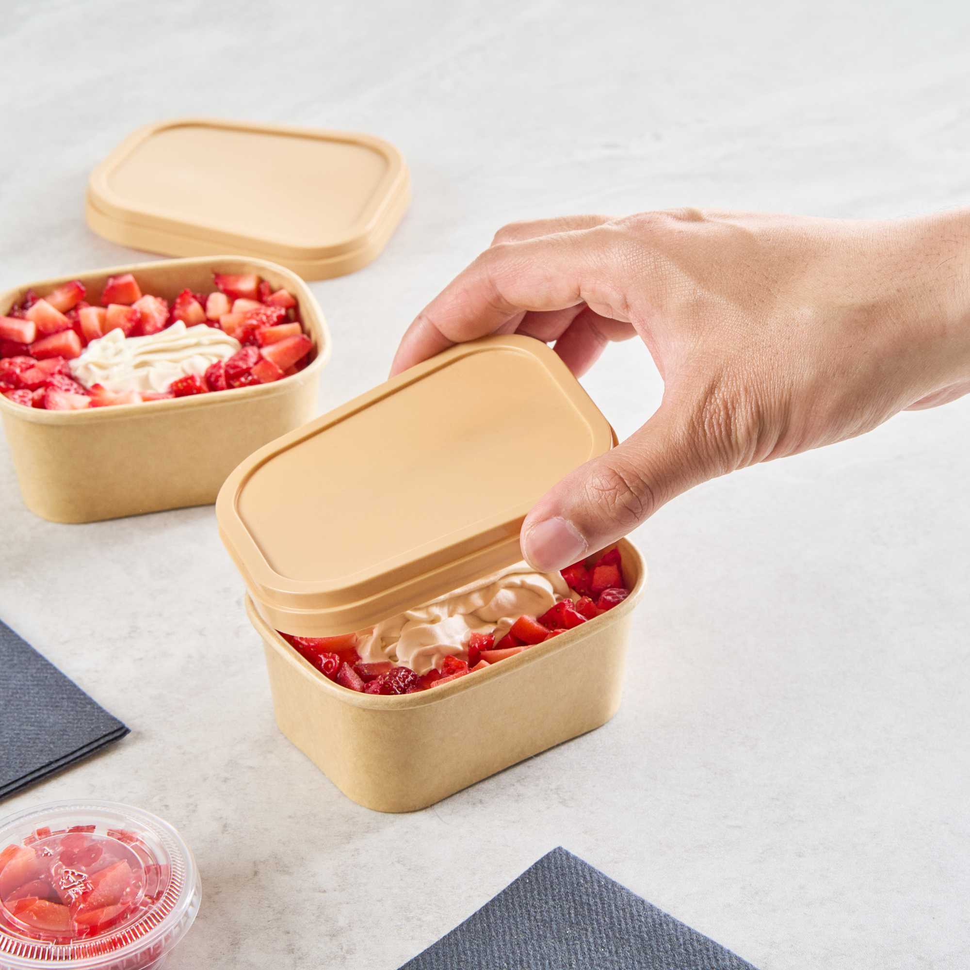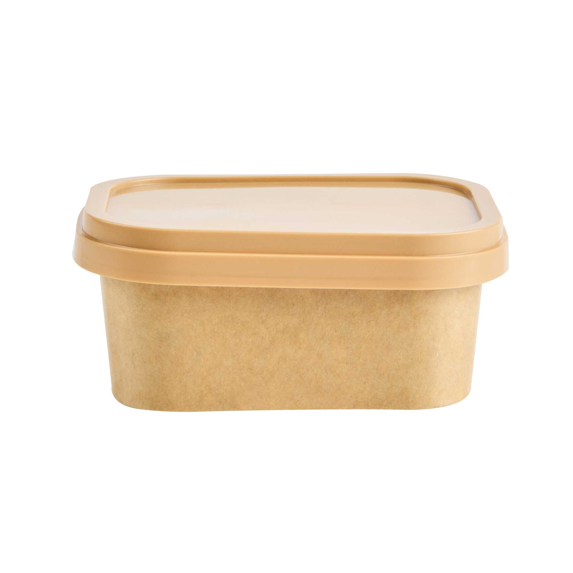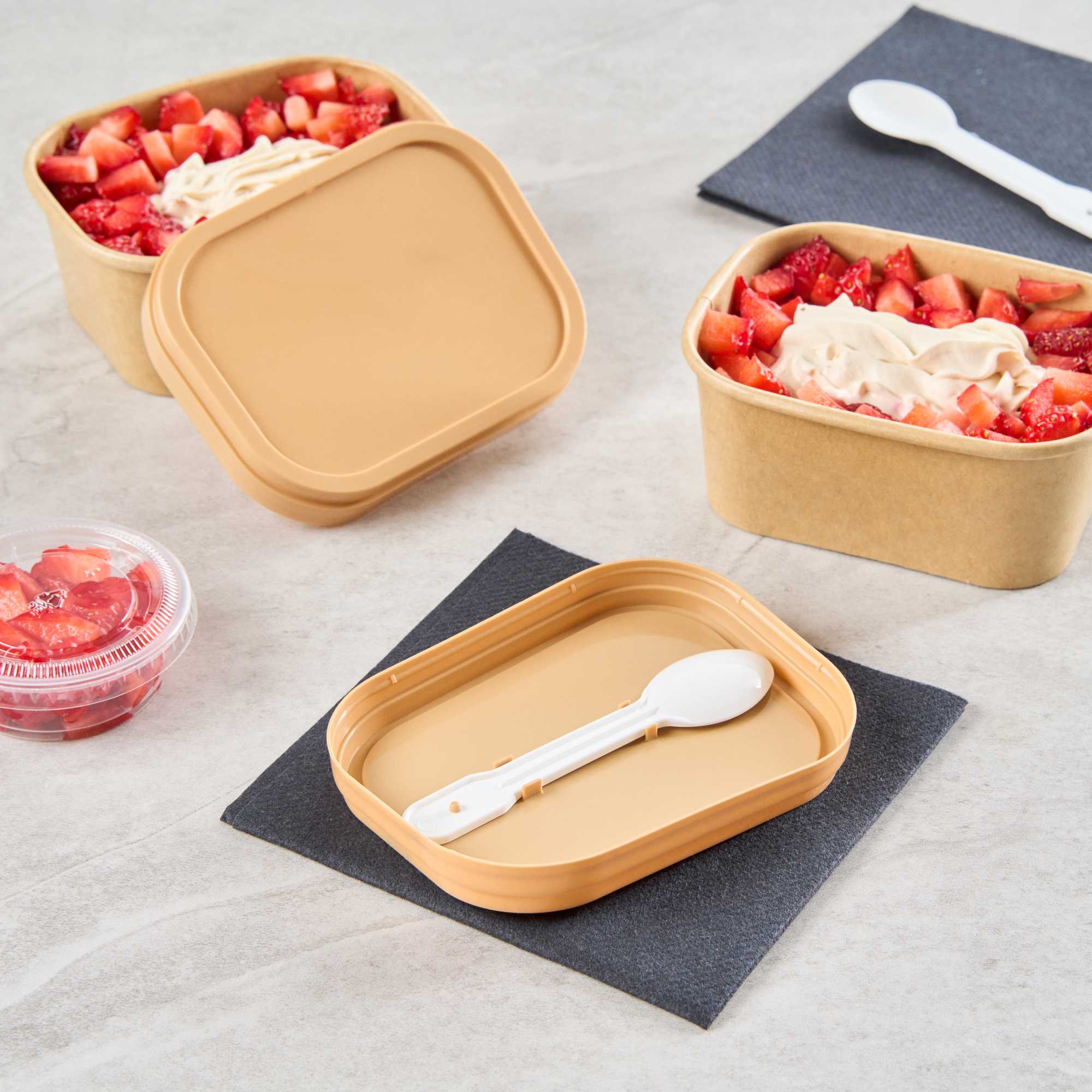 Enhance your foodservice with our Coppetta Square Brown Plastic Lids. These durable plastic lids ensure reliable use and are recyclable to reduce environmental impact. Coordinate these ice cream cup lids with our 7 and 12-ounce Coppetta cups to securely hold your ice creams and treats. Featuring an included plastic spoon, these brown plastic lids make it easy to enjoy your treats on the go. The versatile design of these to go cup lids allows for easily enjoying both hot or cold treats. With a natural brown finish, these disposable lids add an eco-friendly aesthetic to your restaurant's take out packaging. Measuring 4.21 inches in length by 3.23 inches in width by 0.55 inches in height, these lids provide a perfect fit for your to go cups. Sold in a 200 count box.