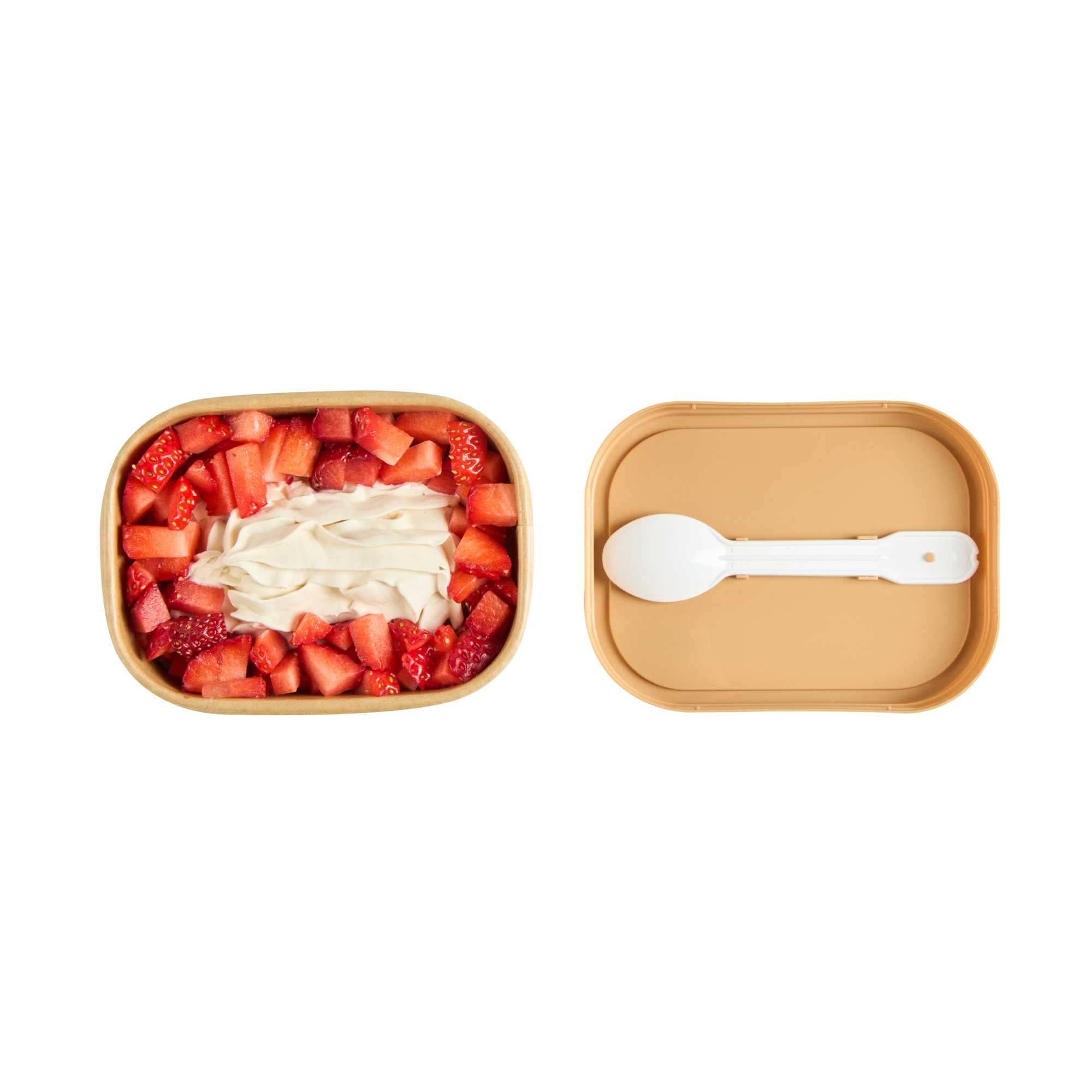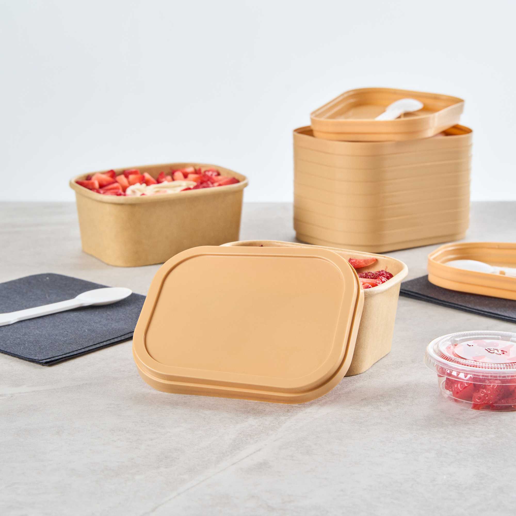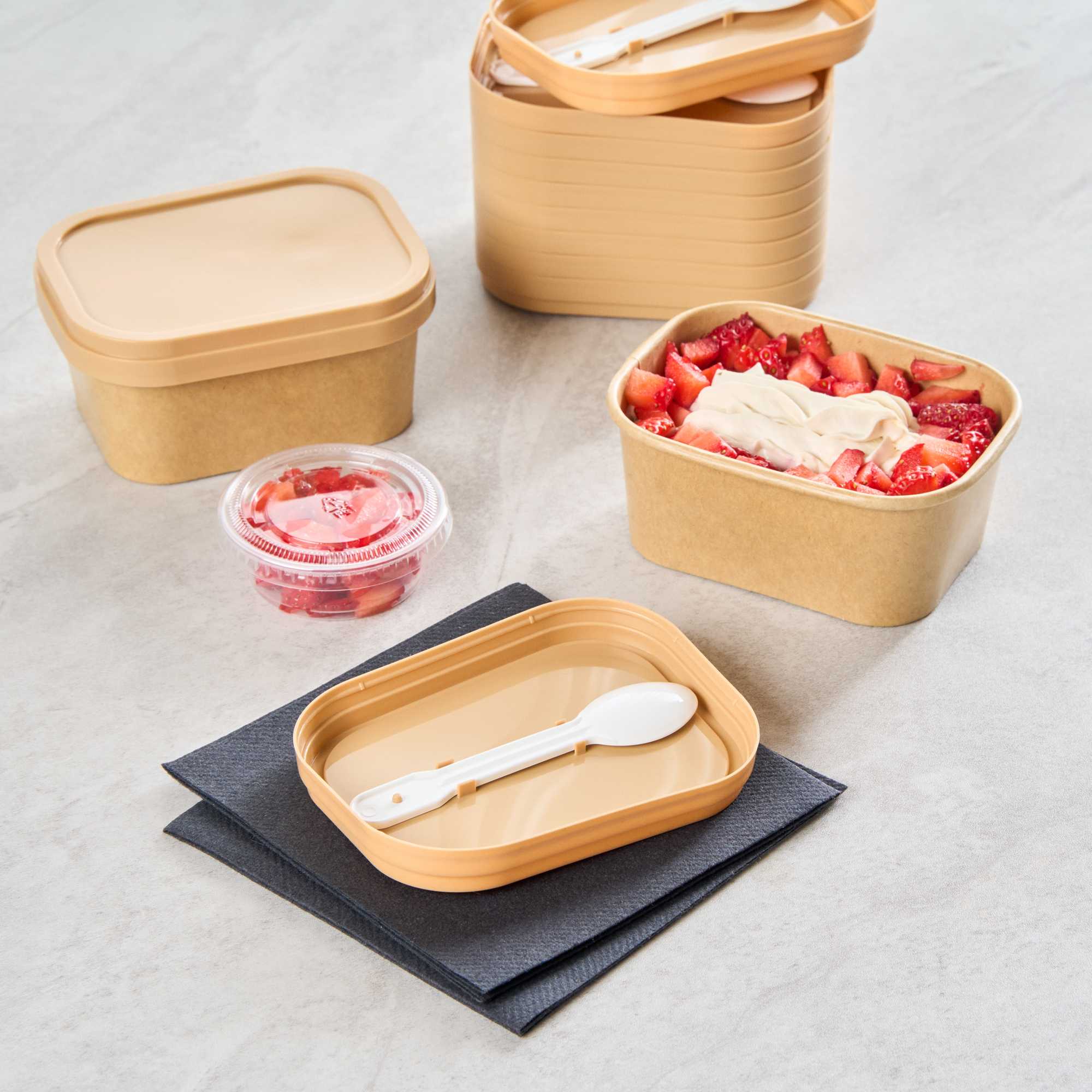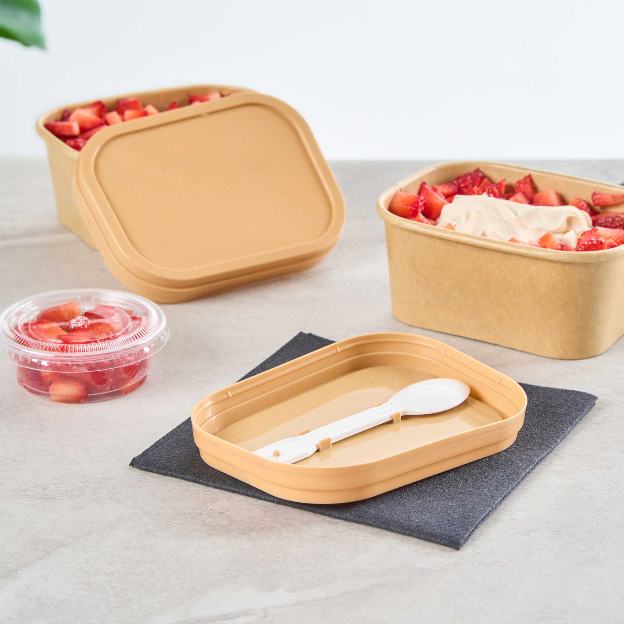 Enhance your foodservice with our Coppetta Square Brown Plastic Lids. These durable plastic lids ensure reliable use and are recyclable to reduce environmental impact. Coordinate these ice cream cup lids with our 7 and 12-ounce Coppetta cups to securely hold your ice creams and treats. Featuring an included plastic spoon, these brown plastic lids make it easy to enjoy your treats on the go. The versatile design of these to go cup lids allows for easily enjoying both hot or cold treats. With a natural brown finish, these disposable lids add an eco-friendly aesthetic to your restaurant's take out packaging. Measuring 4.21 inches in length by 3.23 inches in width by 0.55 inches in height, these lids provide a perfect fit for your to go cups. Sold in a 200 count box.