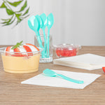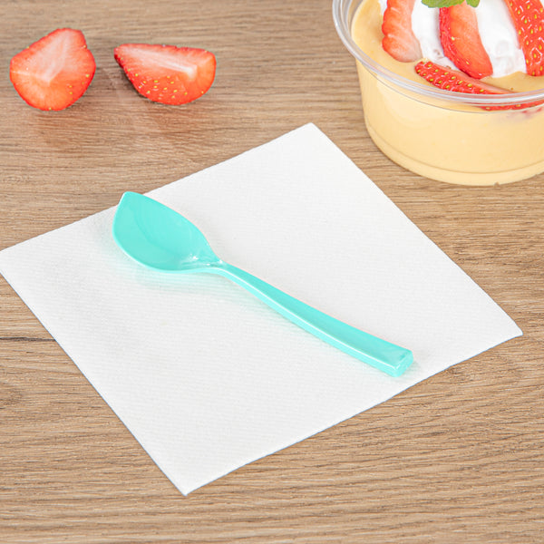 Make a statement at your party table settings with our Coppetta Teal Plastic Petal Spoons. The sturdy plastic construction of these frozen yogurt spoons won't wimp out under the weight of heavy bites. Incorporated with an angled shovel-like shape, these dessert spoons are absolutely perfect for scooping up big bites of chocolate ice cream and heaping spoonfuls of tangy frozen yogurt. These plastic spoons have a sleek pointed tip that makes it easy to dive into towering mounds of sorbet. Fashioned with brightly colored teal, these disposable spoons are an ideal choice for use at ice cream parlors, fro-yo shops, and catered events. For an easy cleanup, these petal spoons are disposable. Each cake spoon measures 4.5 inches in length by 1 inch in width, making them ideal for serving alongside all types of frozen treats and delectable desserts. Shipped in a 100 count box.
