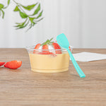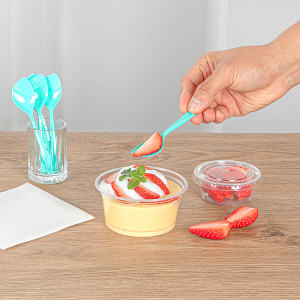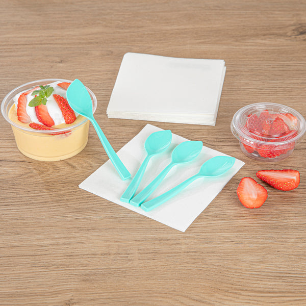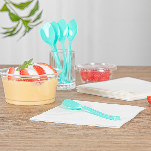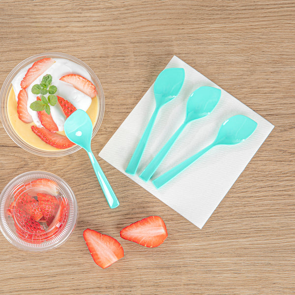Make a statement at your party table settings with our Coppetta Teal Plastic Petal Spoons. The sturdy plastic construction of these frozen yogurt spoons won't wimp out under the weight of heavy bites. Incorporated with an angled shovel-like shape, these dessert spoons are absolutely perfect for scooping up big bites of chocolate ice cream and heaping spoonfuls of tangy frozen yogurt. These plastic spoons have a sleek pointed tip that makes it easy to dive into towering mounds of sorbet. Fashioned with brightly colored teal, these disposable spoons are an ideal choice for use at ice cream parlors, fro-yo shops, and catered events. For an easy cleanup, these petal spoons are disposable. Each cake spoon measures 4.5 inches in length by 1 inch in width, making them ideal for serving alongside all types of frozen treats and delectable desserts. Shipped in a 500 count box.