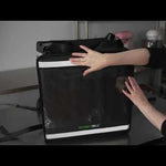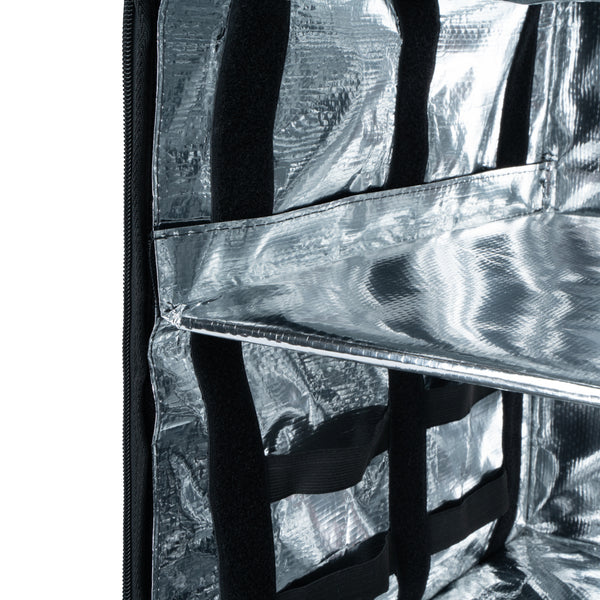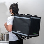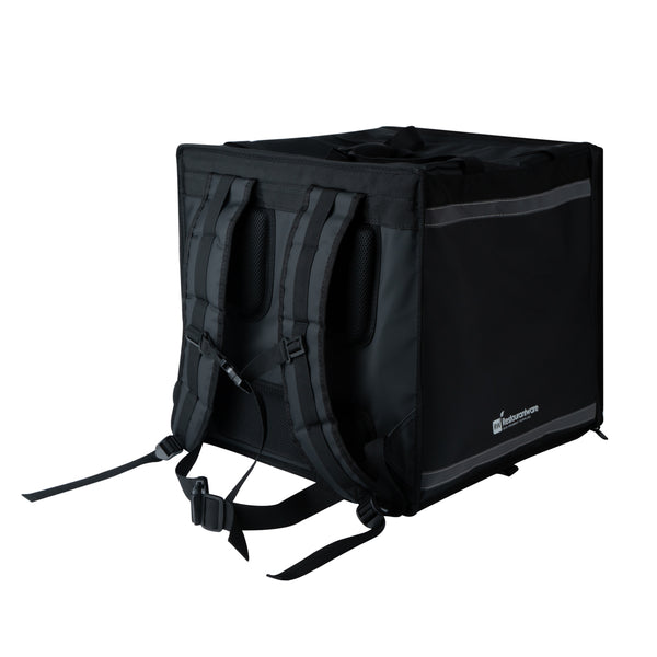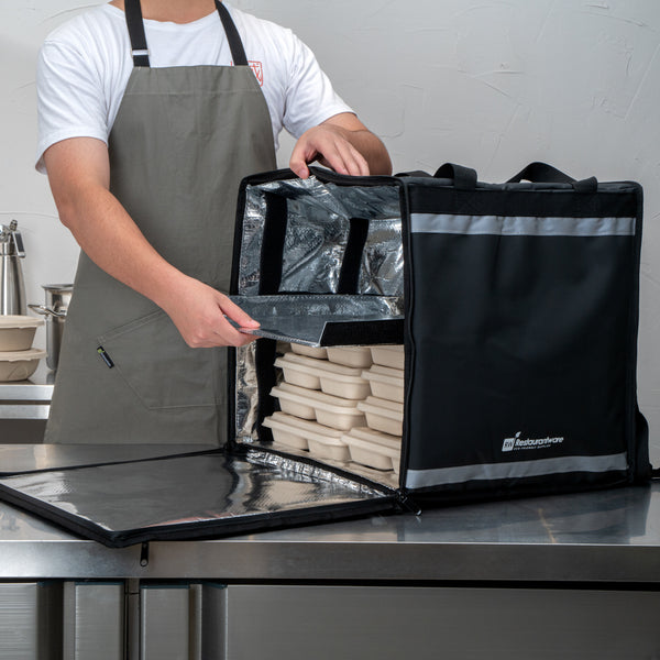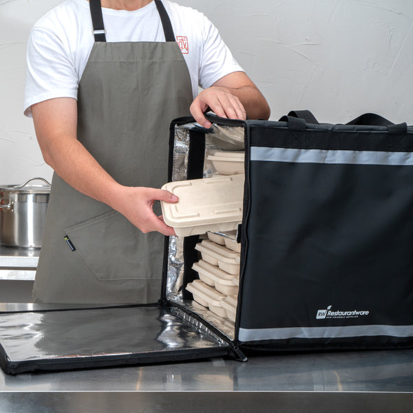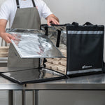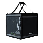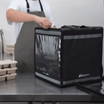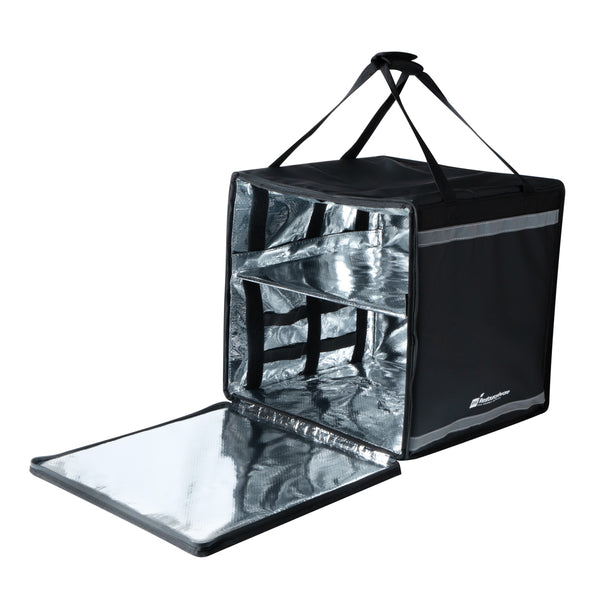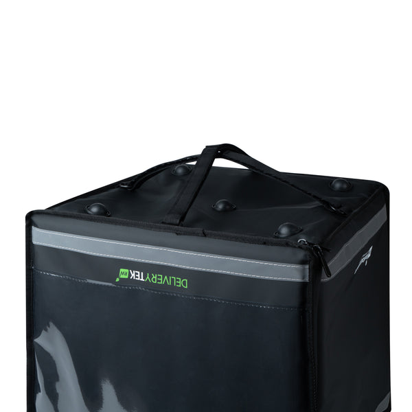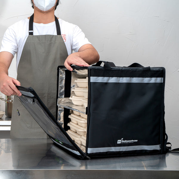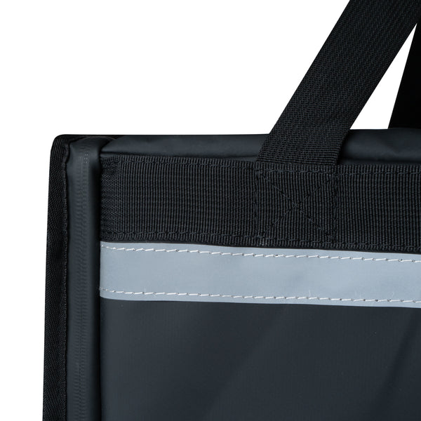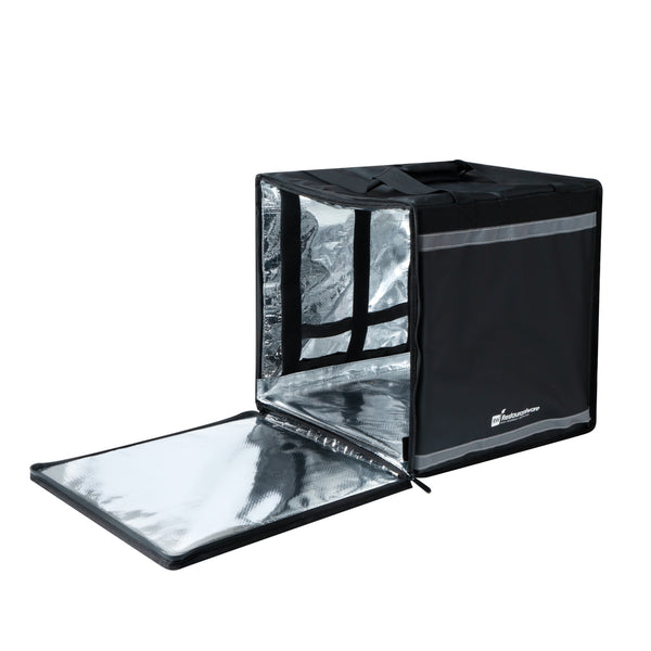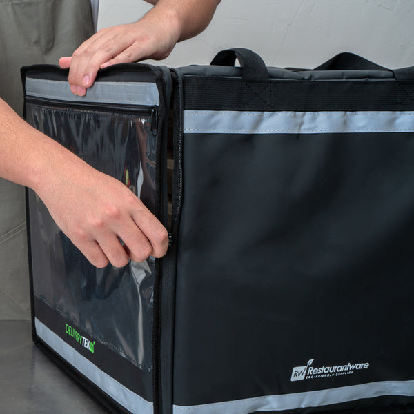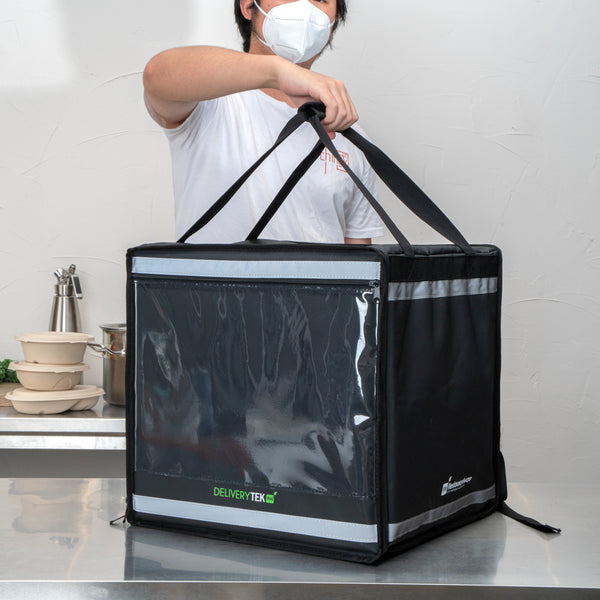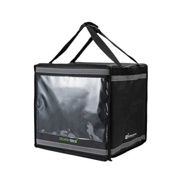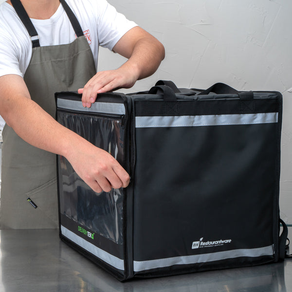Upgrade the way you deliver catering orders using our Delivery Tek Black Insulated Food Delivery/Catering Bag. This food delivery bag is made from waterproof PVC vinyl fabric and is designed to hold several take out containers. Featuring adjustable handles and backpack straps with padded cushions, this insulated delivery bag provides comfort while transporting meals. Use the waist buckle to keep the carrier in place on the go. Secure this food delivery backpack onto a bike or scooter with the anchor straps. The reflective strips on this food delivery bag allow couriers to deliver during the day or night. This food delivery backpack includes a window pocket where you can display menus. With an insulated interior, this food delivery bag keeps meals at the perfect temperature for up to 8 hours. This insulated delivery bag includes a removable divider that can be adjusted using the hook-and-loop fastener to customize the interior. The inside of this food delivery backpack has 4 elastic bands to securely hold bottles. This square food delivery bag measures 17.7 inches in length, width, and height. Sold in a 1 count box.
