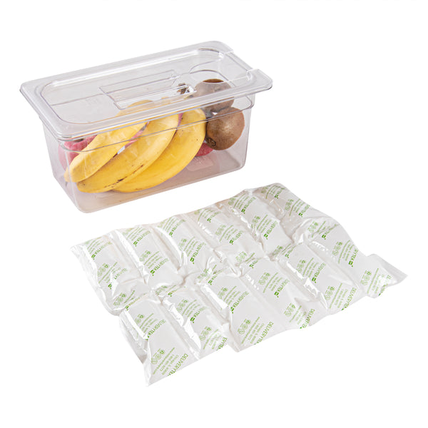 Maintain the temperature of your cold foods during delivery using our Delivery Tek Plastic Shipping Ice Packs. The durable construction of these sheets of shipping ice packs lets them withstand rigorous use without any damage. Made from plastic on one side, these freezer pack sheets have a quick-drying surface. Conveniently use individual cells or the entire sheet of cool packs based on your needs. These ice packs for coolers have non-woven fabric on one side, allowing them to swell faster when immersed in water. Store these sheets of dry ice packs in the freezer and reuse them. With a leakproof design, these ice pack sheets do not wet your package during transit. These ice pack sheet blankets come in thin sheets measuring 15.25 inches in length by 11.5 inches in width with 12 cells in each sheet. Sold in a 10 count box.