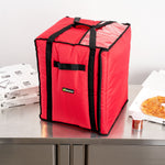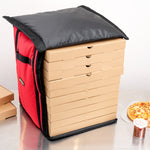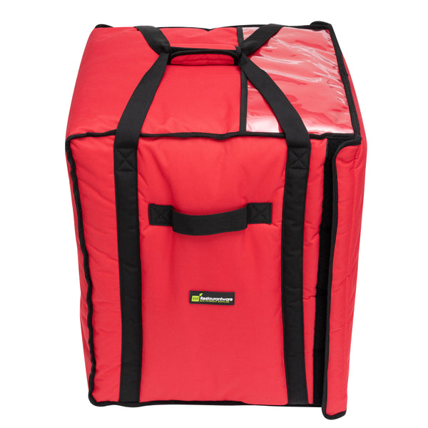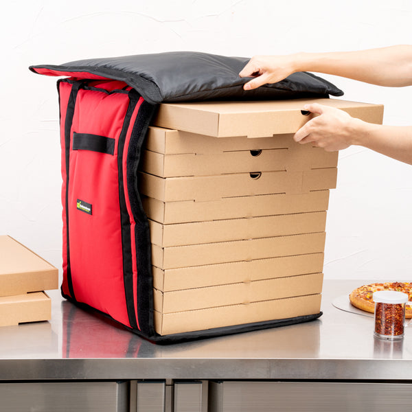 Ensure your pizza orders arrive hot and ready to eat with our Delivery Tek Red Pizza Bag. This insulated pizza delivery bag holds ten 18-inch pizza boxes for taking a large stack of pizzas in one trip. Equipped with PET insulation, this take away delivery bag keeps your food hot and fresh during transport. The polyester lining of this commercial pizza delivery bag allows you to easily wipe off minor spills, keeping it clean for a long time. The extra-large flap of this hot pizza delivery bag keeps the pizza boxes locked, allowing you to contain your fare securely. Featuring 2 handles stitched on the side, this extra large pizza delivery bag allows effortless carrying of multiple pizza boxes simultaneously. With a transparent ID window, this insulated pizza bag makes it easy to show your ads to potential customers. Featuring heavy-duty stitching, this delivery bag is durable and maintains its high-quality look for a long time. Perfect for shortening your cleaning process, this insulated carrying bag is machine washable. This premium pizza bag measures 19 inches long by 19 inches wide by 23 inches tall. Sold in a 1 count box.