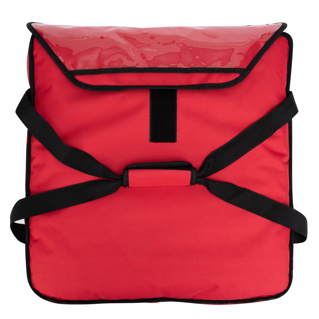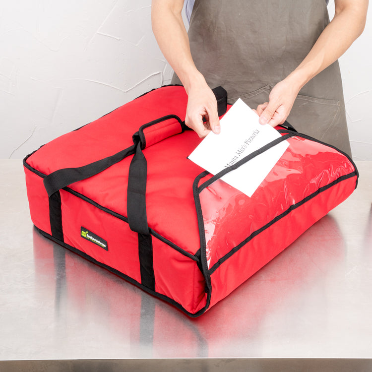 Pack up your pizzas and wings with our Delivery Tek Red Pizza Bag. Great for delivering multiple orders, this pizza bag can hold two 20-inch pizza boxes or three 18-inch pizza boxes. Featuring a 1.5-inch thick PET insulation, this thermal pizza delivery bag is designed to keep your food hot and fresh during transport. Easy to simply wipe down after each use, this commercial pizza delivery bag has an interior with polyester lining. With an extra-large flap, this heated pizza delivery bag provides a secure seal, avoiding spills during transport. Featuring a carrying handle, this insulated pizza bag offers an ergonomic grip for comfortably transporting your special deliveries. Designed with a transparent ID window, this red pizza bag makes it easy to take receipts, menus, or ads on deliveries. The heavy-duty stitching of this insulated pizza bag allows you to take large orders without worrying about tears. For quick cleanup, this delivery bag is machine washable. Measuring 20.75 inches in length by 21.75 inches in width by 6.5 inches tall, this pizza bag is spacious and fits multiple pizzas easily. Sold in a 1 count box.
