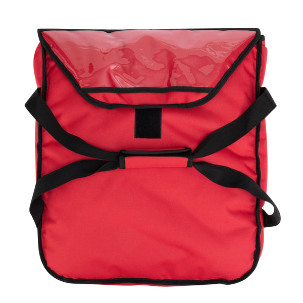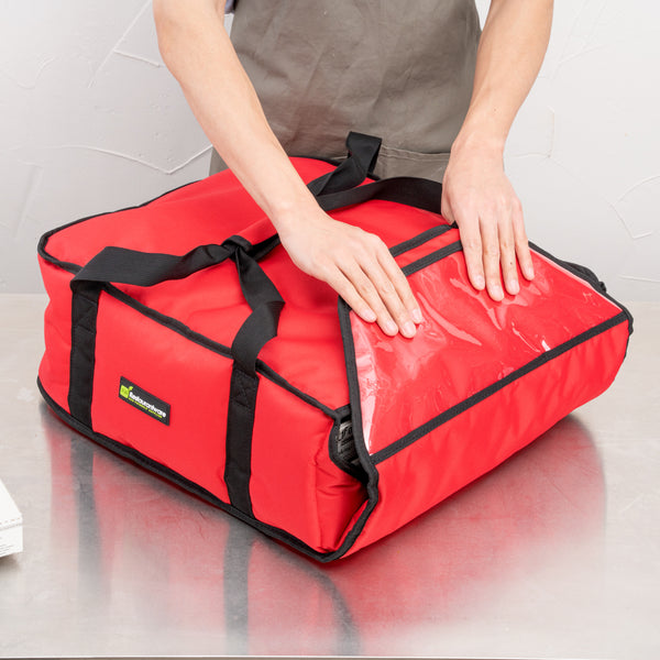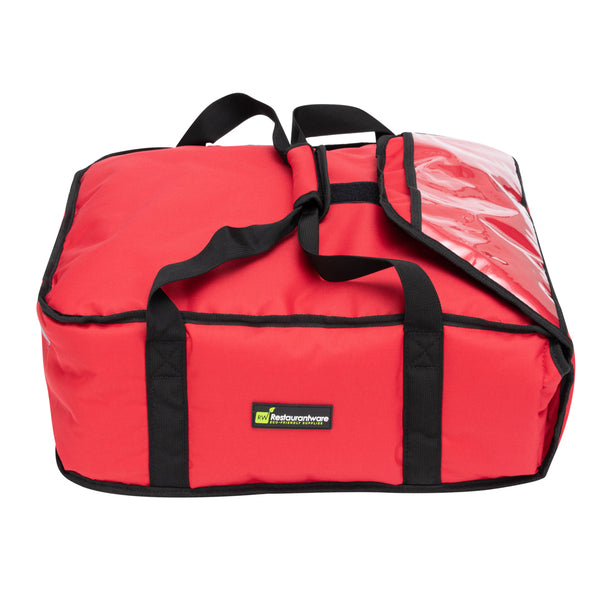 Our Delivery Tek Red Pizza Bag holds the weight of hefty foods or many pizzas. To transport several pizzas, this pizza warmer bag holds 3, 18-inch or 4, 16-inch pizza boxes. The PET insulation of this pizza delivery bag keeps your fare warm and fresh until it reaches your customer. This thermal pizza delivery bag features a interior polyester lining that is easy to wipe down in case of spills. With an extra-large flap that provides a tight seal, this insulated pizza carrier keeps your food securely contained to avoid messes and spills. Featuring a clear ID window, this pizza heat bag provides an effortless way to display advertisements or keep menus stored. Featuring heavy-duty stitching, this pizza take out bag won't easily tear, making it perfect for long-lasting use. To quickly clean without handwashing, this take away delivery bag is machine washable. This red pizza bag measures 17.5 inches long by 20 inches wide by 7.5 inches tall. Sold in a 1 count box.