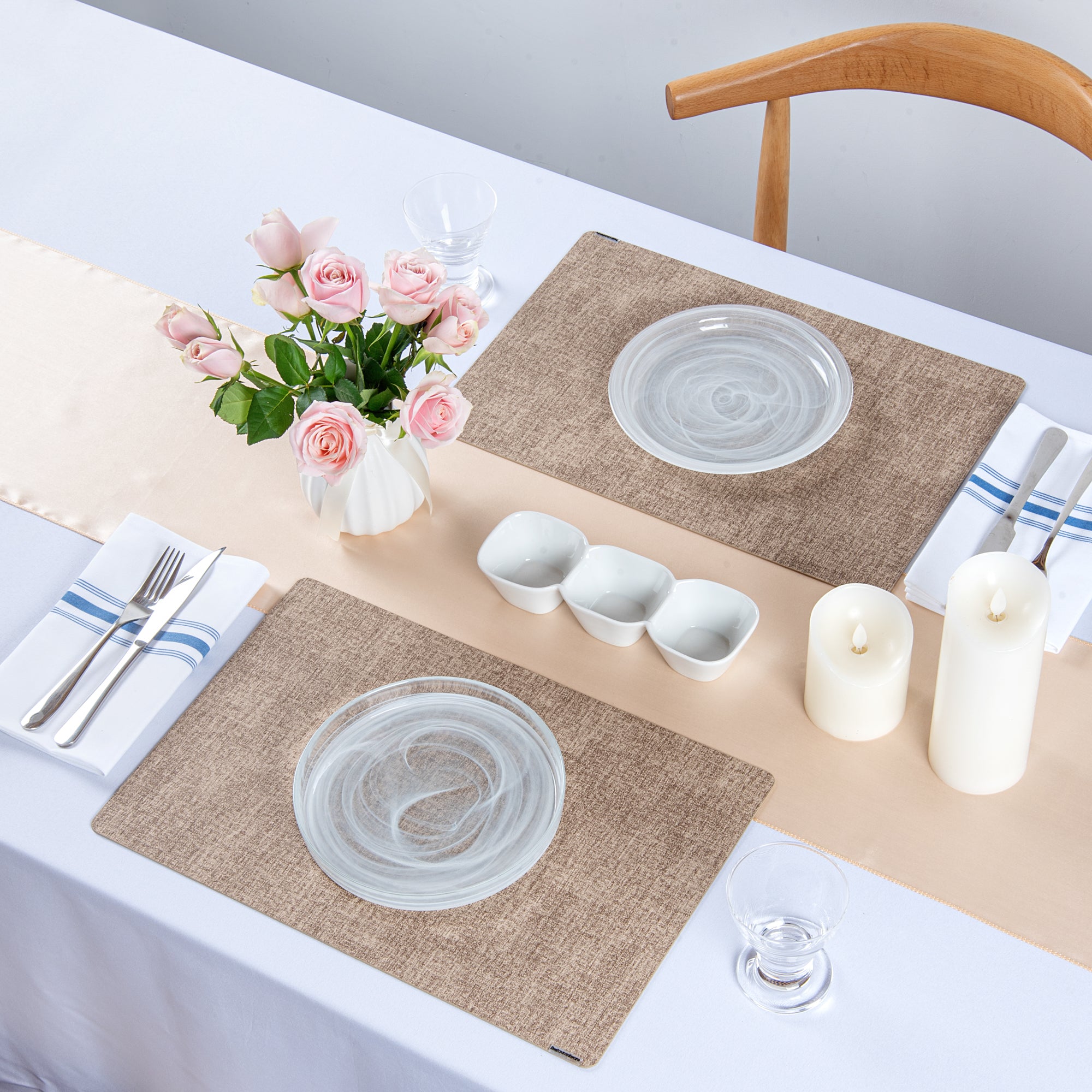 Enhance your dining experience with sophisticated tablescapes. Our Denim Mesh Linen-Feel Placemats boast a refined linen-feel design, instantly elevating any dining setting with a touch of elegance. These vinyl placemats are expertly crafted with an edge-wrapping process that prevents fraying and maintains their shape over time, ensuring long-lasting durability in a bustling restaurant setting. Made from premium vinyl, these plastic placemats are grease-proof, hot food friendly, and allow for effortless cleaning with just a damp cloth, making them an ideal choice for high-turnover foodservice establishments. Measuring 17.7 inches in length and 11.8 inches in width, these dining table mats provide ample coverage for plates and cutlery, while their beige color complements a wide range of decor styles. Invest in these mats to enhance your tabletop presentation and streamline clean-up. Each order includes 6 Denim Mesh Linen-Feel Placemats.
