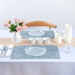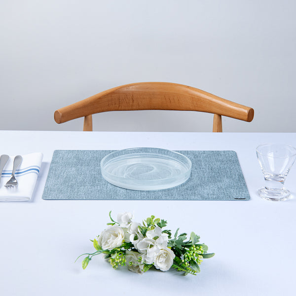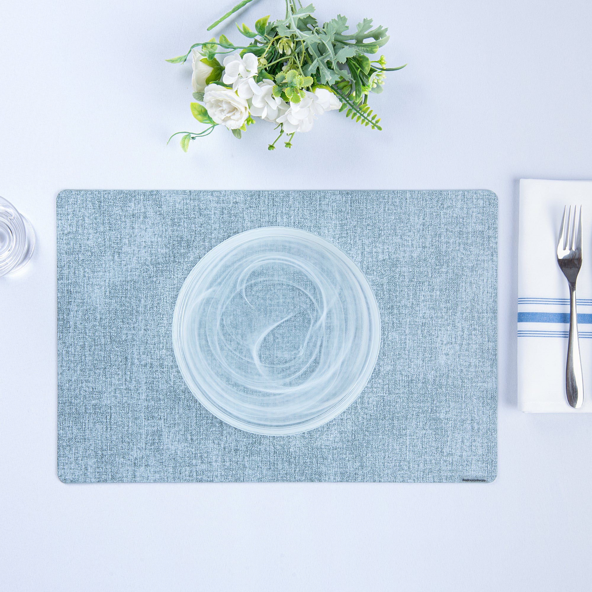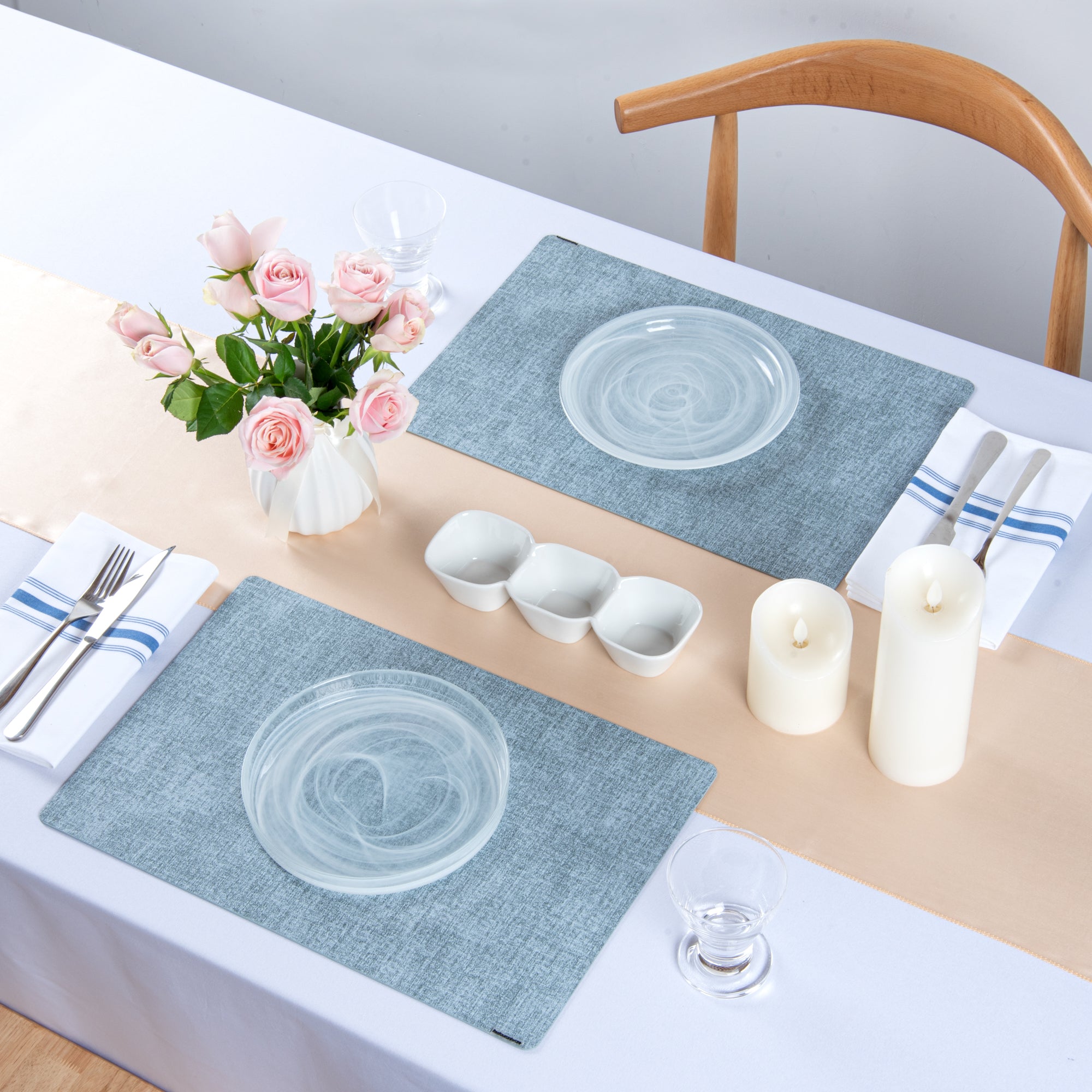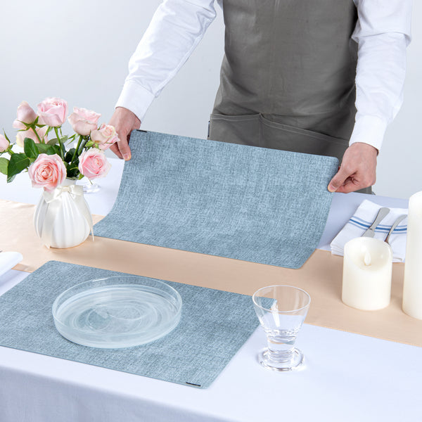 Enhance your dining experience with sophisticated table settings. The Denim Mesh Linen-Feel Vinyl Placemat combines a luxurious linen-feel design with a practical edge wrapping process to prevent fraying, ensuring your tablescapes maintain their elegance over time. Measuring 17.7 inches by 11.8 inches, this blue table mat is crafted from premium vinyl, providing a durable and greaseproof surface that is both cold and hot food friendly. Its easy-clean feature allows you to simply wipe it with a damp cloth, minimizing maintenance time and keeping your placemats looking pristine. This versatile vinyl placemat is perfect for restaurants and catering events that value both style and functionality. Add a touch of class with this easy-clean placemat and impress your guests with impeccable presentation. Each order includes 6 Denim Mesh Linen-Feel Vinyl Placemats.