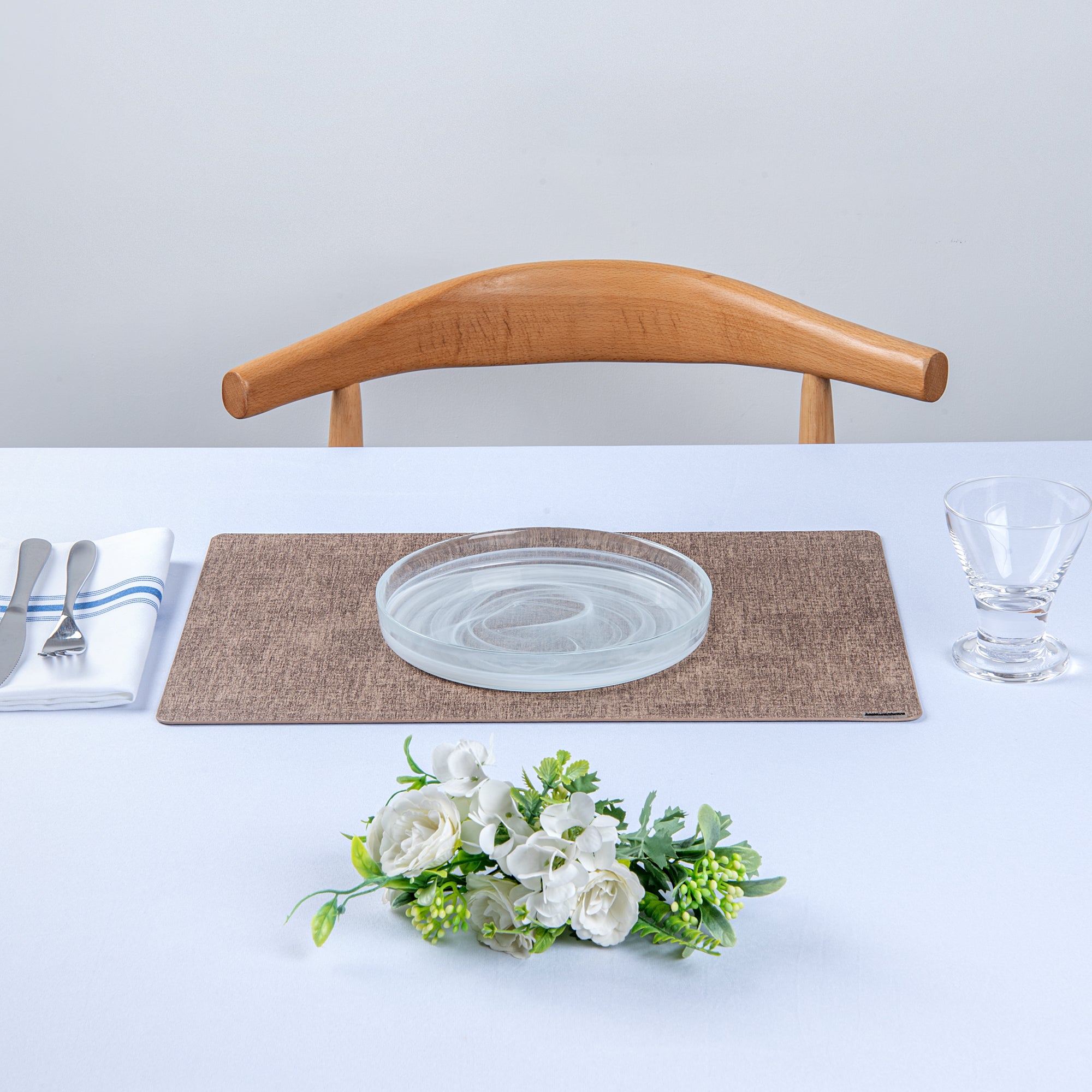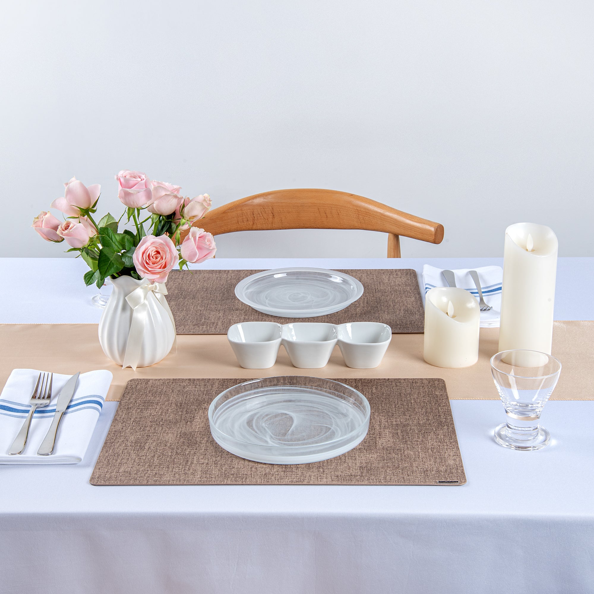 - Linen-feel design adds sophistication to tablescapes
