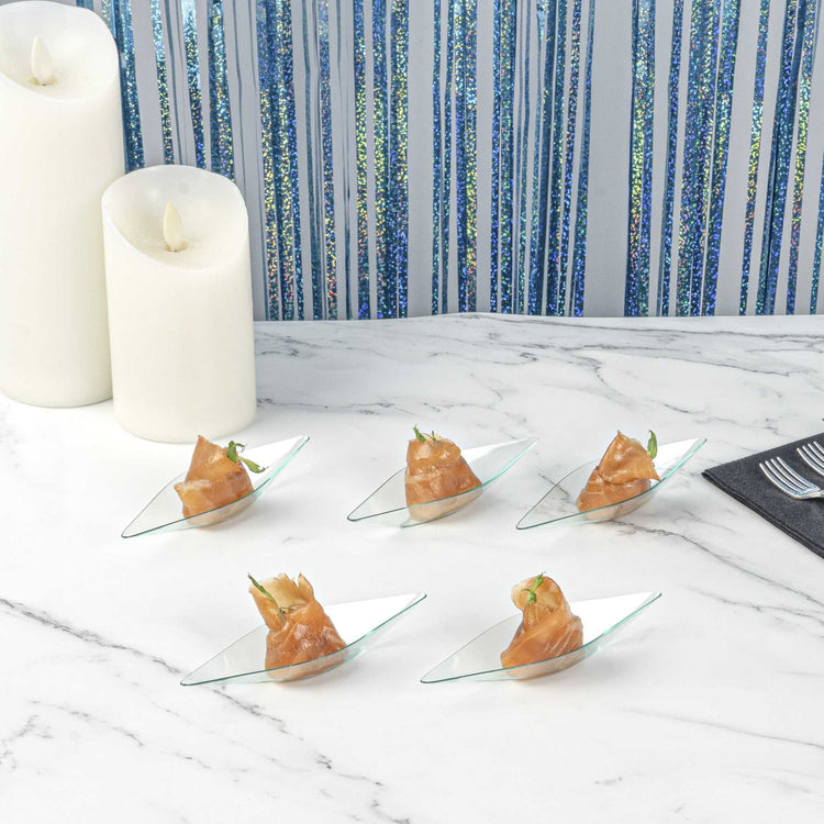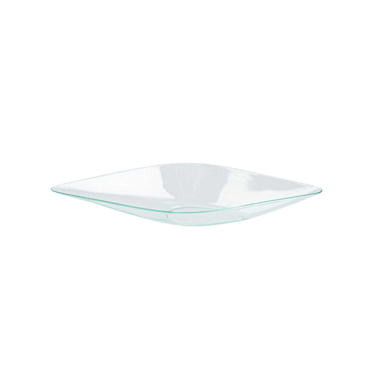Add an exceptional touch to your snack service with our Mini Serve Diamond Seagreen Plastic Canoe Dishes. Designed for serving fruit, sauce, shrimp, or other small snack portions, these tiny plastic bowls offer a delightful alternative to conventional plastic dinnerware. Crafted from premium plastic, these modern mini canoe dishes are built to last. Made from plastic, they serve as the perfect sustainable choice for your foodservice venue. Present nuts or bite-sized cold appetizers stylishly in these food canoes, making your culinary display truly stand out. The disposable nature of these mini food vessels ensures efficient cleanup after events. Boasting a chic and transparent seagreen finish, these plastic canoes elevate each serving with a touch of modern sophistication. Each petite dish measures 5 inches in length by 1.5 inches in width and holds up to 1 ounce. Sold in a 100 count box.