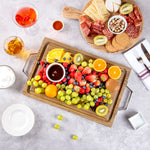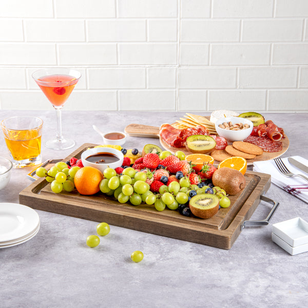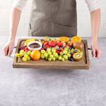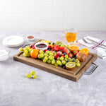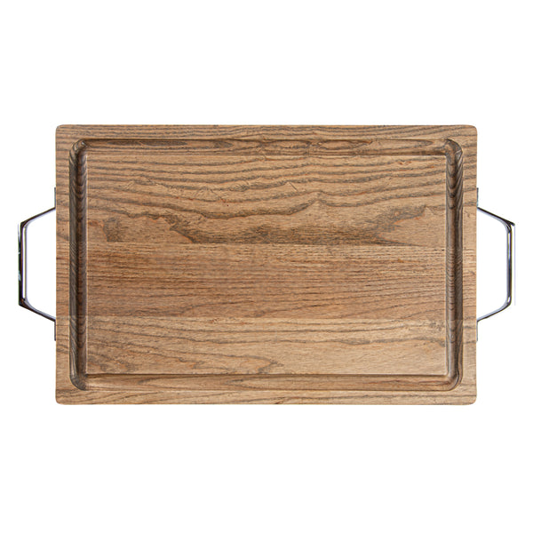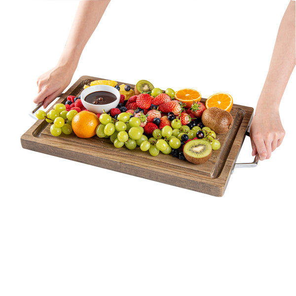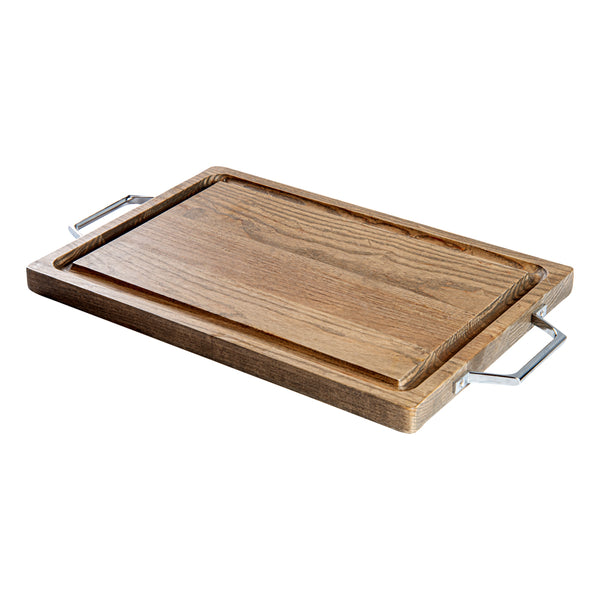 Use our Eco Display Campagna Small Serving and Cutting Board to easily accomplish your prep work or to bring a rustic touch to your serveware. Made from premium pieces of platinum ash wood, this unique tray can be used as a decorative serving tray or a heavy-duty carving board. Its sturdy wooden construction provides a stable base for carving meats and poultry, while its built-in handles make it effortless to pick up and carry your prepared foods. Featuring high-shine chrome hardware, this serving board is an excellent serving dish for parties, banquets, weddings, and other upscale catered events. Each of these ash wood serving boards measures 21.5 inches long by 12 inches wide. Shipped in a 1 count box.