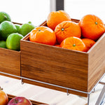 Prevent clutter on your tables and countertops with our Eco Display Natural Bamboo Condiment Rack Deep Box. Equipped with high walls and a square design, this holder box expertly contains a sizeable amount of straws, cocktail napkins, condiments, or stirrers. The inside of this square wooden box is deep for more storage. Constructed from eco-friendly bamboo, this napkin box holder is chip-resistant and shatterproof for long-lasting commercial use. Featuring a natural woodgrain finish, this bamboo storage tray gives your hotel, restaurant, and catered events a sophisticated touch. With a smooth and sleek surface, this wooden organizer tray can be easily wiped down and requires less energy than scrubbing or brushing. This wooden organizer box measures 7 inches in length and 4.75 inches in height. Place this condiment holder box and a couple more boxes on our coordinating rack frames to create a 3-tiered condiment holder. Sold in a 1 count box. Rack (SKU: RWT0602) is available and sold separately.