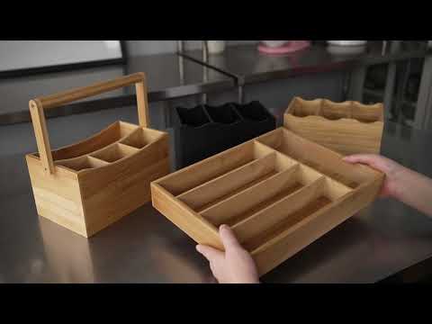 Take your silverware anywhere with our Eco Display Natural Bamboo Flatware Holder. Equipped with a handle, this silverware caddy provides secure and easy transportation of your flatware to any event. The handle of this flatware holder also folds backs to give your customers unobstructed access to utensils and napkins. This wooden utensil caddy is built with three square slots that efficiently organize your establishment's spoons, forks, and knives. The fourth rectangular slot of this silverware organizer has enough space to contain napkins, condiments, or small plates. Crafted from durable bamboo, this napkin and silverware holder is shatterproof and chip-resistant to maintain its high-quality look for long-lasting use. Designed with a natural wood grain finish, this stylish utensil caddy complements the settings at your catered luncheon, corporate event, food stand, or restaurant. The three square slots of this portable flatware organizer measure 2.5 inches in length and 2.5 inches in width, while the rectangular slot measures 7.5 inches in length and 2.5 inches in width. Ships in a 1 count box.