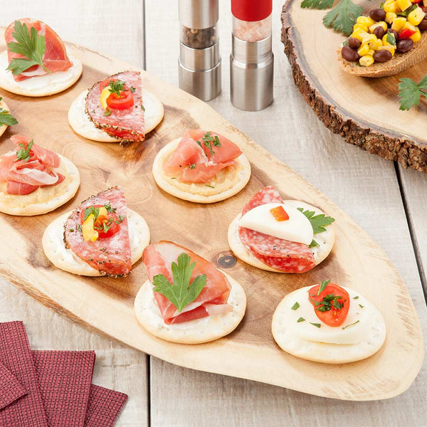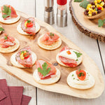 Bring a rustic touch to your serveware with this Eco Display Oblong Acacia Wood Serving Board! Designed with a natural bark trim, this wooden serving plank looks great included in earthy tablescapes or elegant centerpieces. This unique serving dish is quite large and features a rustic-inspired oblong shape that's perfect for presenting a selection of miniature appetizers or an assortment of aged cheeses. Crafted from all-natural acacia wood, this rustic serving platter is built to be long-lasting, durable, and beautiful. Ideal for restaurants, cafes, and catering companies, each of these serving boards is finished with an attractive food-safe varnish. This wooden serving board measures 20 inches long by 8 inches wide. Shipped in a 1 count box.