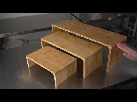 Enhance your food presentation with our Eco Display Rectangle Natural Bamboo Display Stand. Featuring three different sizes of food display stands, this premium set of buffet risers and stands can be used to create customized centerpieces, appetizer trays, or dessert displays. Crafted from bamboo, this display stand is built to hold a variety of hot and cold dishes, making it an adaptable choice for any foodservice setting. With bamboo's earthy, beautiful finish, these wooden food display stands are sure to add a touch of sophistication to any setting. With dimensions of 12 inches long by 8 inches wide by 4 inches in height (small),18 inches long by 8 inches wide by 6 inches tall (medium), and 24 inches long by 8 inches wide by 8 inches tall (large), this versatile stand is perfect for arranging appetizers, desserts, and other treats at a bakery, food truck, or catering event. Shipped in a 1 count box.