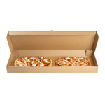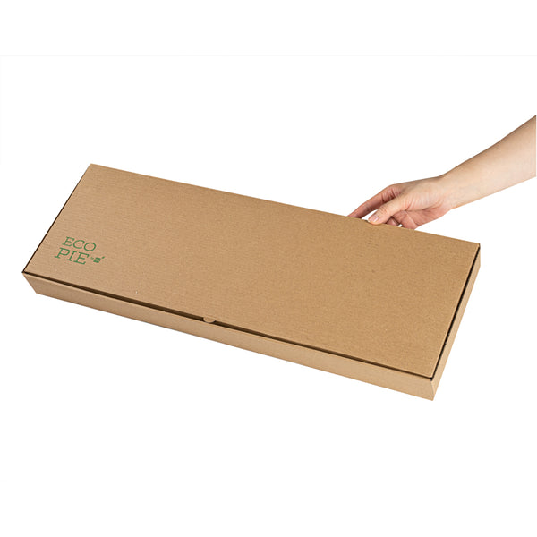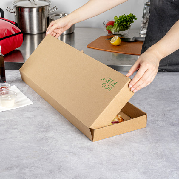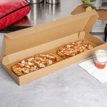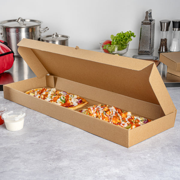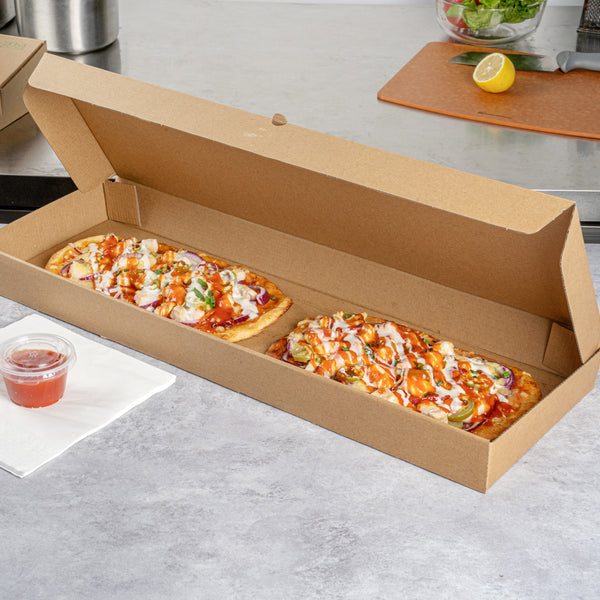 Pack rectangle pizzas or flatbreads using our eco-conscious Kraft and Green Paper Corrugated Flatbread Boxes. Constructed with high-quality kraft paper and E-Flute thickness, these boxes for food provide sturdiness and lasting use. The grease-resistant design of these flatbread boxes ensures oily and saucy substances won't seep through. With a 3-layered structure, these corrugated food boxes enable customers to transport heavy pizzas with multiple toppings spill-free. The front-flap and tab-lock system of these take out pizza boxes securely encloses your food during transit, while ventilation spaces maintain freshness and prevent sogginess. Sporting a kraft finish, these corrugated flatbread boxes present an appealing aesthetic for take out orders. Measuring 24 inches in length by 12 inches in width by 2 inches in height, these green pizza boxes are designed for compact storage. Sold in a 50 count box.