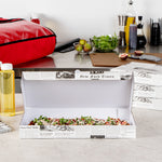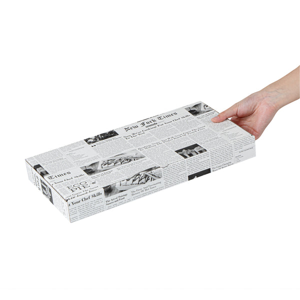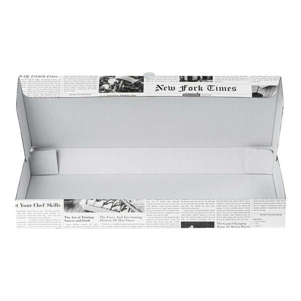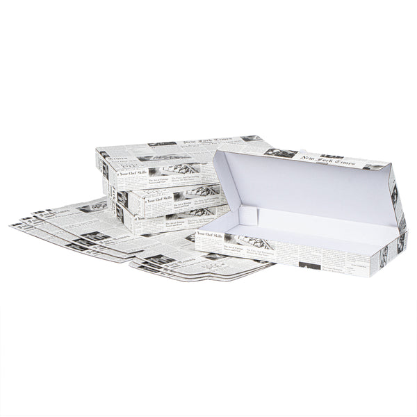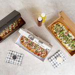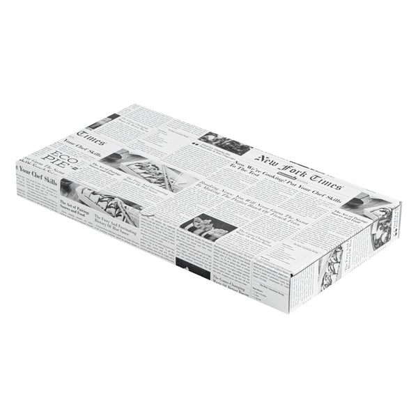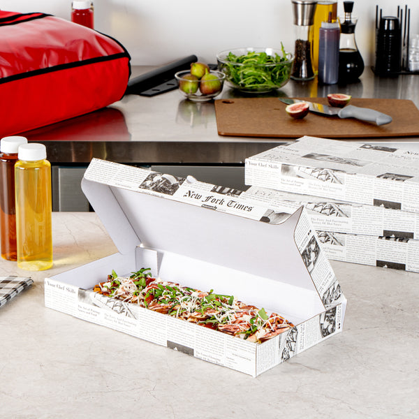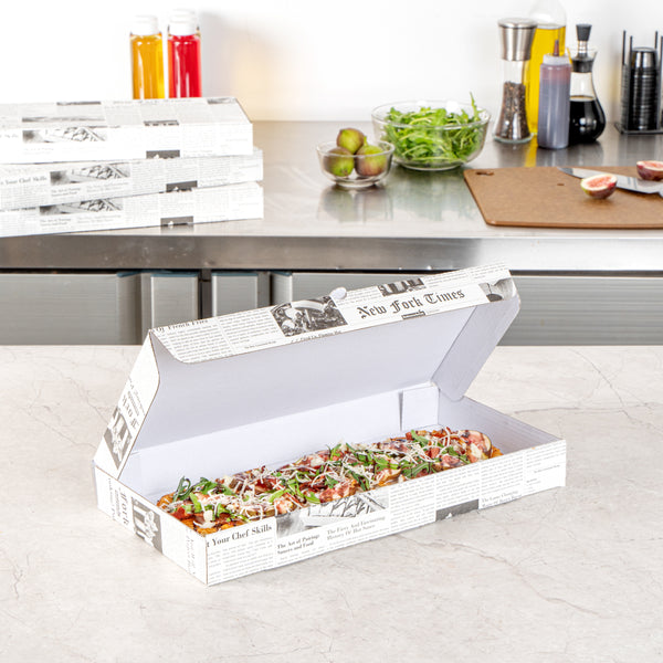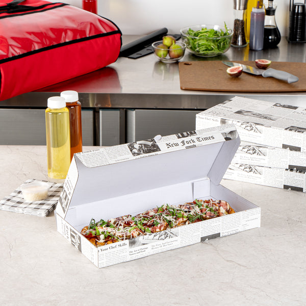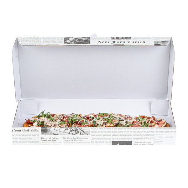 Ensure secure transport with the Eco Pie Tab-Lock Small Pizza Box. Crafted from durable corrugated paperboard, this small pizza box provides the necessary sturdy support to safeguard flatbreads during delivery, maintaining their perfect presentation. The innovative E-flute design of this rectangular pizza box ensures that the contents remain intact throughout transit, offering peace of mind to pizzerias and restaurants. Its convenient tab-lock slot securely closes the box, preventing accidental openings and ensuring your pizzas and flatbreads arrive in pristine condition. Measuring 14 inches by 7 inches by 1.5 inches, this flatbread takeout box accommodates a variety of flatbread sizes, enhancing menu versatility. The newsprint and white design adds a classic touch to your packaging, elevating the visual appeal of your offerings. Each order includes 50 Eco Pie Tab-Lock Small Pizza Box.