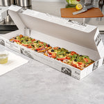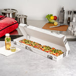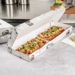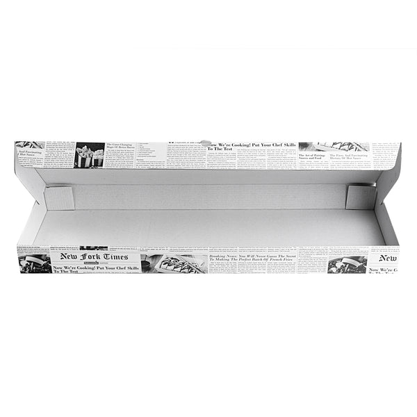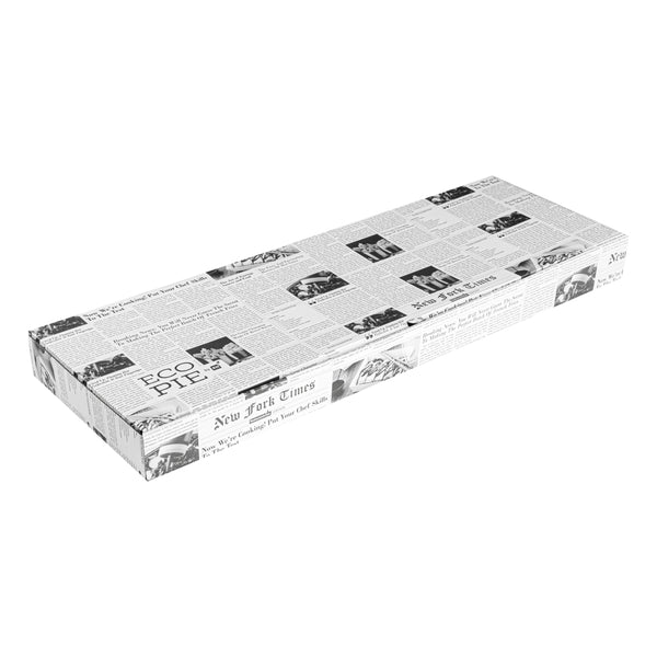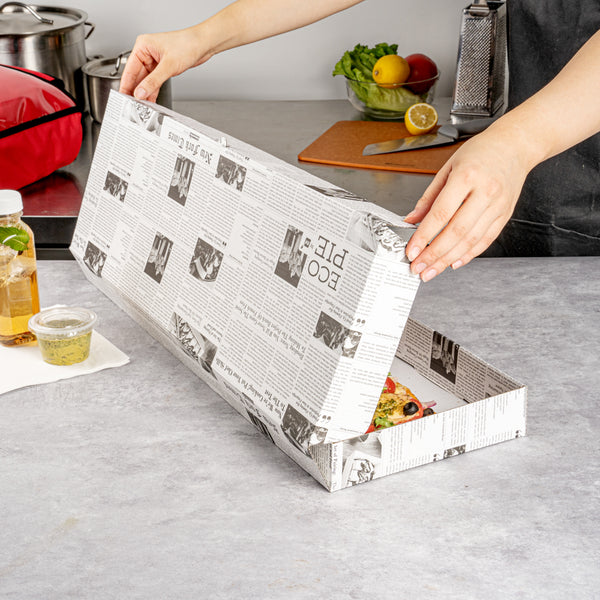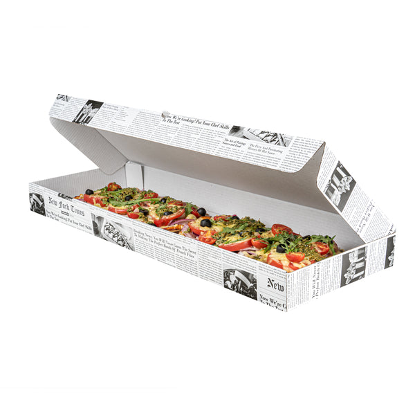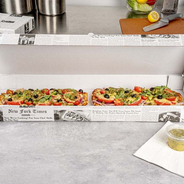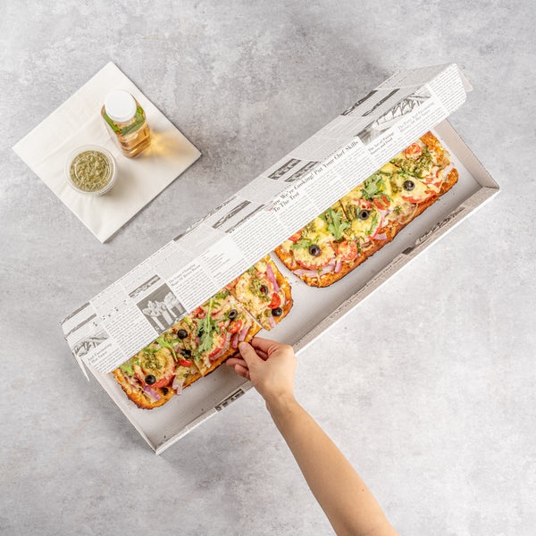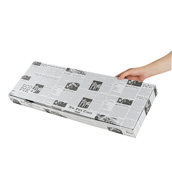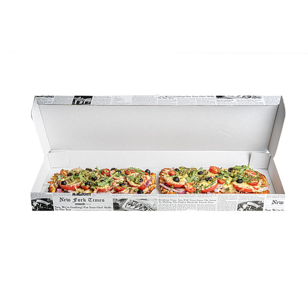 Use our unique Newsprint and White Paper Corrugated Flatbread Boxes to package take out or delivery orders. Manufactured from premium newsprint paper and E-Flute construction, these pizza boxes ensure sturdiness and longevity. With a grease-resistant design, these large flatbread boxes effectively stop oily and saucy substances from leaking through and creating messes. The 3-layered composition of these food boxes allows customers to carry weighty pizzas with multiple toppings without any spillage. These pizza boxes have a front-flap and tab-lock system that guarantees secure food transportation, and ventilation spaces maintain crispiness while preventing sogginess. Featuring a newsprint exterior and white interior, these corrugated pizza boxes bring a one-of-a-kind look to your pizzas, flatbreads, and other meals. Measuring 24 inches in length by 12 inches in width by 1.5 inches in height, these newsprint pizza boxes allow for efficient storage. Shipped in a 50 count box.