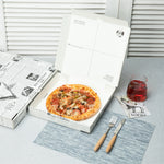 Pizzas will be hot off the press with our Eco Pie Newsprint and White Paper Corrugated Pizza Boxes. With dotted lines, these empty pizza boxes can be cut out into four plates for an economical solution to purchasing disposable plates. Designed with a newsprint finish, these corrugated pizza boxes are bound to make headlines at your catered event, restaurant, or pizzeria. Constructed from corrugated paper, these pizza delivery boxes are thick and sturdy to sustain the weight of multiple calzones. These pizza boxes are greaseproof to keep unsightly oily blotches from forming. Ideal for hot foods, these paper pizza boxes are microwave-safe for reheating take out orders. These printed pizza boxes are recyclable to dispose of boxes in an eco-friendly way. Great for speeding up your packaging process, these pizza boxes are shipped flat and are easy to fold together and assemble. These white pizza boxes measure 16.25 inches in length by 1.75 inches in height. Sold in a 50 count box.