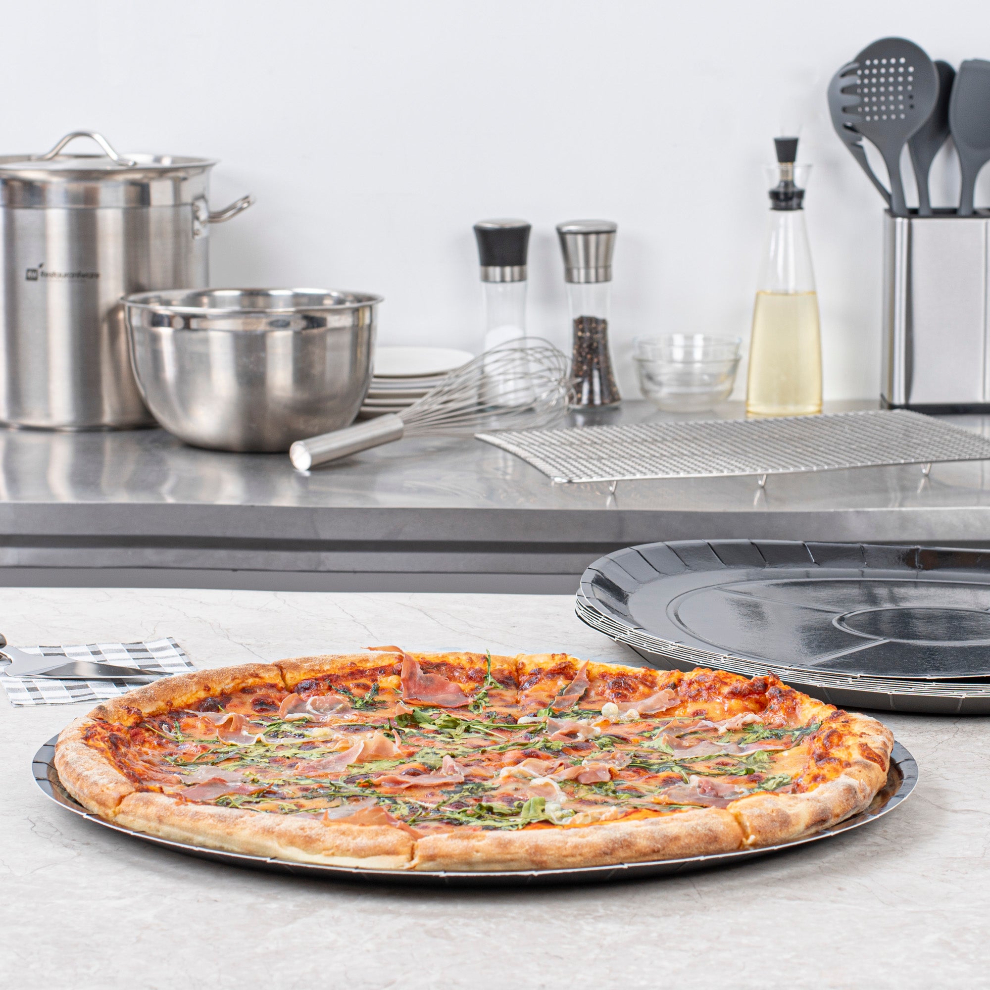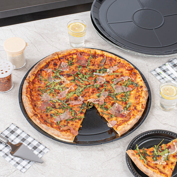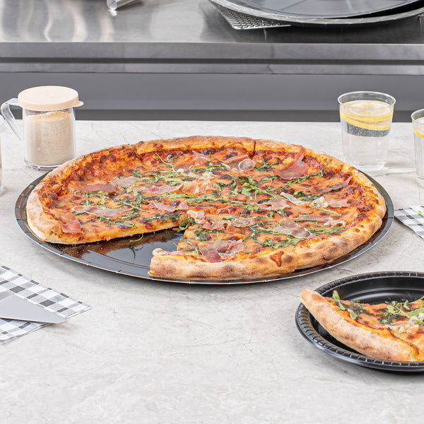 Present your delectable pizzas with style and ease using our Eco Pie Round Black Paperboard Pizza Trays. Crafted from sturdy paperboard, these durable pizza trays provide a secure serving platform for your pizzas. The microwavable feature of these black paper pizza trays adds convenience, keeping your pizzas warm and flavorful. Without the addition of PFAs, these recyclable paper trays prioritize health-conscious choices for your customers. Perfect for baking and serving freshly baked pies, these oven-safe trays offer versatility to meet the demands of your pizzeria. The greaseproof CPET coating on these disposable pizza trays avoids greasy residue, upholding a clean and professional service. With these freezer-safe pizza trays, you can keep your leftovers for later enjoyment. Tailored for quick foodservice establishments, these disposable trays simplify the cleanup process. The elegant black color and round shape of these paper pizza pans introduce a rustic and visually appealing touch to your orders. Specifically designed for large pizzas, these paper pizza pans measure 18 inches in diameter, providing an ideal canvas for showcasing your pizza creations. Sold in a 25 count box.