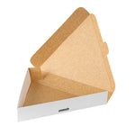 Ensure flawless delivery with our Eco Pie White Paper Pizza Slice Box. The White Greaseproof Pizza Slice Box features a clamshell design with a convenient tab lock, securing pizza slices during transit with ease. Crafted from durable paper, this clamshell pizza box maintains its structure under the weight of hot, fresh pizza, enhancing reliability for pizzerias and food trucks alike. The greaseproof PE lining expertly contains oils and sauces, preventing leaks that compromise cleanliness, making it ideal for busy takeout services. Its dimensions of 9.25 inches by 10.25 inches by 1.75 inches provide ample space for standard pizza slices, ensuring a snug fit without crumpling edges. Designed as a disposable pizza box, it streamlines operations by eliminating the need for washing, reducing overhead costs effectively. Choose this solution for an eco-friendly, recyclable option that meets modern sustainability standards. Each order includes 100 White Greaseproof Pizza Slice Boxes.